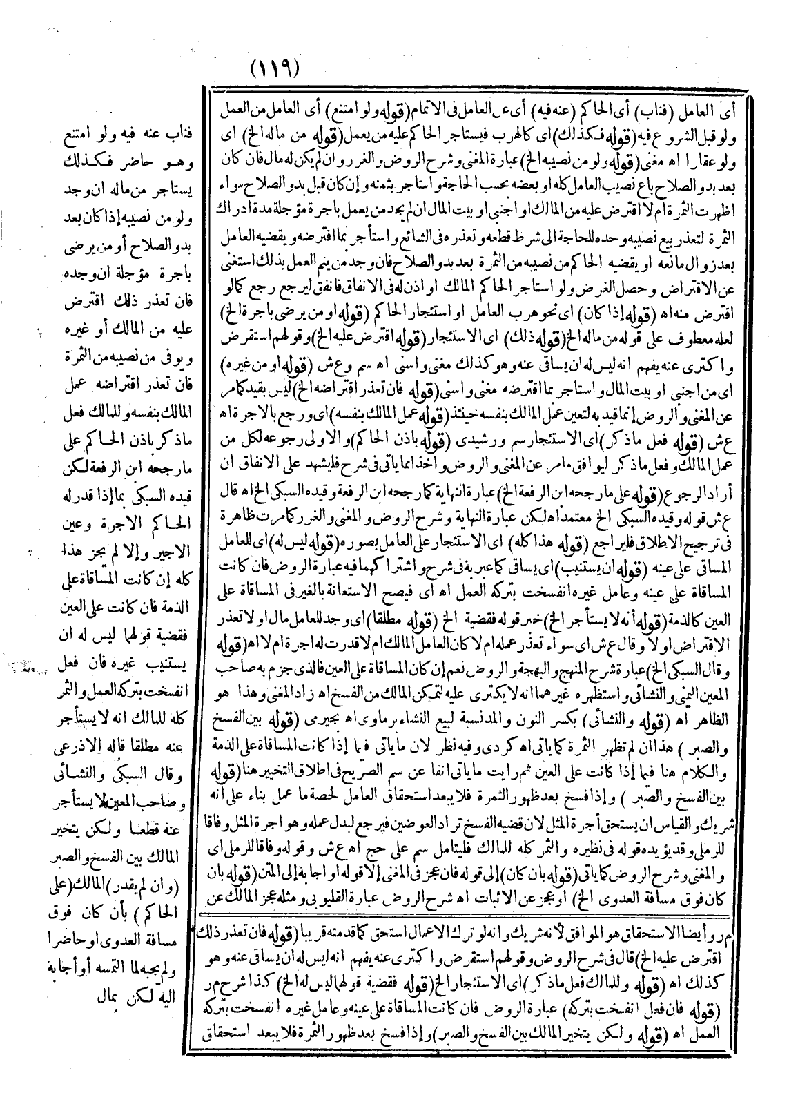 فَنَابَ عَنْهُ فِيهِ، وَلَوْ امْتَنَعَ وَهُوَ حَاضِرٌ فَكَذَلِكَ يَسْتَأْجِرُ مِنْ مَالِكٍ إنْ وُجِدَ وَلَوْ مِنْ نَصِيبِهِ إذَا كَانَ بَعْدَ بُدُوِّ الصَّلَاحِ أَوْ مَنْ يَرْضَى بِأُجْرَةٍ مُؤَجَّلَةٍ إنْ وَجَدَهُ فَإِنْ تَعَذَّرَ ذَلِكَ افْتَرَضَ عَلَيْهِ مِنْ الْمَالِكِ أَوْ غَيْرِهِ وَيُوَفِّي مِنْ نَصِيبِهِ مِنْ الثَّمَرَةِ فَإِنْ تَعَذَّرَ افْتِرَاضُهُ عَمِلَ الْمَالِكُ بِنَفْسِهِ وَلِلْمَالِكِ فِعْلُ مَا ذُكِرَ بِإِذْنِ الْحَاكِمِ عَلَى مَا رَجَّحَهُ ابْنُ الرِّفْعَةِ، لَكِنْ قَيَّدَهُ السُّبْكِيُّ بِمَا إذَا قَدَّرَ لَهُ الْحَاكِمُ الْأُجْرَةَ وَعَيَّنَ الْأَجِيرَ وَإِلَّا لَمْ يَجُزْ هَذَا كُلُّهُ إنْ كَانَتْ الْمُسَاقَاةُ عَلَى الذِّمَّةِ فَإِنْ كَانَتْ عَلَى الْعَيْنِ فَقَضِيَّةُ قَوْلِهِمَا لَيْسَ لَهُ أَنْ يَسْتَنِيبَ غَيْرَهُ فَإِنْ فَعَلَ انْفَسَخَتْ بِتَرْكِهِ الْعَمَلَ وَالثَّمَرُ كُلُّهُ لِلْمَالِكِ أَنَّهُ لَا يَسْتَأْجِرُ عَنْهُ مُطْلَقًا قَالَهُ الْأَذْرَعِيُّ وَقَالَ السُّبْكِيُّ وَالنَّشَائِيُّ وَصَاحِبُ الْمُعِينِ لَا يَسْتَأْجِرُ عَنْهُ قَطْعًا، وَلَكِنْ يَتَخَيَّرُ الْمَالِكُ بَيْنَ الْفَسْخِ وَالصَّبْرِ