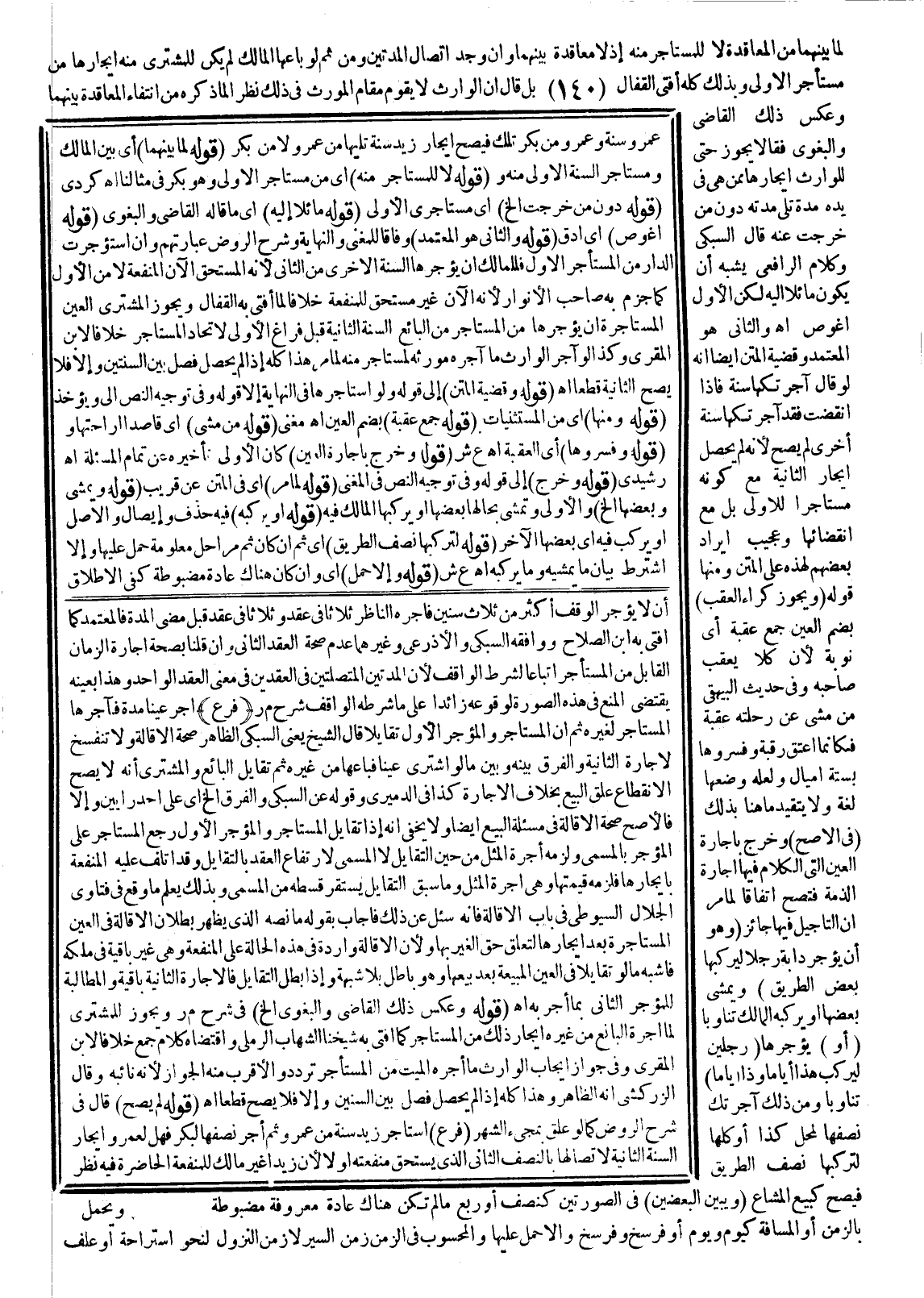 لِمَا بَيْنَهُمَا مِنْ الْمُعَاقَدَةِ لَا لِلْمُسْتَأْجِرِ مِنْهُ إذْ لَا مُعَاقَدَةَ بَيْنَهُمَا وَإِنْ وُجِدَ اتِّصَالُ الْمُدَّتَيْنِ وَمِنْ ثَمَّ لَوْ بَاعَهَا الْمَالِكُ لَمْ يَكُنْ لِلْمُشْتَرِي مِنْهُ إيجَارُهَا مِنْ مُسْتَأْجِرِ الْأُولَى وَبِذَلِكَ كُلِّهِ أَفْتَى الْقَفَّالُ بَلْ قَالَ إنَّ الْوَارِثَ لَا يَقُومُ مَقَامَ الْمُوَرِّثِ فِي ذَلِكَ نَظَرًا لِمَا ذَكَرَهُ مِنْ انْتِفَاءِ الْمُعَاقَدَةِ بَيْنَهُمَا وَعَكَسَ ذَلِكَ الْقَاضِي وَالْبَغَوِيُّ فَقَالَا يَجُوزُ حَتَّى لِلْوَارِثِ إيجَارُهَا مِمَّنْ هِيَ فِي يَدِهِ مُدَّةً تَلِي مُدَّتَهُ دُونَ مَنْ خَرَجَتْ عَنْهُ قَالَ السُّبْكِيُّ وَكَلَامُ الرَّافِعِيِّ يُشْبِهُ أَنْ يَكُونَ مَائِلًا إلَيْهِ، لَكِنْ الْأَوَّلُ أَعْوَصُ اهـ، وَالثَّانِي هُوَ الْمُعْتَمَدُ وَقَضِيَّةُ الْمَتْنِ أَيْضًا أَنَّهُ لَوْ قَالَ آجَرْتُكهَا سَنَةً فَإِذَا انْقَضَتْ فَقَدْ آجَرْتُكهَا سَنَةً أُخْرَى لَمْ يَصِحَّ؛ لِأَنَّهُ لَمْ يَحْصُلْ إيجَارُ الثَّانِيَةِ مَعَ كَوْنِهِ مُسْتَأْجِرًا لِلْأُولَى بَلْ مَعَ انْقِضَائِهَا وَعَجِيبٌ إيرَادُ بَعْضِهِمْ لِهَذِهِ عَلَى الْمَتْنِ وَمِنْهَا قَوْلُهُ