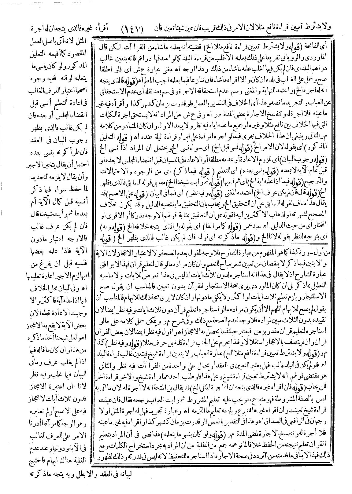 وَفِي ع ش هَلْ الْمُرَادُ أَنَّهُ لَا يَسْتَحِقُّ أُجْرَةَ الْكَلِمَاتِ الَّتِي فِيهَا الْخِلَافُ بَيْنَ نَافِعٍ مَثَلًا وَغَيْرِهِ أَوْ جَمِيعَ مَا عَلَّمَهُ إيَّاهُ فِيهِ نَظَرٌ وَلَا يَبْعُدُ الْأَوَّلُ وَإِنْ كَانَ الْمُتَبَادَرُ مِنْ كَلَامِهِ م ر الثَّانِيَ وَيَنْبَغِي أَنَّ هَذَا الْخِلَافَ يَجْرِي فِيمَا لَوْ آجَرَهُ لِقِرَاءَةٍ عَلَى قَبْرٍ أَوْ قِرَاءَةِ لَيْلَةٍ عِنْدَهُ اهـ.