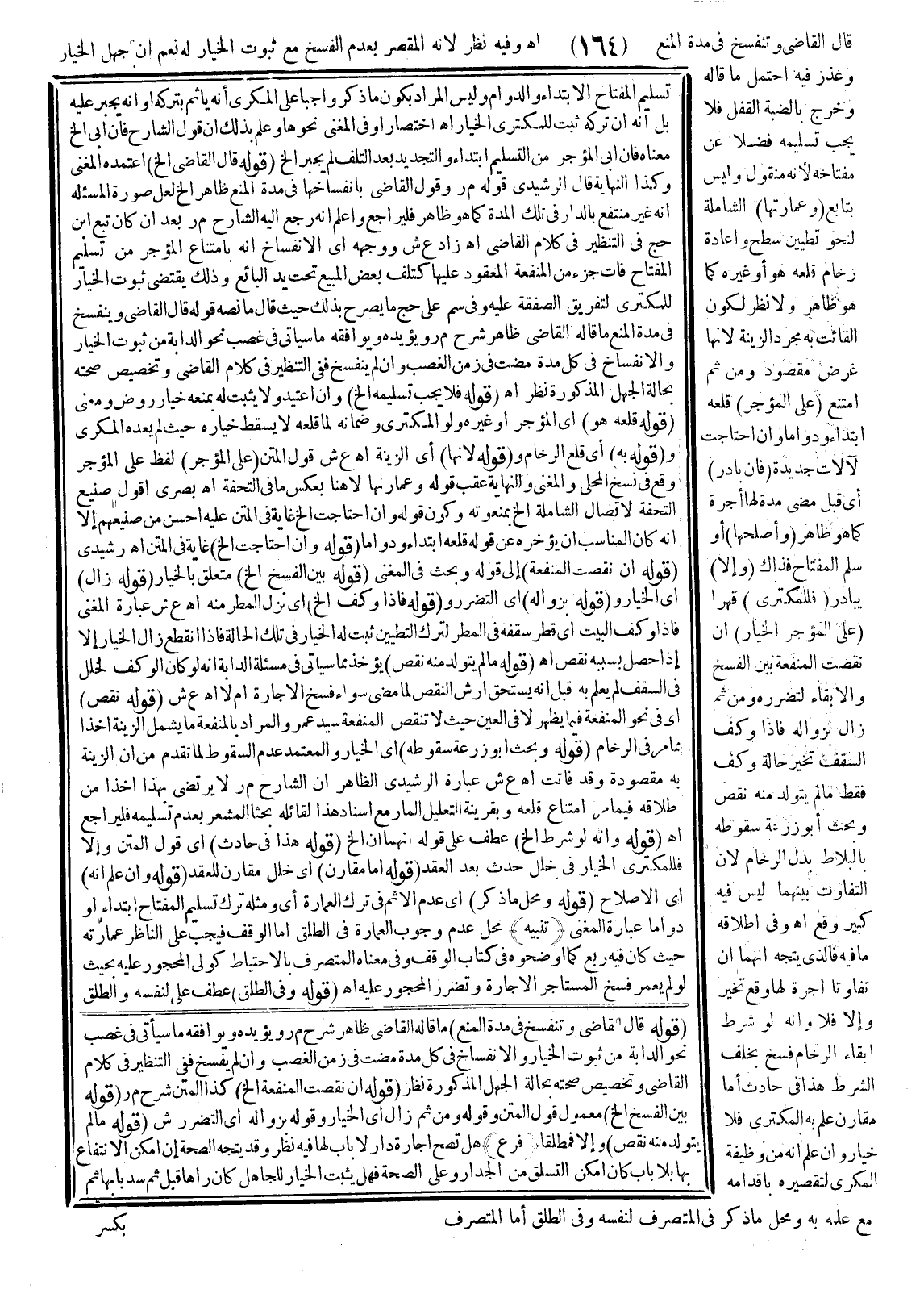 قَالَ الْقَاضِي وَتَنْفَسِخُ فِي مُدَّةِ الْمَنْعِ اهـ وَفِيهِ نَظَرٌ لِأَنَّهُ الْمُقَصِّرُ بِعَدَمِ الْفَسْخِ مَعَ ثُبُوتِ الْخِيَارِ لَهُ نَعَمْ إنْ جَهِلَ الْخِيَارَ وَعُذِرَ فِيهِ اُحْتُمِلَ مَا قَالَهُ وَخَرَجَ بِالضَّبَّةِ الْقُفْلُ فَلَا يَجِبُ تَسْلِيمُهُ فَضْلًا عَنْ مِفْتَاحِهِ لِأَنَّهُ مَنْقُولٌ وَلَيْسَ بِتَابِعٍ (وَعِمَارَتُهَا) الشَّامِلَةُ لِنَحْوِ تَطْيِينِ سَطْحٍ وَإِعَادَةِ رُخَامٍ قَلَعَهُ هُوَ أَوْ غَيْرُهُ كَمَا هُوَ ظَاهِرٌ وَلَا نَظَرَ لِكَوْنِ الْفَائِتِ بِهِ مُجَرَّدَ الزِّينَةِ؛ لِأَنَّهَا غَرَضٌ مَقْصُودٌ وَمِنْ ثَمَّ امْتَنَعَ (عَلَى الْمُؤَجِّرِ) قَلْعُهُ ابْتِدَاءً وَدَوَامًا وَإِنْ احْتَاجَتْ لِآلَاتٍ جَدِيدَةٍ (فَإِنْ بَادَرَ) أَيْ قَبْلَ مُضِيِّ مُدَّةٍ لَهَا أُجْرَةٌ كَمَا هُوَ ظَاهِرٌ
