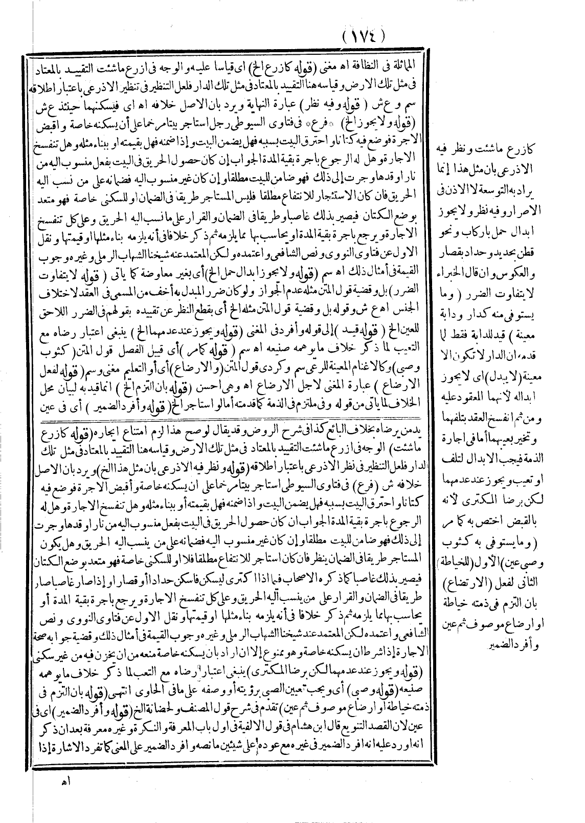 فِي فَتَاوَى السُّيُوطِيّ اسْتَأْجَرَ بَيْتًا مُرَخَّمًا عَلَى أَنْ يَسْكُنَهُ خَاصَّةً وَأَقْبَضَ الْأُجْرَةَ فَوَضَعَ فِيهِ كَتَّانًا وَاحْتَرَقَ الْبَيْتُ بِسَبَبِهِ فَهَلْ يَضْمَنُ الْبَيْتَ وَإِذَا ضَمِنَهُ فَهَلْ بِقِيمَتِهِ أَوْ بِبِنَاءِ مِثْلِهِ وَهَلْ تَنْفَسِخُ الْإِجَارَةُ وَهَلْ لَهُ الرُّجُوعُ بِأُجْرَةِ بَقِيَّةِ الْمُدَّةِ الْجَوَابُ إنْ كَانَ حُصُولُ الْحَرِيقِ فِي الْبَيْتِ بِفِعْلٍ مَنْسُوبٍ إلَيْهِ مِنْ نَارٍ أَوْقَدَهَا وَجَرَتْ إلَى ذَلِكَ فَهُوَ ضَامِنٌ لِلْبَيْتِ مُطْلَقًا، وَإِنْ كَانَ غَيْرَ مَنْسُوبٍ إلَيْهِ فَضَمَانُهُ عَلَى مَنْ يُنْسَبُ إلَيْهِ الْحَرِيقُ وَهَلْ يَكُونُ الْمُسْتَأْجِرُ طَرِيقًا فِي الضَّمَانِ يُنْظَرُ فَإِنْ كَانَ اسْتَأْجَرَ لِلِانْتِفَاعِ مُطْلَقًا فَلَا أَوْ لِلسُّكْنَى خَاصَّةً فَهُوَ مُتَعَدٍّ بِوَضْعِ الْكَتَّانِ فَيَصِيرُ بِذَلِكَ غَاصِبًا كَمَا ذَكَرَهُ الْأَصْحَابُ فِيمَا إذَا اكْتَرَى لِيَسْكُنَ فَأَسْكَنَ حَدَّادًا أَوْ قَصَّارًا وَإِذَا صَارَ غَاصِبًا صَارَ طَرِيقًا فِي الضَّمَانِ وَالْقَرَارُ عَلَى مَنْ يُنْسَبُ إلَيْهِ الْحَرِيقُ وَعَلَى كُلٍّ تَنْفَسِخُ الْإِجَارَةُ وَيَرْجِعُ بِأُجْرَةِ بَقِيَّةِ الْمُدَّةِ أَوْ يُحَاسَبُ بِهَا مِمَّا يَلْزَمُهُ ثُمَّ ذَكَرَ خِلَافًا فِي أَنَّهُ يَلْزَمُهُ بِنَاءُ مِثْلِهَا أَوْ قِيمَتُهَا وَنَقَلَ الْأَوَّلَ عَنْ فَتَاوَى النَّوَوِيِّ وَنَصِّ الشَّافِعِيِّ وَاعْتَمَدَهُ لَكِنَّ الْمُعْتَمَدَ عِنْدَ شَيْخِنَا الشِّهَابِ الرَّمْلِيِّ وَغَيْرِهِ وُجُوبُ الْقِيمَةِ فِي أَمْثَالِ ذَلِكَ