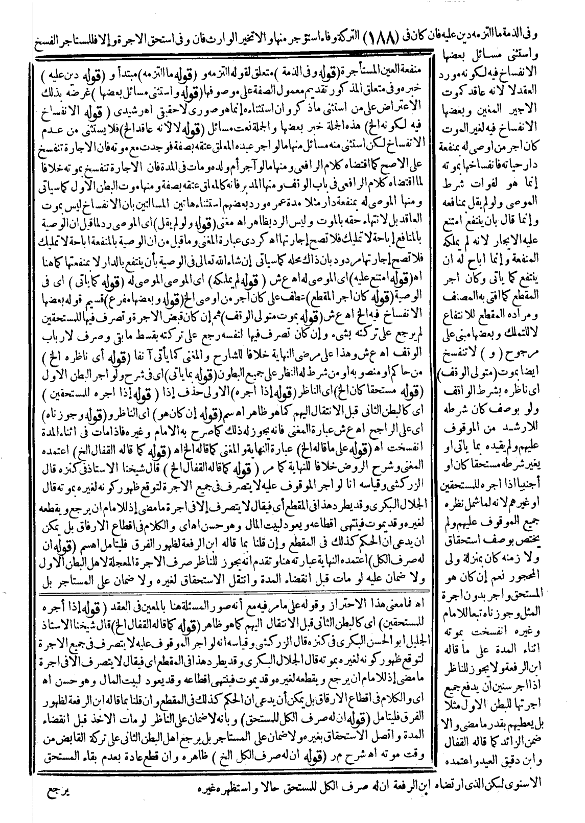ـــــــــــــــــــــــــــــQمَنْفَعَةُ الْعَيْنِ الْمُسْتَأْجَرَةِ (قَوْلُهُ وَفِي الذِّمَّةِ) مُتَعَلِّقٌ لِقَوْلِهِ الْتَزَمَهُ وَ (قَوْلُهُ مَا الْتَزَمَهُ) مُبْتَدَأٌ وَ (قَوْلُهُ دَيْنٌ عَلَيْهِ) خَبَرُهُ وَفِي التَّعَلُّقِ الْمَذْكُورِ تَقْدِيمُ مَعْمُولِ الصِّفَةِ عَلَى مَوْصُوفِهَا (قَوْلُهُ وَاسْتَثْنَى مَسَائِلَ بَعْضُهَا إلَخْ) غَرَضُهُ بِذَلِكَ الِاعْتِرَاضُ عَلَى مَنْ اسْتَثْنَى مَا ذُكِرَ وَأَنَّ اسْتِثْنَاءَهُ إنَّمَا هُوَ صُورِيٌّ لَا حَقِيقِيٌّ اهـ رَشِيدِيٌّ (قَوْلُهُ الِانْفِسَاخُ فِيهِ لِكَوْنِهِ إلَخْ) هَذِهِ الْجُمْلَةُ خَبَرُ بَعْضِهَا وَالْجُمْلَةُ نَعْتُ مَسَائِلَ (قَوْلُهُ لَا لِأَنَّهُ عَاقِدٌ إلَخْ) فَلَا يُسْتَثْنَى مِنْ عَدَمِ الِانْفِسَاخِ لَكِنْ اُسْتُثْنِيَ مِنْهُ مَسَائِلُ مِنْهَا مَا لَوْ آجَرَ عَبْدَهُ الْمُعَلَّقَ عِتْقُهُ بِصِفَةٍ فَوُجِدَتْ مَعَ مَوْتِهِ فَإِنَّ الْإِجَارَةَ تَنْفَسِخُ عَلَى الْأَصَحِّ كَمَا اقْتَضَاهُ كَلَامُ الرَّافِعِيِّ فِي بَابِ الْوَقْفِ وَمِنْهَا الْمُدَبَّرُ فَإِنَّهُ كَالْمُعَلَّقِ عِتْقُهُ بِصِفَةٍ وَمِنْهَا مَوْتُ الْبَطْنِ الْأَوَّلِ كَمَا سَيَأْتِي وَمِنْهَا الْمُوصَى لَهُ بِمَنْفَعَةِ دَارٍ مَثَلًا مُدَّةَ عُمُرِهِ وَرَدَّ بَعْضُهُمْ اسْتِثْنَاءَ هَاتَيْنِ الْمَسْأَلَتَيْنِ بِأَنَّ الِانْفِسَاخَ لَيْسَ بِمَوْتِ الْعَاقِدِ بَلْ لِانْتِهَاءِ حَقِّهِ بِالْمَوْتِ وَلَيْسَ الرَّدُّ بِظَاهِرٍ اهـ مُغْنِي (قَوْلُهُ وَلَوْ لَمْ يَقُلْ) أَيْ الْمُوصِي رَدٌّ لِمَا قِيلَ إنَّ الْوَصِيَّةَ بِالْمَنَافِعِ إبَاحَةٌ لَا تَمْلِيكٌ فَلَا تَصِحُّ إجَارَتُهَا اهـ كُرْدِيٌّ عِبَارَةُ الْمُغْنِي وَمَا قِيلَ مِنْ أَنَّ الْوَصِيَّةَ بِالْمَنْفَعَةِ إبَاحَةٌ لَا تَمْلِيكٌ فَلَا تَصِحُّ إجَارَتُهَا مَرْدُودٌ بِأَنَّ ذَاكَ مَحَلُّهُ كَمَا سَيَأْتِي إنْ شَاءَ اللَّهُ تَعَالَى فِي الْوَصِيَّةِ بِأَنْ يَنْتَفِعَ بِالدَّارِ لَا بِمَنْفَعَتِهَا كَمَا هُنَا اهـ.