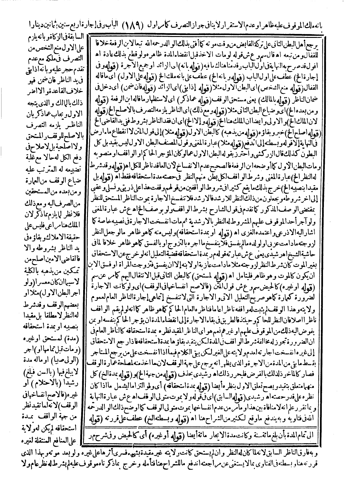 (وَلَوْ آجَرَ الْبَطْنُ الْأَوَّلُ) مَثَلًا أَوْ بَعْضُهُمْ الْوَقْفَ، وَقَدْ شُرِطَ لَهُ النَّظَرُ لَا مُطْلَقًا بَلْ مُقَيَّدًا بِنَصِيبِهِ أَوْ بِمُدَّةِ اسْتِحْقَاقِهِ (مُدَّةً) لِمُسْتَحِقٍّ أَوْ غَيْرِهِ (وَمَاتَ قَبْلَ تَمَامِهَا أَوْ) آجَرَ (الْوَلِيُّ صَبِيًّا) أَوْ مَالَهُ مُدَّةً لَا يَبْلُغُ فِيهَا (بِالسِّنِّ فَبَلَغَ) رَشِيدًا (بِالِاحْتِلَامِ) أَوْ غَيْرِهِ (فَالْأَصَحُّ انْفِسَاخُهَا فِي الْوَقْفِ) لِأَنَّهُ لَمَّا تَقَيَّدَ نَظَرٌ مِنْ جِهَةِ الْوَاقِفِ بِمُدَّةِ اسْتِحْقَاقِهِ لَمْ يَكُنْ لَهُ وِلَايَةٌ عَلَى الْمَنَافِعِ الْمُنْتَقِلَةِ لِغَيْرِهِ وَبِهِ فَارَقَ النَّاظِرَ السَّابِقَ؛ لِأَنَّهُ لَمَّا كَانَ لَهُ النَّظَرُ وَإِنْ لَمْ يَسْتَحِقَّ كَانَتْ وِلَايَتُهُ غَيْرَ مُقَيَّدَةٍ بِشَيْءٍ فَسَرَى أَثَرُهَا عَلَى غَيْرِهِ وَلَوْ بَعْدَ مَوْتِهِ وَبِهَذَا الَّذِي قَرَّرْتُهُ هُنَا وَبَسَطْتُهُ فِي الْفَتَاوَى بِمَا لَا يُسْتَغْنَى عَنْ مُرَاجَعَتِهِ انْدَفَعَ مَا لِلشُّرَّاحِ هُنَا فَتَأَمَّلْهُ وَخَرَجَ بِمَا ذَكَرْنَاهُ مَوْقُوفٌ عَلَيْهِ لَمْ يُشْرَطْ لَهُ نَظَرٌ عَامٌّ وَلَا