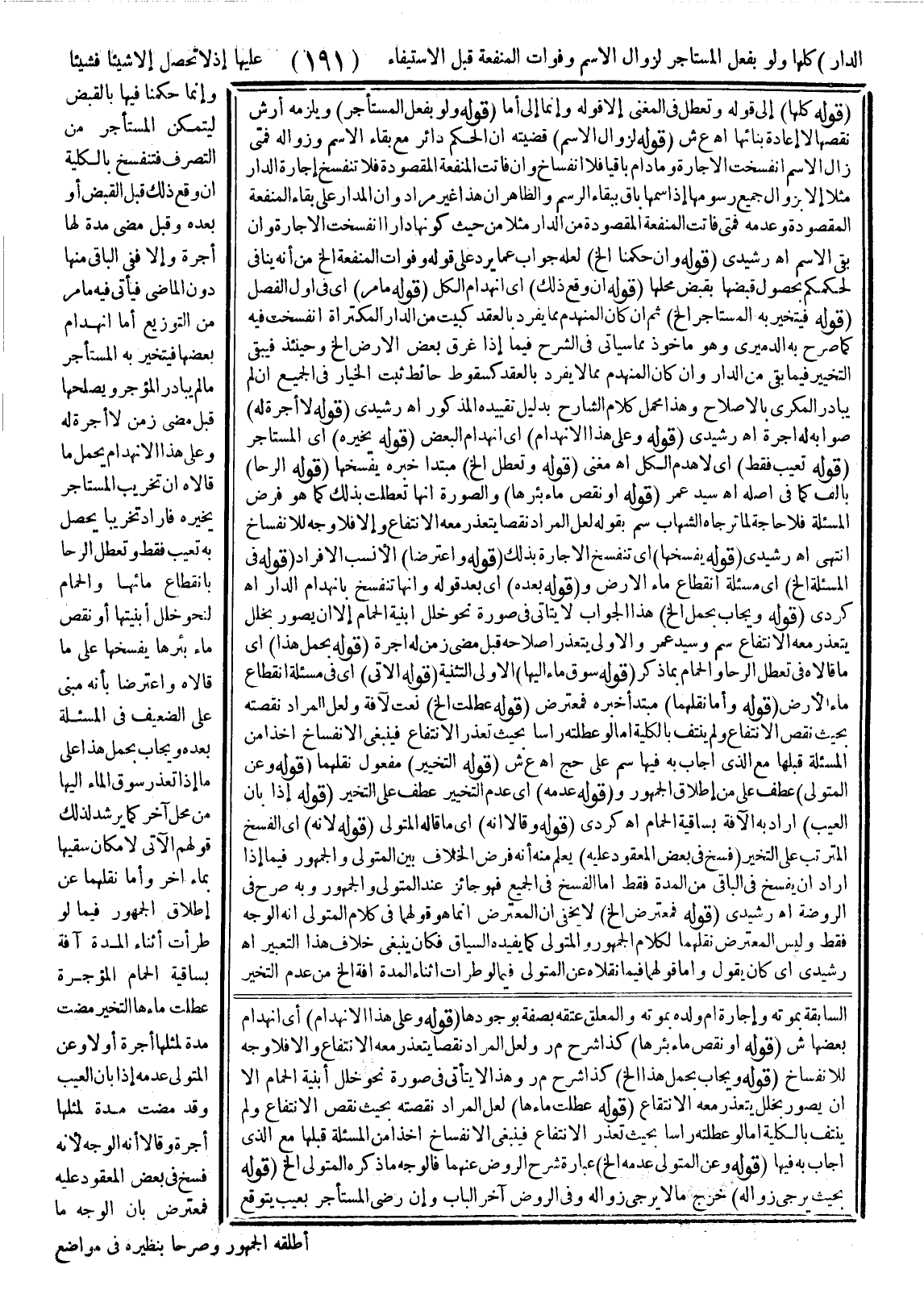 وَعَلَى هَذَا الِانْهِدَامِ يُحْمَلُ مَا قَالَاهُ إنَّ تَخْرِيبَ الْمُسْتَأْجِرِ يُخَيِّرُهُ فَأَرَادَ تَخْرِيبًا يَحْصُلُ بِهِ تَعَيُّبٌ فَقَطْ وَتَعَطُّلُ الرَّحَا بِانْقِطَاعِ مَائِهَا وَالْحَمَّامِ لِنَحْوِ خَلَلِ أَبْنِيَتِهَا أَوْ نَقْصِ مَاءِ بِئْرِهَا يَفْسَخُهَا عَلَى مَا قَالَاهُ وَاعْتُرِضَا بِأَنَّهُ مَبْنِيٌّ عَلَى الضَّعِيفِ فِي الْمَسْأَلَةِ بَعْدَهُ وَيُجَابُ بِحَمْلِ هَذَا عَلَى مَا إذَا تَعَذَّرَ سَوْقُ الْمَاءِ إلَيْهَا مِنْ مَحَلٍّ آخَرَ كَمَا يُرْشِدُ لِذَلِكَ قَوْلُهُمْ الْآتِي لِإِمْكَانِ سَقْيِهَا بِمَاءٍ آخَرَ وَأَمَّا نَقْلُهُمَا عَنْ إطْلَاقِ الْجُمْهُورِ فِيمَا لَوْ طَرَأَتْ أَثْنَاءَ الْمُدَّةِ آفَةٌ بِسَاقِيَةِ الْحَمَّامِ الْمُؤَجَّرَةِ عَطَّلَتْ مَاءَهَا التَّخَيُّرَ مَضَتْ مُدَّةٌ لِمِثْلِهَا أُجْرَةٌ أَوْ لَا وَعَنْ الْمُتَوَلِّي عَدَمُهُ إذَا بَانَ الْعَيْبُ، وَقَدْ مَضَتْ مُدَّةٌ لِمِثْلِهَا أُجْرَةٌ وَقَالَا إنَّهُ الْوَجْهُ؛ لِأَنَّهُ فَسْخٌ فِي بَعْضِ الْمَعْقُودِ عَلَيْهِ فَمُعْتَرَضٌ بِأَنَّ الْوَجْهَ مَا أَطْلَقَهُ الْجُمْهُورُ وَصَرَّحَا بِنَظِيرِهِ فِي مَوَاضِعَ