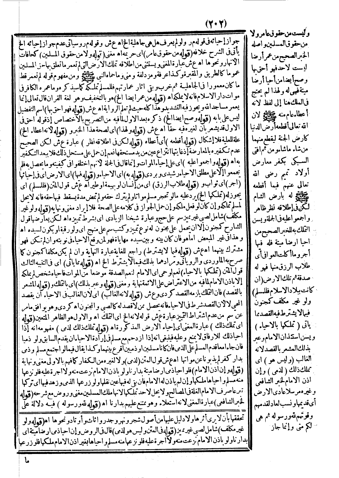 (قَوْلُهُ وَأَجْمَعُوا عَلَيْهِ) أَيْ عَلَى إحْيَاءِ الْمَوَاتِ وَإِنَّمَا قَالَ فِي الْجُمْلَةِ؛ لِأَنَّهُمْ اخْتَلَفُوا فِي كَيْفِيَّتِهِ وَمَا يَحْصُلُ بِهِ فَلَمْ يُجْمِعُوا إلَّا عَلَى مُطْلَقِ الْإِحْيَاءِ رَشِيدِيٌّ وَكُرْدِيٌّ (قَوْلُهُ بِهِ) أَيْ الْإِحْيَاءِ وَ (قَوْلُهُ فِيهَا) أَيْ الْأَرْضِ أَيْ فِي إحْيَائِهَا (أَجْرٌ) أَيْ ثَوَابٌ وَ (قَوْلُهُ طُلَّابُ الرِّزْقِ) أَيْ مِنْ إنْسَانٍ أَوْ بَهِيمَةٍ أَوْ طَيْرٍ اهـ ع ش قَوْلُ الْمَتْنِ (فَلِلْمُسْلِمِ) أَيْ يَجُوزُ لَهُ (تَمَلُّكُهَا إلَخْ) يَرِدُ عَلَيْهِ مَا لَوْ تَحَجَّرَ مُسْلِمٌ مَوَاتًا وَلَمْ يَتْرُكْ حَقَّهُ وَلَمْ تَمْضِ مُدَّةٌ يَسْقُطُ فِيهَا حَقُّهُ فَإِنَّهُ لَا يَحِلُّ لِمُسْلِمٍ تَمَلُّكُهُ وَإِنْ كَانَ لَوْ فَعَلَ مَلَكَهُ وَإِنْ حُمِلَ الْجَوْرُ فِي كَلَامِهِ عَلَى الصِّحَّةِ فَلَا إيرَادَ مُغْنِي وَنِهَايَةٌ (قَوْلُهُ وَلَوْ غَيْرَ مُكَلَّفٍ) شَامِلٌ لِصَبِيٍّ غَيْرِ مُمَيِّزٍ سم عَلَى حَجّ وَعِبَارَةُ شَيْخِنَا الزِّيَادِيِّ أَيْ بِشَرْطِ تَمْيِيزِهِ اهـ لَكِنْ يُعَارِضُهَا قَوْلُ الشَّارِحِ كَمَجْنُونٍ إلَّا أَنْ يُحْمَلَ عَلَى مَجْنُونٍ لَهُ نَوْعُ تَمْيِيزٍ وَكَتَبَ سم عَلَى مَنْهَجٍ أَيْ وَلَوْ رَقِيقًا وَيَكُونُ لِسَيِّدِهِ اهـ وَهَذَا فِي غَيْرِ الْمُبَعَّضِ أَمَّا هُوَ فَإِنْ كَانَ بَيْنَهُ وَبَيْنَ سَيِّدِهِ مُهَايَأَةٌ فَهُوَ لِمَنْ وَقَعَ الْإِحْيَاءُ فِي نَوْبَتِهِ وَإِنْ لَمْ تَكُنْ فَهُوَ مُشْتَرَكٌ بَيْنَهُمَا اهـ ع ش (قَوْلُهُ فِيمَا لَا يُشْتَرَطُ إلَخْ) رَاجِعٌ لِلْغَايَةِ عِبَارَةُ النِّهَايَةِ وَإِنْ لَمْ يَكُنْ مُكَلَّفًا كَمَجْنُونٍ كَمَا صَرَّحَ بِهِ الْمَاوَرْدِيُّ وَالرُّويَانِيُّ وَمُرَادُهُمَا بِذَلِكَ فِيمَا لَا يُشْتَرَطُ إلَخْ اهـ.