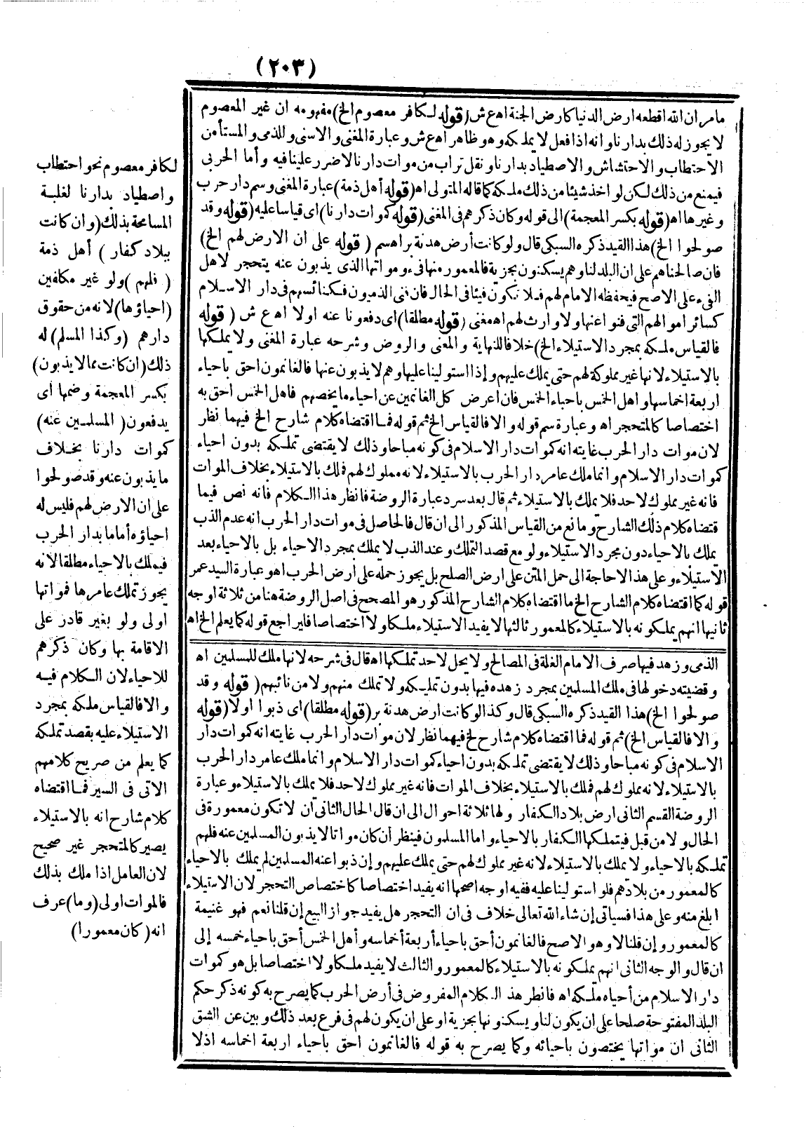 (قَوْلُهُ وَقَدْ صُولِحُوا إلَخْ) هَذَا الْقَيْدُ ذَكَرَهُ السُّبْكِيُّ قَالَ وَكَذَا لَوْ كَانَتْ أَرْضَ هُدْنَةٍ بِرّ (قَوْلُهُ مُطْلَقًا) أَيْ ذَبُّوا أَوْ لَا (قَوْلُهُ وَإِلَّا فَالْقِيَاسُ إلَخْ) ثُمَّ قَوْلُهُ فَمَا اقْتَضَاهُ كَلَامُ شَارِحِ إلَخْ فِيهِمَا نَظَرٌ؛ لِأَنَّ مَوَاتَ دَارِ الْحَرْبِ غَايَتُهُ أَنَّهُ كَمَوَاتِ دَارِ الْإِسْلَامِ فِي كَوْنِهِ مُبَاحًا وَذَلِكَ لَا يَقْتَضِي تَمَلُّكَهُ بِدُونِ إحْيَاءٍ كَمَوَاتِ دَارِ الْإِسْلَامِ وَإِنَّمَا مُلِكَ عَامِرُ دَارِ الْحَرْبِ بِالِاسْتِيلَاءِ؛ لِأَنَّهُ مَمْلُوكٌ لَهُمْ فَمُلِكَ بِالِاسْتِيلَاءِ بِخِلَافِ الْمَوَاتِ فَإِنَّهُ غَيْرُ مَمْلُوكٍ لِأَحَدٍ فَلَا يُمْلَكُ بِالِاسْتِيلَاءِ وَعِبَارَةُ الرَّوْضَةِ الْقِسْمُ الثَّانِي أَرْضُ بِلَادِ الْكُفَّارِ وَلَهَا ثَلَاثَةُ أَحْوَالٍ إلَى أَنْ قَالَ الْحَالُ الثَّانِي أَنْ لَا تَكُونَ مَعْمُورَةً فِي الْحَالِ وَلَا مِنْ قَبْلُ فَيَتَمَلَّكُهَا الْكُفَّارُ بِالْإِحْيَاءِ وَأَمَّا الْمُسْلِمُونَ فَيُنْظَرُ إنْ كَانَ مَوَاتًا لَا يَذُبُّونَ الْمُسْلِمِينَ عَنْهُ فَلَهُمْ تَمَلُّكُهُ بِالْإِحْيَاءِ وَلَا يُمْلَكُ بِالِاسْتِيلَاءِ؛ لِأَنَّهُ غَيْرُ مَمْلُوكٍ لَهُمْ حَتَّى يُمْلَكَ عَلَيْهِمْ، وَإِنْ ذَبُّوا عَنْهُ الْمُسْلِمِينَ لَمْ يُمْلَكْ بِالْإِحْيَاءِ كَالْمَعْمُورِ مِنْ بِلَادِهِمْ فَلَوْ اسْتَوْلَيْنَا عَلَيْهِ فَفِيهِ أَوْجُهٌ أَصَحُّهَا أَنَّهُ يُفِيدُ اخْتِصَاصًا كَاخْتِصَاصِ التَّحَجُّرِ؛ لِأَنَّ الِاسْتِيلَاءَ أَبْلَغُ مِنْهُ وَعَلَى هَذَا فَسَيَأْتِي إنْ شَاءَ اللَّهُ تَعَالَى خِلَافٌ فِي أَنَّ التَّحَجُّرَ هَلْ يُفِيدُ جَوَازَ الْبَيْعِ إنْ قُلْنَا نَعَمْ فَهُوَ غَنِيمَةٌ كَالْمَعْمُورِ، وَإِنْ قُلْنَا لَا وَهُوَ الْأَصَحُّ فَالْغَانِمُونَ أَحَقُّ بِإِحْيَاءِ أَرْبَعَةِ أَخْمَاسِهِ وَأَهْلُ الْخُمُسِ أَحَقُّ بِإِحْيَاءِ خُمُسِهِ إلَى أَنْ قَالَ وَالْوَجْهُ الثَّانِي أَنَّهُمْ يَمْلِكُونَهُ بِالِاسْتِيلَاءِ كَالْمَعْمُورِ وَالثَّالِثُ لَا يُفِيدُ مِلْكًا وَلَا اخْتِصَاصًا بَلْ هُوَ كَمَوَاتِ دَارِ الْإِسْلَامِ مَنْ أَحْيَاهُ مَلَكَهُ انْتَهَى فَانْظُرْ هَذَا الْكَلَامَ الْمَفْرُوضَ فِي أَرْضِ الْحَرْبِ كَمَا يُصَرِّحُ بِهِ كَوْنُهُ ذَكَرَ حُكْمَ الْبَلَدِ الْمَفْتُوحَةِ صُلْحًا عَلَى أَنْ يَكُونَ لَنَا وَيَسْكُنُونَهَا بِجِزْيَةٍ أَوْ عَلَى أَنْ يَكُونَ لَهُمْ فِي فَرْعٍ بَعْدَ ذَلِكَ وَبَيَّنَ عَنْ الشِّقِّ الثَّانِي أَنَّ مَوَاتَهَا يَخْتَصُّونَ بِإِحْيَائِهِ