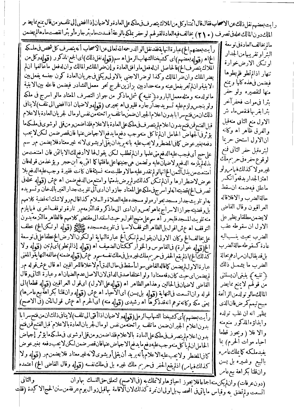 رَأَيْتُ بَعْضَهُمْ نَقَلَ ذَلِكَ عَنْ الْأَصْحَابِ فَقَالَ قَالَ أَئِمَّتُنَا وَكُلٌّ مِنْ الْمُلَّاكِ يَتَصَرَّفُ فِي مِلْكِهِ عَلَى الْعَادَةِ وَلَا ضَمَانَ إذَا أَفْضَى إلَى تَلَفٍ وَمَنْ قَالَ يُمْنَعُ مِمَّا يَضُرُّ الْمِلْكَ دُونَ الْمَالِكِ مَحَلُّهُ فِي تَصَرُّفٍ يُخَالِفُ فِيهِ الْعَادَةَ لِقَوْلِهِمْ لَوْ حَفَرَ بِمِلْكِهِ بَالُوعَةً أَفْسَدَتْ مَاءَ بِئْرِ جَارِهِ أَوْ بِئْرًا نَقَصَتْ مَاءَهَا لَمْ يَضْمَنْ مَا لَمْ يُخَالِفْ الْعَادَةَ فِي تَوْسِعَةِ الْبِئْرِ أَوْ تَقْرِيبِهَا مِنْ الْجِدَارِ أَوْ تَكُنْ الْأَرْضُ خَوَّارَةً تَنْهَارُ إذَا لَمْ تُطْوَ فَلَمْ يَطْوِهَا فَيَضْمَنُ فِي هَذِهِ كُلِّهَا وَيُمْنَعُ مِنْهَا لِتَقْصِيرِهِ، وَلَوْ حَفَرَ بِئْرًا فِي مَوَاتٍ فَحَفَرَ آخَرُ بِئْرًا بِقُرْبِهَا فَنَقَصَ مَاءَ بِئْرِ الْأَوَّلِ مُنِعَ الثَّانِي مِنْهُ، قِيلَ وَالْفَرْقُ ظَاهِرٌ اهـ وَكَأَنَّهُ أَنَّ الْأَوَّلَ اسْتَحَقَّ حَرِيمًا لِبِئْرِهِ قَبْلَ حَفْرِ الثَّانِي فَمُنِعَ لِوُقُوعِ حَفْرِهِ فِي حَرِيمٍ مِلْكِ غَيْرِهِ وَلَا كَذَلِكَ فِيمَا مَرَّ وَلَوْ اهْتَزَّ الْجِدَارُ بِدَقِّهِ وَانْكَسَرَ مَا عُلِّقَ فِيهِ ضَمِنَهُ إنْ سَقَطَ حَالَةَ الضَّرْبِ وَإِلَّا فَلَا قَالَهُ الْعِرَاقِيُّونَ وَقَالَ الْقَاضِي لَا يَضْمَنُ مُطْلَقًا وَيَظْهَرُ عَلَى الْأَوَّلِ أَنَّ سُقُوطَهُ عَقِبَ الضَّرْبِ بِحَيْثُ يُنْسَبُ إلَيْهِ عَادَةً كَسُقُوطِهِ حَالَةَ الضَّرْبِ بَلْ قَدْ يُقَالُ إنَّ مُرَادَهُمْ بِحَالَةِ الضَّرْبِ مَا يَشْمَلُ ذَلِكَ (تَنْبِيهٌ)