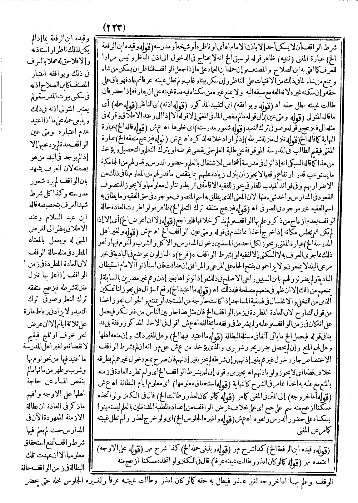 وَمَتَى عَيَّنَ الْوَاقِفُ مُدَّةً لَمْ يَزِدْ عَلَيْهَا إلَّا إذَا لَمْ يُوجَدْ فِي الْبَلَدِ مَنْ هُوَ بِصِفَتِهِ؛ لِأَنَّ الْعُرْفَ يَشْهَدُ بِأَنَّ الْوَاقِفَ لَمْ يُرِدْ شُغُورَ مَدْرَسَتِهِ وَكَذَا كُلُّ شَرْطٍ شَهِدَ الْعُرْفُ بِتَخْصِيصِهِ قَالَهُ ابْنُ عَبْدِ السَّلَامِ وَعِنْدَ الْإِطْلَاقِ يُنْظَرُ إلَى الْغَرَضِ الْمَبْنِيِّ لَهُ وَيُعْمَلُ بِالْمُعْتَادِ الْمُطَرَّدِ فِي مِثْلِهِ حَالَةَ الْوَقْفِ؛ لِأَنَّ الْعَادَةَ الْمُطَرَّدَةَ فِي زَمَنِ الْوَاقِفِ إذَا عُلِمَ بِهَا تُنَزَّلُ مَنْزِلَةَ شَرْطِهِ فَيُزْعَجُ مُتَفَقِّهٌ تَرَكَ التَّعَلُّمَ وَصُوفِيٌّ تَرَكَ التَّعَبُّدَ وَلَا يُزَادُ فِي رِبَاطِ مَارَّةٍ عَلَى ثَلَاثَةِ أَيَّامٍ إلَّا إنْ عَرَضَ نَحْوُ خَوْفٍ أَوْ ثَلْجٍ فَيُقِيمُ لِانْقِضَائِهِ وَلِغَيْرِ أَهْلِ الْمَدْرَسَةِ مَا اُعْتِيدَ فِيهَا مِنْ نَحْوِ نَوْمٍ بِهَا وَشُرْبٍ وَطُهْرٍ مِنْ مَائِهَا مَا لَمْ يَنْقُصْ الْمَاءُ عَنْ حَاجَةِ أَهْلِهَا عَلَى الْأَوْجَهِ وَأَفْهَم مَا ذُكِرَ فِي الْعَادَةِ أَنَّ بَطَالَةَ الْأَزْمِنَةِ الْمَعْهُودَةِ الْآنَ فِي الْمَدَارِسِ حَيْثُ لَمْ يُعْلَمْ فِيهَا شَرْطُ وَاقِفٍ تَمْنَعُ اسْتِحْقَاقَ مَعْلُومِهَا إلَّا إنْ عُهِدَتْ تِلْكَ الْبَطَالَةُ فِي زَمَنِ الْوَاقِفِ حَالَةَ الْوَقْفِ وَعَلِمَ بِهَا،