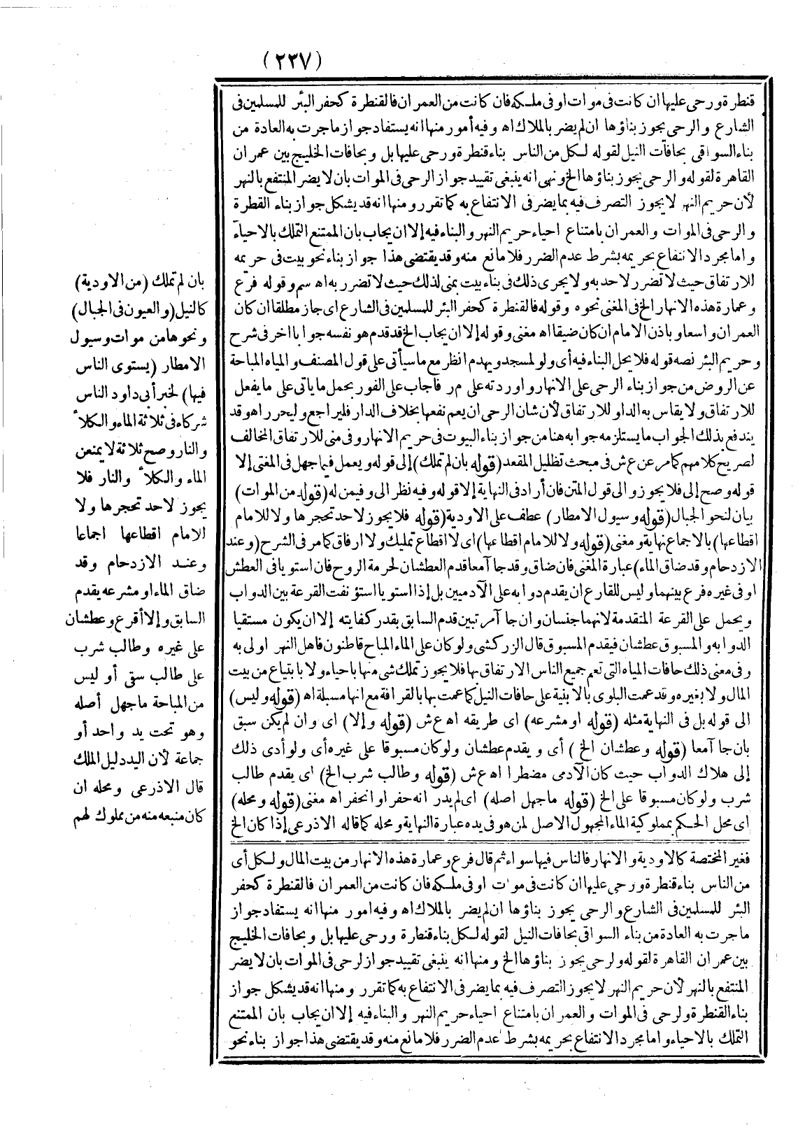 ـــــــــــــــــــــــــــــSفَغَيْرُ الْمُخْتَصَّةِ كَالْأَوْدِيَةِ وَالْأَنْهَارِ فَالنَّاسُ فِيهَا سَوَاءٌ ثُمَّ قَالَ فَرْعٌ وَعِمَارَةُ هَذِهِ الْأَنْهَارِ مِنْ بَيْتِ الْمَالِ وَلِكُلٍّ أَيْ مِنْ النَّاسِ بِنَاءُ قَنْطَرَةٍ وَرَحًى عَلَيْهَا إنْ كَانَتْ فِي مَوَاتٍ أَوْ فِي مِلْكِهِ فَإِنْ كَانَتْ مِنْ الْعُمْرَانِ فَالْقَنْطَرَةُ كَحَفْرِ الْبِئْرِ لِلْمُسْلِمِينَ فِي الشَّارِعِ، وَالرَّحَى يَجُوزُ بِنَاؤُهَا إنْ لَمْ يَضُرَّ بِالْمُلَّاكِ. اهـ. وَفِيهِ أُمُورٌ مِنْهَا أَنَّهُ يُسْتَفَادُ جَوَازُ مَا جَرَتْ بِهِ الْعَادَةُ مِنْ بِنَاءِ السَّوَّاقِي بِحَافَّاتِ النِّيلِ لِقَوْلِهِ لِكُلٍّ بِنَاءُ قَنْطَرَةٍ وَرَحًى عَلَيْهَا بَلْ وَبِحَافَّاتِ الْخَلِيجِ بَيْنَ عُمْرَانِ الْقَاهِرَةِ لِقَوْلِهِ وَلِرَحًى يَجُوزُ بِنَاؤُهَا إلَخْ وَمِنْهَا أَنَّهُ يَنْبَغِي تَقْيِيدُ جَوَازِ الرَّحَى فِي الْمَوَاتِ بِأَنْ لَا يَضُرَّ الْمُنْتَفِعَ بِالنَّهْرِ؛ لِأَنَّ حَرِيمَ النَّهْرِ لَا يَجُوزُ التَّصَرُّفُ فِيهِ بِمَا يَضُرُّ فِي الِانْتِفَاعِ بِهِ كَمَا تَقَرَّرَ وَمِنْهَا أَنَّهُ قَدْ يُشْكِلُ جَوَازُ بِنَاءِ الْقَنْطَرَةِ وَالرَّحَى فِي الْمَوَاتِ وَالْعُمْرَانِ بِامْتِنَاعِ إحْيَاءِ حَرِيمِ النَّهْرِ وَالْمَاءُ فِيهِ إلَّا أَنْ يُجَابَ بِأَنَّ الْمُمْتَنِعَ التَّمَلُّكُ بِالْإِحْيَاءِ وَأَمَّا مُجَرَّدُ الِانْتِفَاعِ بِحَرِيمِهِ بِشَرْطِ عَدَمِ الضَّرَرِ فَلَا مَانِعَ مِنْهُ.