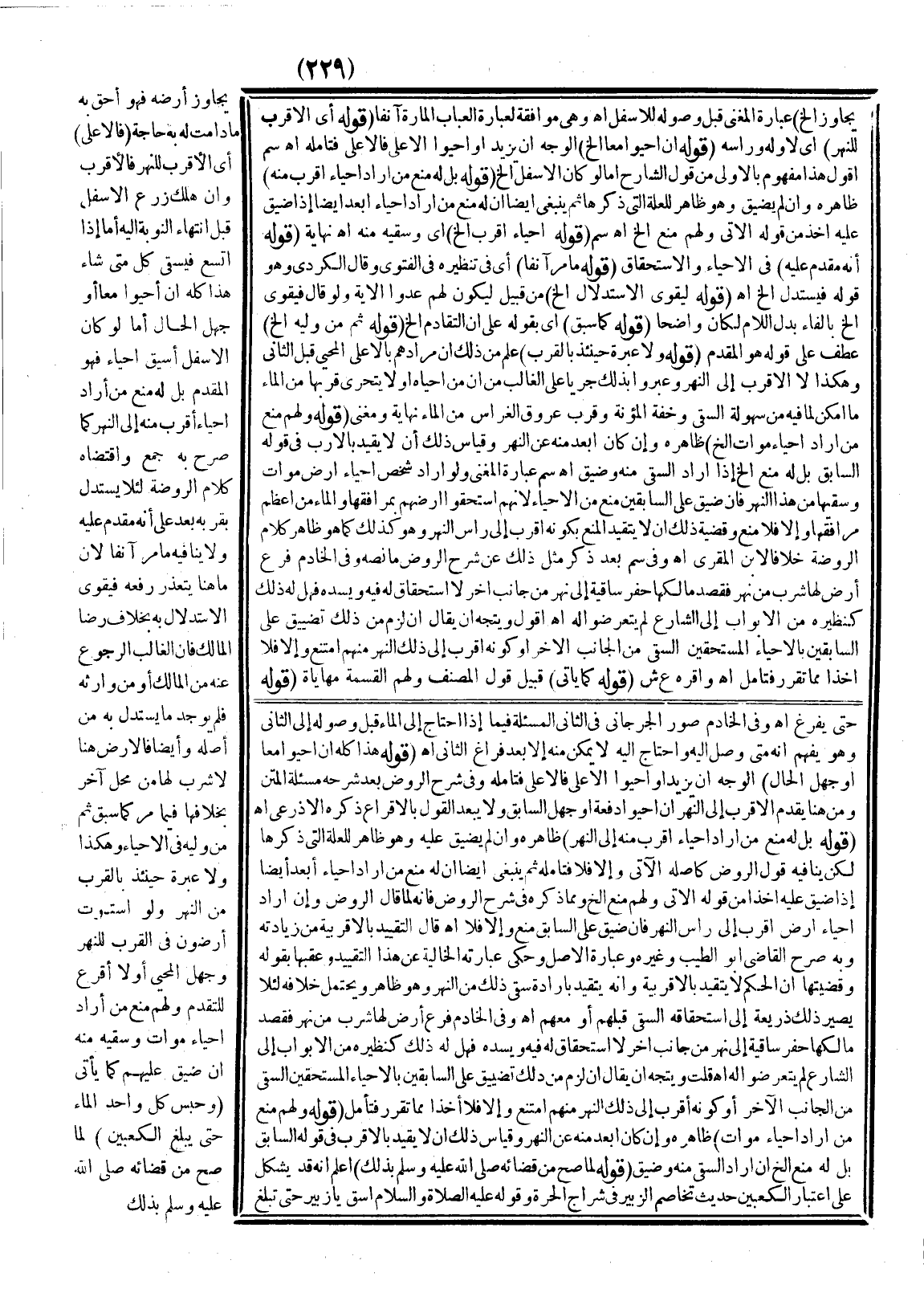 يُجَاوِزْ أَرْضَهُ فَهُوَ أَحَقُّ بِهِ مَا دَامَتْ لَهُ بِهِ حَاجَةٌ (فَالْأَعْلَى) أَيْ الْأَقْرَبُ لِلنَّهْرِ فَالْأَقْرَبُ وَإِنْ هَلَكَ زَرْعُ الْأَسْفَلِ قَبْلَ انْتِهَاءِ النَّوْبَةِ إلَيْهِ، أَمَّا إذَا اتَّسَعَ فَيَسْقِي كُلٌّ مَتَى شَاءَ. هَذَا كُلُّهُ إنْ أَحْيَوْا مَعًا أَوْ جُهِلَ الْحَالُ.: أَمَّا لَوْ كَانَ الْأَسْفَلُ أَسْبَقَ إحْيَاءً فَهُوَ الْمُقَدَّمُ بَلْ لَهُ مَنْعُ مَنْ أَرَادَ إحْيَاءً أَقْرَبَ مِنْهُ إلَى النَّهْرِ كَمَا صَرَّحَ بِهِ جَمْعٌ وَاقْتَضَاهُ كَلَامُ الرَّوْضَةِ لِئَلَّا يُسْتَدَلَّ بِقُرْبِهِ بَعْدُ عَلَى أَنَّهُ مُقَدَّمٌ عَلَيْهِ وَلَا يُنَافِيهِ مَا مَرَّ آنِفًا؛ لِأَنَّ مَا هُنَا يَتَعَذَّرُ رَفْعُهُ فَيَقْوَى الِاسْتِدْلَال بِهِ بِخِلَافِ رِضَا الْمَالِكِ فَإِنَّ الْغَالِبَ الرُّجُوعُ عَنْهُ مِنْ الْمَالِكِ أَوْ مِنْ وَارِثِهِ فَلَمْ يُوجَدْ مَا يُسْتَدَلُّ بِهِ مِنْ أَصْلِهِ، وَأَيْضًا فَالْأَرْضُ هُنَا لَا شِرْبَ لَهَا مِنْ مَحَلٍّ آخَرَ بِخِلَافِهَا فِيمَا مَرَّ كَمَا سَبَقَ ثُمَّ مَنْ وَلِيَهُ فِي الْإِحْيَاءِ وَهَكَذَا.