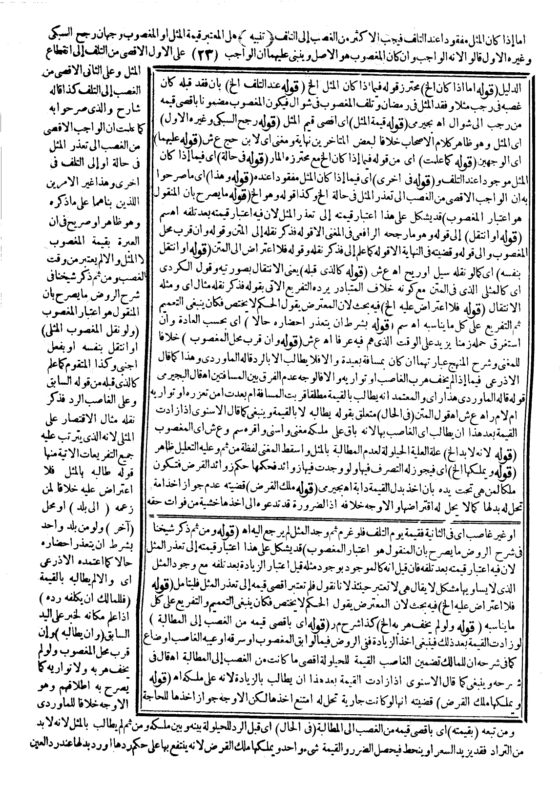 هَلْ الْمُعْتَبَرُ قِيمَةُ الْمِثْلِ أَوْ الْمَغْصُوبُ وَجْهَانِ رَجَّحَ السُّبْكِيُّ وَغَيْرُهُ الْأَوَّلَ قَالُوا؛ لِأَنَّهُ الْوَاجِبُ، وَإِنْ كَانَ الْمَغْصُوبُ هُوَ الْأَصْلَ وَيَنْبَنِي عَلَيْهِمَا أَنَّ الْوَاجِبَ عَلَى الْأَوَّلِ الْأَقْصَى مِنْ التَّلَفِ إلَى انْقِطَاعِ الْمِثْلِ وَعَلَى الثَّانِي الْأَقْصَى مِنْ الْغَصْبِ إلَى التَّلَفِ كَذَا قَالَهُ شَارِحٌ وَاَلَّذِي صَرَّحُوا بِهِ كَمَا عَلِمْت أَنَّ الْوَاجِبَ الْأَقْصَى مِنْ الْغَصْبِ إلَى تَعَذُّرِ الْمِثْلِ فِي حَالَةٍ أَوْ إلَى التَّلَفِ فِي أُخْرَى وَهَذَا غَيْرُ الْأَمْرَيْنِ اللَّذَيْنِ بَنَاهُمَا عَلَى مَا ذَكَرَهُ وَهُوَ ظَاهِرٌ أَوْ صَرِيحٌ فِي أَنَّ الْعِبْرَةَ بِقِيمَةِ الْمَغْصُوبِ لَا الْمِثْلِ وَإِلَّا لَمْ يُعْتَبَرْ مِنْ وَقْتِ الْغَصْبِ وَمِنْ ثَمَّ ذَكَرَ شَيْخُنَا فِي شَرْحِ الرَّوْضِ مَا يُصَرِّحُ بِأَنَّ الْمَنْقُولَ هُوَ اعْتِبَارُ الْمَغْصُوبِ.