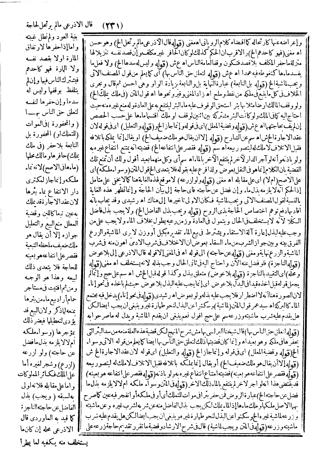 (قَوْلُهُ: وَقَضِيَّةُ الْعِلَلِ) أَيْ فِي قَوْلِهِ وَإِنَّمَا جَازَ إلَخْ (قَوْلُهُ: وَالتَّعْلِيلُ) أَيْ قَوْلُهُ:؛ لِأَنَّ عَقْدَ الْإِجَارَةِ إلَخْ ش (قَوْلُهُ: أَمَانٌ يُقَالُ هُوَ مِلْكٌ ضَعِيفٌ إلَخْ) أَوْ يُقَالُ إنَّمَا يَمْلِكُهُ بِإِتْلَافِهِ فَقَبْلَ الْإِتْلَافِ لَا مِلْكَ لَهُ لِيُتَصَوَّرَ بَيْعُهُ (قَوْلُهُ: فَقُصِرَ عَلَى انْتِفَاعِهِ هُوَ بِعَيْنِهِ) قَضِيَّتُهُ امْتِنَاعُ انْتِفَاعِ غَيْرِهِ بِهِ وَلَوْ بِإِذْنِهِ (قَوْلُهُ: فَقُصِرَ عَلَى انْتِفَاعِهِ هُوَ بِعَيْنِهِ) قَدْ يَقْتَضِي هَذَا أَنَّهُ لَوْ آجَرَ لِآخَرَ لَمْ يَنْتَفِعْ بِالْمَاءِ ذَلِكَ الْآخَرُ (قَوْلُهُ: فِي الْمَتْنِ وَسَوَاءٌ مَلَكَهُ أَمْ لَا لَا يَلْزَمُهُ بَذْلُ مَا فَضَلَ عَنْ حَاجَتِهِ إلَخْ) عِبَارَةُ الرَّوْضِ فَمَنْ حَفَرَ بِئْرًا فِي مَوَاتٍ لِلتَّمَلُّكِ أَيْ أَوْ فِي مِلْكِهِ أَوْ انْفَجَرَ فِيهِ عَيْنٌ كَمَا صَرَّحَ بِهِمَا الْأَصْلُ مَلَكَهَا وَمَلَكَ مَاءَهَا إذْ الْمَاءُ يُمْلَكُ لَكِنْ يَجِبُ بَذْلُ الْفَاضِلِ مِنْهُ عَنْ شُرْبِهِ لِشُرْبِ غَيْرِهِ وَعَنْ مَاشِيَتِهِ وَزَرْعِهِ لِمَاشِيَةِ غَيْرِهِ إلَخْ سَكَتُوا عَنْ الْبَذْلِ لِنَحْوِ طَهَارَةِ غَيْرِهِ وَيَنْبَغِي أَنْ يَجِبَ أَيْضًا لَكِنْ هَلْ يُقَدَّمُ عَلَيْهِ شُرْبُ مَاشِيَتِهِ وَزَرْعِهِ (قَوْلُهُ: فِي الْمَتْنِ وَيَجِبُ لِمَاشِيَةٍ) قَالَ فِي شَرْحِ الْإِرْشَادِ: وَقَضِيَّةُ مَا تَقَرَّرَ تَقْدِيمُ حَاجَةِ زَرْعِهِ عَلَى