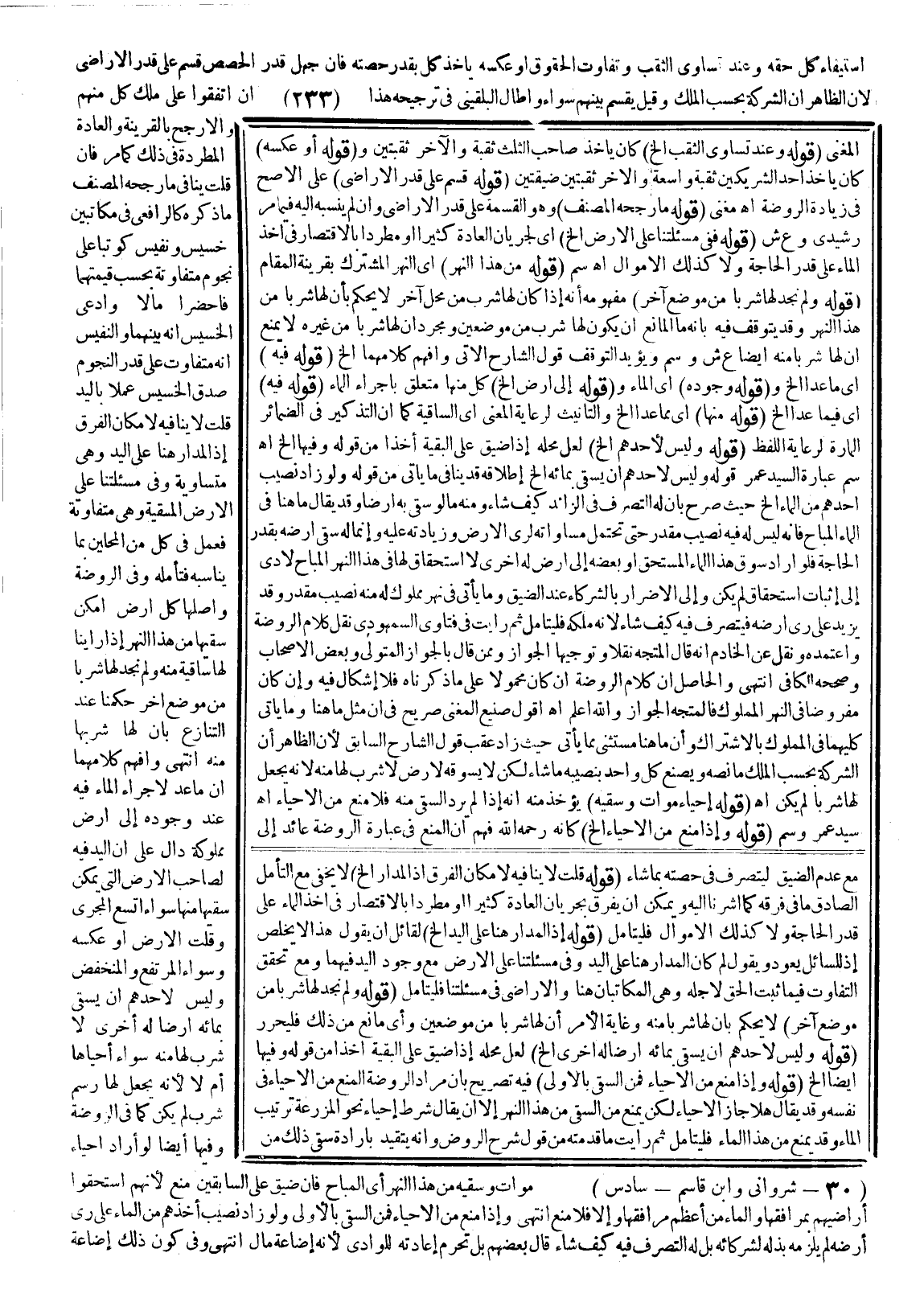 ـــــــــــــــــــــــــــــSمَعَ عَدَمِ الضِّيقِ لِيَتَصَرَّفَ فِي حِصَّتِهِ بِمَا شَاءَ (قَوْلُهُ: قُلْت لَا يُنَافِيهِ لِإِمْكَانِ الْفَرْقِ إذْ الْمَدَارُ إلَخْ) لَا يَخْفَى مَعَ التَّأَمُّلِ الصَّادِقِ مَا فِي فُرْقَةٍ كَمَا أَشَرْنَا إلَيْهِ وَيُمْكِنُ أَنْ يُفَرَّقَ بِجَرَيَانِ الْعَادَةِ كَثِيرًا أَوْ مُطَرَّدًا بِالِاقْتِصَارِ فِي أَخْذِ الْمَاءِ عَلَى قَدْرِ الْحَاجَةِ وَلَا كَذَلِكَ الْأَمْوَالُ فَلْيُتَأَمَّلْ (قَوْلُهُ: إذْ الْمَدَارُ هُنَا عَلَى الْيَدِ إلَخْ) لِقَائِلٍ أَنْ يَقُولَ هَذَا لَا يَخْلُصُ إذْ السَّائِلُ يَعُودُ وَيَقُولُ لِمَ كَانَ الْمَدَارُ هُنَا عَلَى الْيَدِ وَفِي مَسْأَلَتِنَا عَلَى الْأَرْضِ مَعَ وُجُودِ الْيَدِ فِيهِمَا وَمَعَ تَحَقُّقِ التَّفَاوُتِ فِيمَا ثَبَتَ الْحَقُّ لِأَجْلِهِ وَهِيَ الْمُكَاتَبَانِ هُنَا وَالْأَرَاضِي فِي مَسْأَلَتِنَا فَلْيُتَأَمَّلْ. (قَوْلُهُ: وَلَمْ نَجِدْ لَهَا شِرْبًا مِنْ مَوْضِعٍ آخَرَ) لَا يُحْكَمُ بِأَنَّ لَهَا شِرْبًا مِنْهُ وَغَايَةُ الْأَمْرِ أَنَّ لَهَا شِرْبًا مِنْ مَوْضِعَيْنِ وَأَيُّ مَانِعٍ مِنْ ذَلِكَ فَلْيُحَرَّرْ. (قَوْلُهُ: وَلَيْسَ لِأَحَدِهِمْ أَنْ يَسْقِيَ بِمَائِهِ أَرْضًا لَهُ أُخْرَى إلَخْ) لَعَلَّ مَحَلَّهُ إذَا ضَيَّقَ عَلَى الْبَقِيَّةِ أَخْذًا مِنْ قَوْلِهِ وَفِيهَا أَيْضًا إلَخْ. (قَوْلُهُ: وَإِذَا مُنِعَ مِنْ الْإِحْيَاءِ فَمِنْ السَّقْيِ بِالْأُولَى) فِيهِ تَصْرِيحٌ بِأَنَّ مُرَادَ الرَّوْضَةِ الْمَنْعُ مِنْ الْإِحْيَاءِ فِي نَفْسِهِ وَقَدْ يُقَالُ هَلَّا جَازَ الْإِحْيَاءُ لَكِنْ يُمْنَعُ مِنْ السَّقْيِ مِنْ هَذَا النَّهْرِ؟ إلَّا أَنْ يُقَالَ شَرْطُ إحْيَاءِ نَحْوِ الْمَزْرَعَةِ تَرْتِيبُ الْمَاءِ وَقَدْ يُمْنَعُ مِنْ هَذَا الْمَاءِ فَلْيُتَأَمَّلْ، ثُمَّ رَأَيْت مَا قَدَّمْتُهُ مِنْ قَوْلِ شَرْحِ الرَّوْضِ وَأَنَّهُ يَتَقَيَّدُ بِإِرَادَةِ سَقْي ذَلِكَ مِنْ
