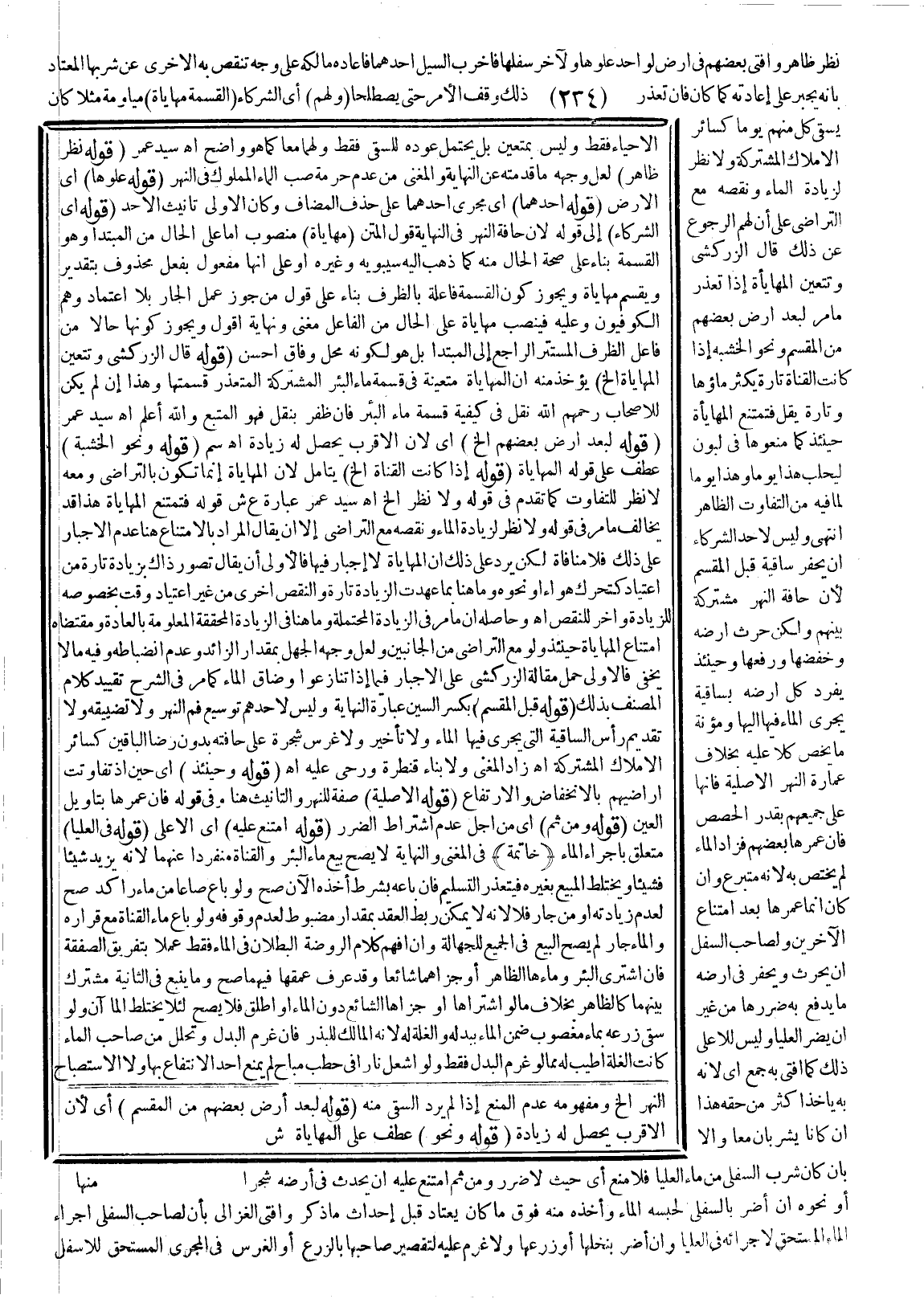 (قَوْلُهُ: قَبْلَ الْمَقْسِمِ) بِكَسْرِ السِّينِ عِبَارَةُ النِّهَايَةِ وَلَيْسَ لِأَحَدِهِمْ تَوْسِيعُ فَمٍ لِنَهْرٍ وَلَا تَضْيِيقُهُ وَلَا تَقْدِيمُ رَأْسِ السَّاقِيَةِ الَّتِي يَجْرِي فِيهَا الْمَاءُ وَلَا تَأْخِيرُهُ وَلَا غَرْسُ شَجَرَةٍ عَلَى حَافَّتِهِ بِدُونِ رِضَا الْبَاقِينَ كَسَائِرِ الْأَمْلَاكِ الْمُشْتَرَكَةِ. اهـ. زَادَ الْمُغْنِي وَلَا بِنَاءُ قَنْطَرَةٍ وَرَحًى عَلَيْهِ. اهـ. (قَوْلُهُ: حِينَئِذٍ) أَيْ حِينَ إذْ تَفَاوَتَتْ أَرَاضِيهُمْ بِالِانْخِفَاضِ وَالِارْتِفَاعِ (قَوْلُهُ: الْأَصْلِيَّةِ) صِفَةٌ لِلنَّهْرِ وَالتَّأْنِيثُ هُنَا وَفِي قَوْلِهِ فَإِنَّ عُمْرَهَا بِتَأْوِيلِ الْعَيْنِ (قَوْلُهُ: وَمِنْ ثَمَّ) أَيْ مِنْ أَجْلِ اشْتِرَاطِ عَدَمِ الضَّرَرِ (قَوْلُهُ: امْتَنَعَ عَلَيْهِ) أَيْ الْأَعْلَى (قَوْلِهِ: فِي الْعُلْيَا) مُتَعَلِّقٌ بِإِجْرَاءِ الْمَاءِ (خَاتِمَةٌ)