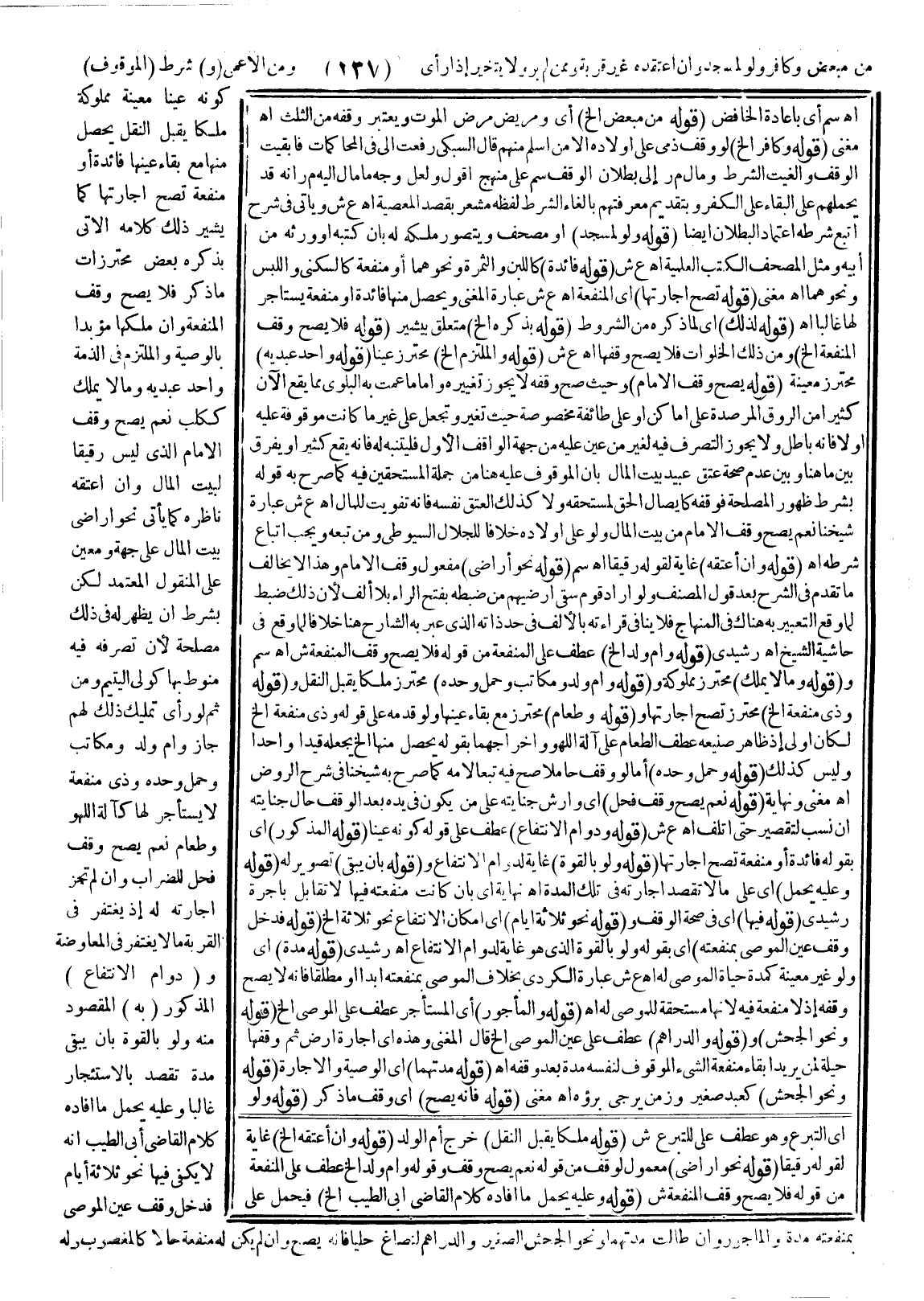 (قَوْلُهُ: لِذَلِكَ) أَيْ لِمَا ذَكَرَهُ مِنْ الشُّرُوطِ (قَوْلُهُ: بِذِكْرِهِ إلَخْ) مُتَعَلِّقٌ بِيُشِيرُ (قَوْلُهُ: فَلَا يَصِحُّ وَقْفُ الْمَنْفَعَةِ إلَخْ) وَمِنْ ذَلِكَ الْخَلَوَاتُ فَلَا يَصِحُّ وَقْفُهَا. اهـ. ع ش (قَوْلُهُ وَالْمُلْتَزِمِ إلَخْ) مُحْتَرَزُ عَيْنًا (قَوْلُهُ: وَأَحَدِ عَبْدَيْهِ) مُحْتَرَزُ مُعَيَّنَةٍ (قَوْلُهُ: يَصِحُّ وَقْفُ الْإِمَامِ إلَخْ) وَحَيْثُ صَحَّ وَقْفُهُ لَا يَجُوزُ تَغْيِيرُهُ، وَأَمَّا مَا عَمَّتْ بِهِ الْبَلْوَى مِمَّا يَقَعُ الْآنَ كَثِيرًا مِنْ الرُّوقِ الْمُرْصَدَةِ عَلَى أَمَاكِنَ أَوْ عَلَى طَائِفَةٍ مَخْصُوصَةٍ حَيْثُ تَغَيَّرَ وَتُجْعَلُ عَلَى غَيْرِ مَا كَانَتْ مَوْقُوفَةً عَلَيْهِ أَوَّلًا فَإِنَّهُ بَاطِلٌ وَلَا يَجُوزُ التَّصَرُّفُ فِيهِ لِغَيْرِ مَنْ عَيَّنَ عَلَيْهِ مِنْ جِهَةِ الْوَاقِفِ الْأَوَّلِ فَلْيُتَنَبَّهْ لَهُ فَإِنَّهُ يَقَعُ كَثِيرًا وَيُفَرَّقُ بَيْنَ مَا هُنَا وَبَيْنَ عَدَمِ صِحَّةِ عِتْقِ عَبِيدِ بَيْتِ الْمَالِ بِأَنَّ الْمَوْقُوفَ عَلَيْهِ هُنَا مِنْ جُمْلَةِ الْمُسْتَحَقِّينَ فِيهِ كَمَا صَرَّحَ بِهِ قَوْلُهُ: بِشَرْطِ ظُهُورِ الْمَصْلَحَةِ فَوَقْفُهُ كَإِيصَالِ الْحَقِّ لِمُسْتَحِقِّهِ وَلَا كَذَلِكَ الْعِتْقُ نَفْسُهُ فَإِنَّهُ تَفْوِيتٌ لِلْمَالِ. اهـ.