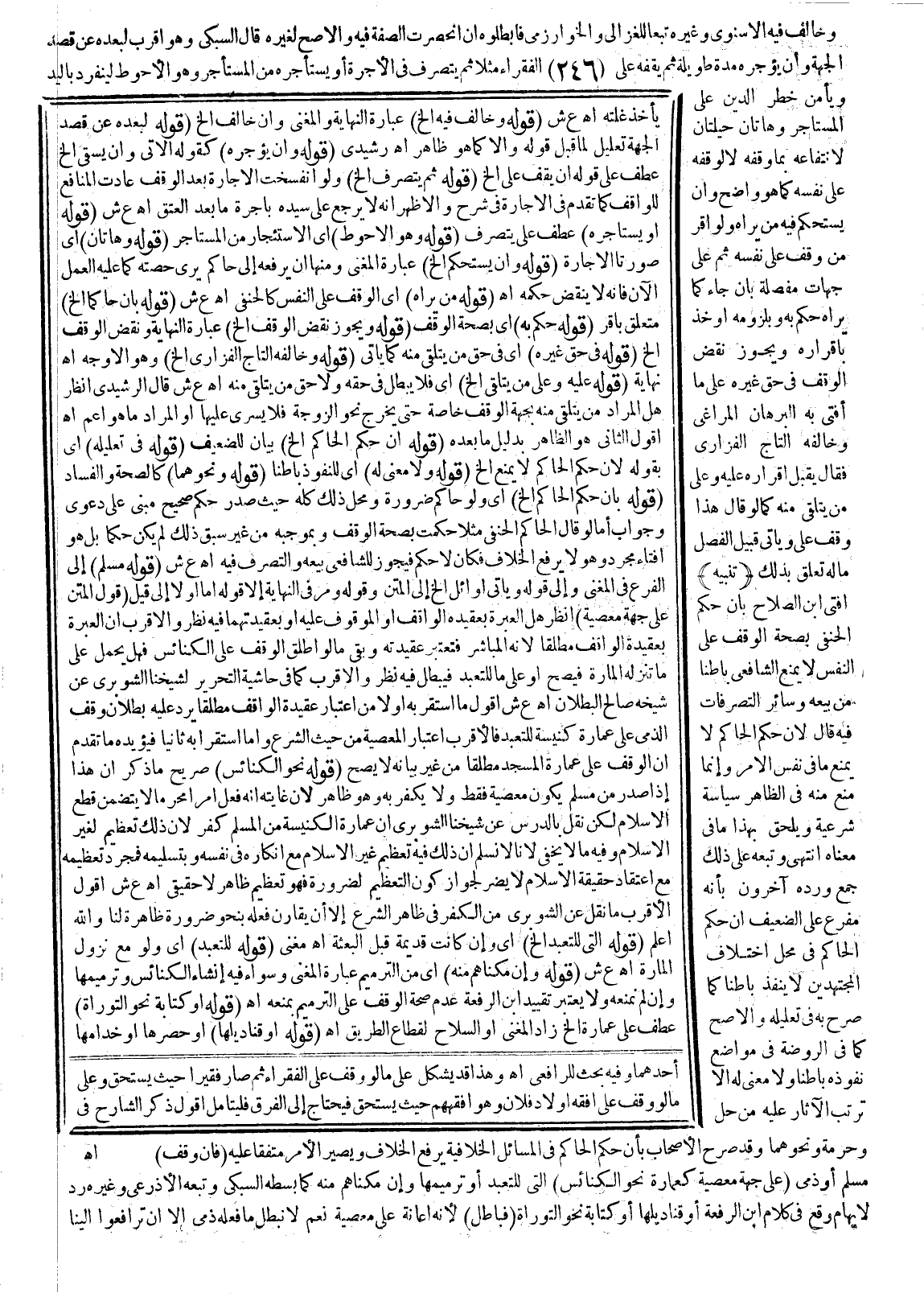 وَخَالَفَ فِيهِ الْإِسْنَوِيُّ وَغَيْرُهُ تَبَعًا لِلْغَزَالِيِّ وَالْخَوَارِزْمِيِّ فَأَبْطَلُوهُ إنْ انْحَصَرَتْ الصِّفَةُ فِيهِ وَالْأَصَحُّ لِغَيْرِهِ قَالَ السُّبْكِيُّ وَهُوَ أَقْرَبُ لِبُعْدِهِ عَنْ قَصْدِ الْجِهَةِ وَأَنْ يُؤَجِّرَهُ مُدَّةً طَوِيلَةً ثُمَّ يَقِفَهُ عَلَى الْفُقَرَاءِ مَثَلًا ثُمَّ يَتَصَرَّفُ فِي الْأُجْرَةِ أَوْ يَسْتَأْجِرُهُ مِنْ الْمُسْتَأْجِرِ وَهُوَ الْأَحْوَطُ لِيَنْفَرِدَ بِالْيَدِ وَيَأْمَنَ خَطَرَ الدَّيْنِ عَلَى الْمُسْتَأْجِرِ وَهَاتَانِ حِيلَتَانِ لِانْتِفَاعِهِ بِمَا وَقَفَهُ لَا لِوَقْفِهِ عَلَى نَفْسِهِ كَمَا هُوَ وَاضِحٌ وَأَنْ يَسْتَحْكِمَ فِيهِ مَنْ يَرَاهُ وَلَوْ أَقَرَّ مَنْ وَقَفَ عَلَى نَفْسِهِ ثُمَّ عَلَى جِهَاتِ مُفَصَّلَةٍ بِأَنْ جَاءَ كَمَا يَرَاهُ حُكِمَ بِهِ وَبِلُزُومِهِ وَأُخِذَ بِإِقْرَارِهِ وَيَجُوزُ نَقْضُ الْوَقْفِ فِي حَقِّ غَيْرِهِ عَلَى مَا أَفْتَى بِهِ الْبُرْهَانُ الْمَرَاغِيَّ وَخَالَفَهُ التَّاجُ الْفَزَارِيّ فَقَالَ يُقْبَلُ إقْرَارُهُ عَلَيْهِ وَعَلَى مَنْ يَتَلَقَّى مِنْهُ كَمَا لَوْ قَالَ هَذَا وَقْفٌ عَلَيَّ وَيَأْتِي قُبَيْلَ الْفَصْلِ مَا لَهُ تَعَلُّقٌ بِذَلِكَ.