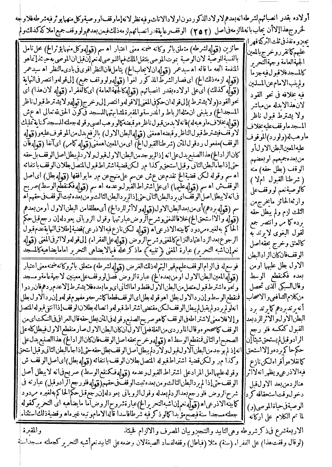 ـــــــــــــــــــــــــــــQحَائِزِينَ (قَوْلُهُ: لِشَرْطِهِ) مُتَعَلِّقٌ بِأَثَرٍ وَكَأَنَّهُ ضَمَّنَهُ مَعْنَى اعْتِبَارُ. اهـ. سم (قَوْلُهُ: وَكُلٌّ مِنْهُمَا يُؤَثِّرُ إلَخْ) مَحَلُّ تَأَمُّلٍ بِالنِّسْبَةِ لِلْوَصِيَّةِ؛ لِأَنَّ الْوَصِيَّةَ بِمَوْتِ الْمُوصِي يَنْتَقِلُ الْمِلْكُ فِيهَا لِلْمُوصَى لَهُ نَعَمْ إنْ قِيلَ إنَّ الْمُوصَى بِهِ حِينَئِذٍ إنَّمَا هُوَ الْمَنْفَعَةُ اُتُّجِهَ مَا قَالَهُ. اهـ. سَيِّدُ عُمَرَ (قَوْلُهُ: إلَّا أَنْ يُجَابَ إلَخْ) يُتَأَمَّلُ فَإِنَّ النَّظَرَ أَقْوَى فِي بَادِئِ النَّظَرِ. اهـ. سَيِّدُ عُمَرَ (قَوْلُهُ: لَزِمَهُ ذَلِكَ إلَخْ) أَيْ فَصَارَ الشَّرْطُ الْمَذْكُورُ لَغْوًا (قَوْلُهُ: وَلَوْ وَقَفَ جَمِيعَ) إلَى قَوْلِهِ وَانْتَصَرَ فِي النِّهَايَةِ (قَوْلُهُ: كَذَلِكَ) أَيْ عَلَى أَوْلَادِهِ بِقَدْرِ أَنْصِبَائِهِمْ (قَوْلُهُ: كَالْجِهَةِ الْعَامَّةِ) أَيْ كَالْفُقَرَاءِ (قَوْلُهُ:؛ لِأَنَّ هَذَا) أَيْ نَحْوَ الْقَوَدِ (قَوْلُهُ: وَلَا يُشْتَرَطُ) إلَى قَوْلِهِ إنْ حَكَمَ فِي الْمُغْنِي إلَّا قَوْلَهُ وَانْتَصَرَ إلَى وَخَرَجَ (قَوْلُهُ: وَلَا يُشْتَرَطُ قَبُولُ نَاظِرِ الْمَسْجِدِ إلَخْ) وَيَنْبَغِي أَنَّ مِثْلَهُ الرِّبَاطُ وَالْمَدْرَسَةُ وَالْمَقْبَرَةُ لِمُشَابِهَتِهَا لِلْمَسْجِدِ فِي كَوْنِ الْحَقِّ لِلَّهِ تَعَالَى. اهـ. ع ش.