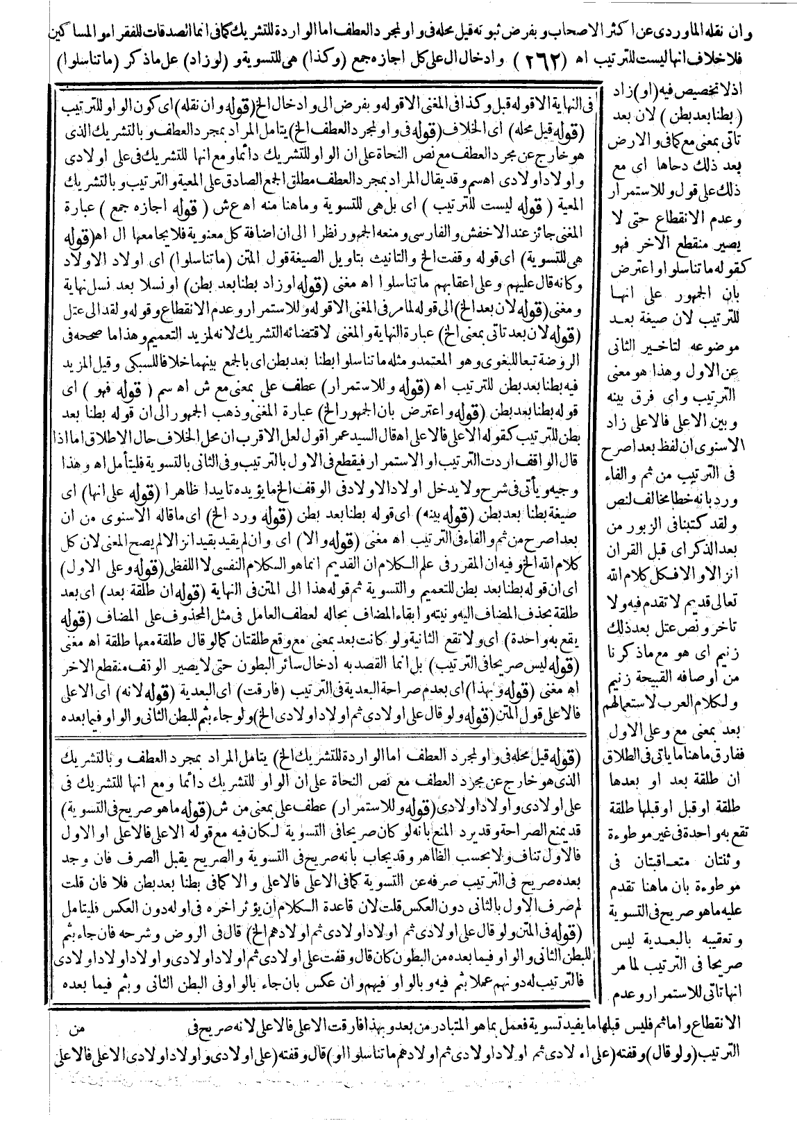 وَإِنْ نَقَلَهُ الْمَاوَرْدِيُّ عَنْ أَكْثَرِ الْأَصْحَابِ وَبِفَرْضِ ثُبُوتِهِ قِيلَ مَحَلُّهُ فِي وَاوٍ لِمُجَرَّدِ الْعَطْفِ، أَمَّا الْوَارِدَةُ لِلتَّشْرِيكِ كَمَا فِي {إِنَّمَا الصَّدَقَاتُ لِلْفُقَرَاءِ وَالْمَسَاكِينِ} [التوبة: 60] فَلَا خِلَافَ أَنَّهَا لَيْسَتْ لِلتَّرْتِيبِ انْتَهَى وَإِدْخَالُ أَلْ عَلَى كُلِّ أَجَازَهُ جَمْعٌ (وَكَذَا) هِيَ لِلتَّسْوِيَةِ وَ (لَوْ زَادَ) عَلَى مَا ذُكِرَ (مَا تَنَاسَلُوا) إذْ لَا تَخْصِيصَ فِيهِ (، أَوْ) زَادَ (بَطْنًا بَعْدَ بَطْنٍ) ؛ لِأَنَّ بَعْدَ تَأْتِي بِمَعْنَى مَعَ كَمَا فِي {وَالأَرْضَ بَعْدَ ذَلِكَ دَحَاهَا} [النازعات: 30] أَيْ: مَعَ ذَلِكَ عَلَى قَوْلٍ، وَلِلِاسْتِمْرَارِ وَعَدَمِ الِانْقِطَاعِ حَتَّى لَا يَصِيرَ مُنْقَطِعَ الْآخِرِ فَهُوَ كَقَوْلِهِ مَا تَنَاسَلُوا وَاعْتُرِضَ بِأَنَّ الْجُمْهُورَ عَلَى أَنَّهَا لِلتَّرْتِيبِ؛ لِأَنَّ صِيغَةَ بَعْدَ مَوْضُوعَةٌ لِتَأْخِيرِ الثَّانِي عَنْ الْأَوَّلِ وَهَذَا هُوَ مَعْنَى التَّرْتِيبِ وَأَيُّ فَرْقٍ بَيْنَهُ وَبَيْنَ الْأَعْلَى فَالْأَعْلَى زَادَ الْإِسْنَوِيُّ أَنَّ لَفْظَ بَعْدَ أَصْرَحُ فِي التَّرْتِيبِ مِنْ، ثُمَّ، وَالْفَاءِ وَرُدَّ بِأَنَّهُ خَطَأٌ مُخَالِفٌ لِنَصِّ {وَلَقَدْ كَتَبْنَا فِي الزَّبُورِ مِنْ بَعْدِ الذِّكْرِ} [الأنبياء: 105] أَيْ: قَبْلَ الْقُرْآنِ إنْزَالًا وَإِلَّا فَكُلُّ كَلَامِ اللَّهِ تَعَالَى قَدِيمٌ لَا تَقَدُّمَ فِيهِ وَلَا تَأَخُّرَ وَنَصِّ {عُتُلٍّ بَعْدَ ذَلِكَ زَنِيمٍ} [القلم: 13] أَيْ: هُوَ مَعَ مَا ذَكَرْنَا مِنْ أَوْصَافِهِ الْقَبِيحَةِ زَنِيمٌ وَلِكَلَامِ الْعَرَبِ لِاسْتِعْمَالِهِمْ بَعْدَ بِمَعْنَى مَعَ، وَعَلَى الْأَوَّلِ فَفَارَقَ مَا هُنَا مَا يَأْتِي فِي الطَّلَاقِ أَنَّ طَلْقَةٌ بَعْدَ أَوْ بَعْدَهَا طَلْقَةٌ، أَوْ قَبْلَ أَوْ قَبْلَهَا طَلْقَةٌ تَقَعُ بِهِ وَاحِدَةٌ فِي غَيْرِ مَوْطُوءَةً وَثِنْتَانِ مُتَعَاقِبَتَانِ فِي مَوْطُوءَةٍ بِأَنَّ مَا هُنَا تَقَدَّمَ عَلَيْهِ مَا هُوَ صَرِيحٌ فِي التَّسْوِيَةِ وَتَعْقِيبُهُ بِالْبَعْدِيَّةِ لَيْسَ صَرِيحًا فِي التَّرْتِيبِ لِمَا مَرَّ أَنَّهَا تَأْتِي لِلِاسْتِمْرَارِ وَعَدَمِ الِانْقِطَاعِ، وَأَمَّا ثُمَّ فَلَيْسَ قَبْلَهَا مَا يُفِيدُ تَسْوِيَةً فَعُمِلَ بِمَا هُوَ الْمُتَبَادَرُ مِنْ بَعْدَ وَبِهَذَا فَارَقَتْ الْأَعْلَى فَالْأَعْلَى؛ لِأَنَّهُ صَرِيحٌ فِي التَّرْتِيبِ.