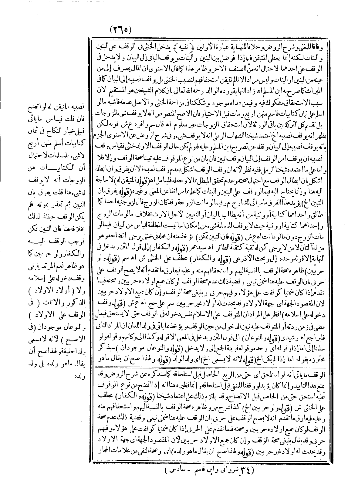 يَدْخُلُ الْخُنْثَى فِي الْوَقْفِ عَلَى الْبَنِينَ وَالْبَنَاتِ لَكِنَّهُ إنَّمَا يُعْطَى الْمُتَيَقِّنُ فِيمَا إذَا فُوضِلَ بَيْنَ الْبَنِينَ وَالْبَنَاتِ، وَيُوقَفُ الْبَاقِي إلَى الْبَيَانِ وَلَا يَدْخُلُ فِي الْوَقْفِ عَلَى أَحَدِهِمَا لِاحْتِمَالِ أَنَّهُ مِنْ الصِّنْفِ الْآخَرِ، وَظَاهِرُ هَذَا كَمَا قَالَ الْإِسْنَوِيُّ أَنَّ الْمَالَ يُصْرَفُ إلَى مَنْ عَيَّنَهُ مِنْ الْبَنِينَ أَوْ الْبَنَاتِ وَلَيْسَ مُرَادًا؛ لِأَنَّا لَمْ نَتَيَقَّنْ اسْتِحْقَاقَهُمْ لِنَصِيبِ الْخُنْثَى بَلْ يُوقَفُ نَصِيبُهُ إلَى الْبَيَانِ كَمَا فِي الْمِيرَاثِ كَمَا صَرَّحَ بِهِ ابْنُ الْمُسْلِمِ اهـ زَادَ النِّهَايَةُ وَرَدَّهُ الْوَالِدُ - رَحِمَهُ اللَّهُ تَعَالَى - بِأَنَّ كَلَامَ الشَّيْخَيْنِ هُوَ الْمُسْتَقِيمُ؛ لِأَنَّ سَبَبَ الِاسْتِحْقَاقِ مَشْكُوكٌ فِيهِ وَفِيمَنْ عَدَاهُ مَوْجُودٌ وَشَكَّكَا فِي مُزَاحَمَةِ الْخُنْثَى، وَالْأَصْلُ عَدَمُهُ فَأَشْبَهَ مَا لَوْ أَسْلَمَ عَلَى ثَمَانِ كِتَابِيَّاتٍ فَأَسْلَمَ مِنْهُنَّ أَرْبَعٌ وَمَاتَ قَبْلَ الِاخْتِيَارِ فَإِنَّ الْأَصَحَّ الْمَنْصُوصَ أَنَّهُ لَا يُوقَفُ شَيْءٌ لِلزَّوْجَاتِ بَلْ تُقْسَمُ كُلُّ التَّرِكَةِ بَيْنَ بَاقِي الْوَرَثَةِ؛ لِأَنَّ اسْتِحْقَاقَ الزَّوْجَاتِ غَيْرُ مَعْلُومٍ اهـ قَالَ سم وَأَقَرَّهُ ع ش قَوْلُهُ لَكِنْ يَظْهَرُ أَنَّهُ يُوقَفُ نَصِيبُهُ إلَخْ اعْتَمَدَ شَيْخُنَا الشِّهَابُ الرَّمْلِيُّ أَنَّهُ لَا يُوقَفُ شَيْءٌ وَفِي شَرْحِ الرَّوْضِ عَنْ الْإِسْنَوِيِّ الْجَزْمُ بِأَنَّهُ يُوقَفُ نَصِيبُهُ إلَى الْبَيَانِ وَنَقَلَهُ عَنْ تَصْرِيحِ ابْنِ الْمُسْلِمِ، وَعَلَيْهِ فَلَوْ لَمْ يَكُنْ حَالَ الْوَقْفِ إلَّا وَلَدٌ خُنْثَى فَقِيَاسُ وَقْفِ نَصِيبِهِ أَنْ يُوقَفَ أَمْرُ الْوَقْفِ إلَى الْبَيَانِ وَقْفَ تَبَيُّنٍ فَإِنْ بَانَ مِنْ نَوْعِ الْمَوْقُوفِ عَلَيْهِ تَبَيَّنَّا صِحَّةَ الْوَقْفِ وَإِلَّا فَلَا وَأَمَّا عَلَى مَا اعْتَمَدَهُ شَيْخُنَا الرَّمْلِيُّ فَفِيهِ نَظَرٌ؛ لِأَنَّهُ إنْ وَقَفَ الْوَقْفَ أُشْكِلَ بِعَدَمِ وَقْفِ نَصِيبِهِ إلَّا أَنْ يُفَرَّقَ وَإِنْ أَبْطَلَهُ أُشْكِلَ بِأَنَّ إبْطَالَ الْوَقْفِ مَعَ احْتِمَالِ صِحَّتِهِ وَعَدَمُ تَحَقُّقِ الْمُبْطِلِ مِمَّا لَا وَجْهَ لَهُ فَلْيُتَأَمَّلْ اهـ