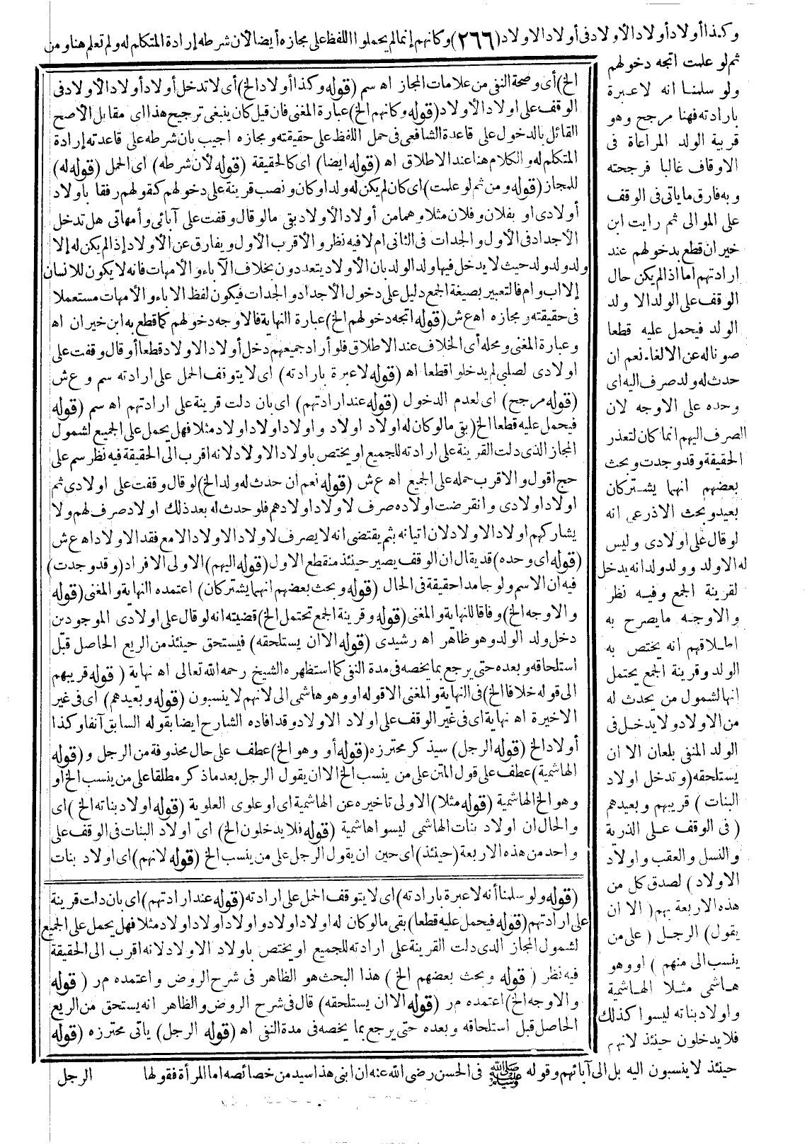 (وَتَدْخُلُ أَوْلَادُ الْبَنَاتِ) قَرِيبُهُمْ وَبَعِيدُهُمْ (فِي الْوَقْفِ عَلَى الذُّرِّيَّةِ وَالنَّسْلِ، وَالْعَقِبِ وَأَوْلَادِ الْأَوْلَادِ) لِصِدْقِ كُلٍّ مِنْ هَذِهِ الْأَرْبَعَةِ بِهِمْ (إلَّا أَنْ يَقُولَ) الرَّجُلُ (عَلَى مَنْ يُنْسَبُ إلَيَّ مِنْهُمْ) ، أَوْ وَهُوَ هَاشِمِيٌّ مَثَلًا الْهَاشِمِيَّةِ وَأَوْلَادُ بَنَاتِهِ لَيْسُوا كَذَلِكَ فَلَا يَدْخُلُونَ حِينَئِذٍ؛ لِأَنَّهُمْ حِينَئِذٍ لَا يُنْسَبُونَ إلَيْهِ بَلْ إلَى آبَائِهِمْ «وَقَوْلُهُ - صَلَّى اللَّهُ عَلَيْهِ وَسَلَّمَ - فِي الْحَسَنِ - رَضِيَ اللَّهُ عَنْهُ - أَنَّ ابْنِي هَذَا سَيِّدٌ» مِنْ خَصَائِصِهِ، أَمَّا الْمَرْأَةُ فَقَوْلُهَا