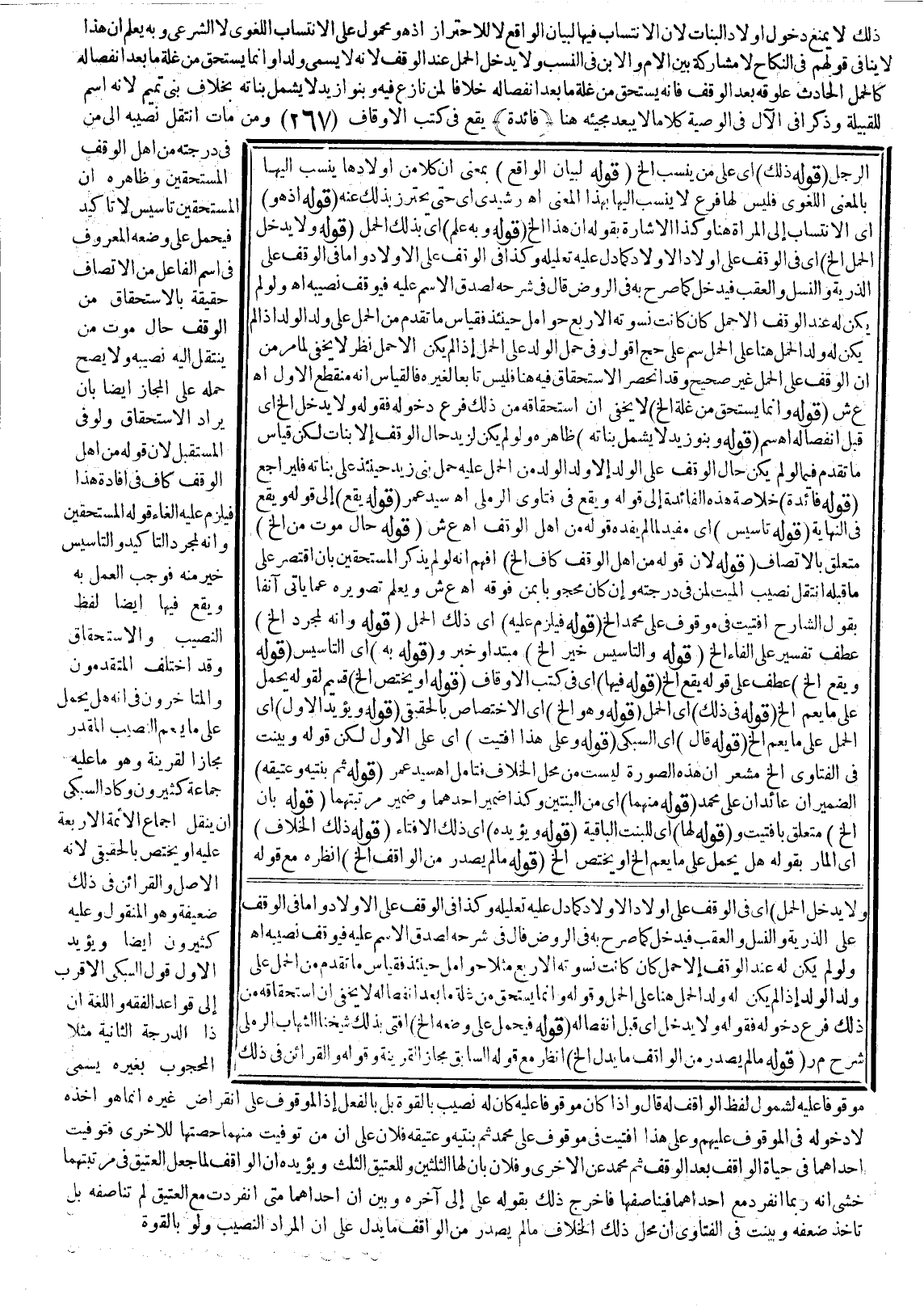 (قَوْلُهُ:؛ لِأَنَّ قَوْلَهُ مِنْ أَهْلِ الْوَقْفِ كَافٍ إلَخْ) أَفْهَمَ أَنَّهُ لَوْ لَمْ يَذْكُرْ الْمُسْتَحَقِّينَ بِأَنْ اقْتَصَرَ عَلَى مَا قَبْلَهُ انْتَقَلَ نَصِيبُ الْمَيِّتِ لِمَنْ فِي دَرَجَتِهِ وَإِنْ كَانَ مَحْجُوبًا بِمَنْ فَوْقَهُ اهـ ع ش وَيُعْلَمُ تَصْوِيرُهُ عَمَّا يَأْتِي آنِفًا بِقَوْلِ الشَّارِحِ أَفْتَيْت فِي مَوْقُوفٍ عَلَى مُحَمَّدٍ إلَخْ (قَوْلُهُ: فَيَلْزَمُ عَلَيْهِ) أَيْ ذَلِكَ الْحَمْلِ (قَوْلُهُ: وَأَنَّهُ لِمُجَرَّدِ إلَخْ) عَطْفُ تَفْسِيرٍ عَلَى الْفَاءِ إلَخْ (قَوْلُهُ: وَالتَّأْسِيسُ خَيْرٌ إلَخْ) مُبْتَدَأٌ وَخَبَرٌ وَ (قَوْلُهُ: بِهِ) أَيْ: التَّأْسِيسِ (قَوْلُهُ وَيَقَعُ إلَخْ) عَطْفٌ عَلَى قَوْلِهِ يَقَعُ إلَخْ (قَوْلُهُ: فِيهَا) أَيْ: فِي كُتُبِ الْأَوْقَافِ (قَوْلُهُ: أَوْ يَخْتَصُّ إلَخْ) قَسِيمٌ لِقَوْلِهِ يُحْمَلُ عَلَى مَا يَعُمُّ إلَخْ (قَوْلُهُ فِي ذَلِكَ) أَيْ: الْحَمْلِ (قَوْلُهُ: وَهُوَ إلَخْ) أَيْ: الِاخْتِصَاصُ بِالْحَقِيقِيِّ (قَوْلُهُ: وَيُؤَيِّدُ الْأَوَّلَ) أَيْ: الْحَمْلَ عَلَى مَا يَعُمُّ إلَخْ (قَوْلُهُ: قَالَ) أَيْ: السُّبْكِيُّ (قَوْلُهُ: وَعَلَى هَذَا أَفْتَيْت) أَيْ: عَلَى الْأَوَّلِ لَكِنْ قَوْلُهُ وَبَيَّنْتُ فِي الْفَتَاوَى إلَخْ مُشْعِرٌ بِأَنَّ هَذِهِ الصُّورَةَ لَيْسَتْ مِنْ مَحَلِّ الْخِلَافِ فَتَأَمَّلْ اهـ سَيِّدٌ عُمَرُ (قَوْلُهُ: ثُمَّ بِنْتَيْهِ وَعَتِيقِهِ) الضَّمِيرَانِ عَائِدَانِ عَلَى مُحَمَّدٍ (قَوْلُهُ: مِنْهُمَا) أَيْ: مِنْ الْبِنْتَيْنِ وَكَذَا ضَمِيرُ أَحَدِهِمَا وَضَمِيرُ مَرْتَبَتِهِمَا (قَوْلُهُ بِأَنَّ إلَخْ) مُتَعَلِّقٌ بِأَفْتَيْت وَ (قَوْلُهُ لَهَا) أَيْ: لِلْبِنْتِ الْبَاقِيَةِ (قَوْلُهُ وَيُؤَيِّدُهُ) أَيْ: ذَلِكَ الْإِفْتَاءَ (قَوْلُهُ ذَلِكَ الْخِلَافُ) أَيْ: الْمَارُّ بِقَوْلِهِ هَلْ يُحْمَلُ عَلَى مَا يَعُمُّ إلَخْ، أَوْ يَخْتَصُّ إلَخْ (قَوْلُهُ: مَا لَمْ يَصْدُرْ مِنْ الْوَاقِفِ إلَخْ) اُنْظُرْ مَعَ قَوْلِهِ
