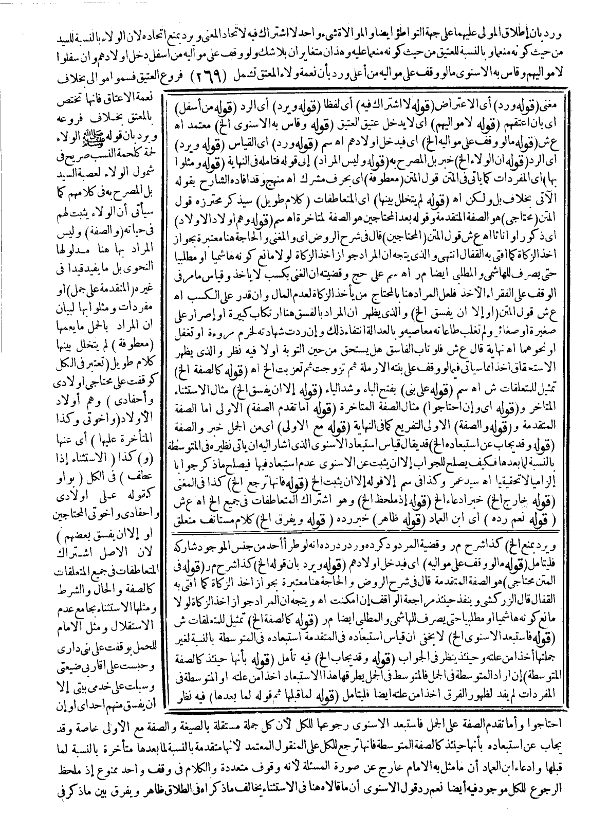 وَرُدَّ بِأَنَّ إطْلَاقَ الْمَوْلَى عَلَيْهِمَا عَلَى جِهَةِ التَّوَاطُؤِ أَيْضًا، وَالْمُوَالَاةُ شَيْءٌ وَاحِدٌ لَا اشْتِرَاكَ فِيهِ لِاتِّحَادِ الْمَعْنَى وَيُرَدُّ بِمَنْعِ اتِّحَادِهِ؛ لِأَنَّ الْوَلَاءَ بِالنِّسْبَةِ لِلسَّيِّدِ مِنْ حَيْثُ كَوْنُهُ مُنْعِمًا وَبِالنِّسْبَةِ لِلْعَتِيقِ مِنْ حَيْثُ كَوْنُهُ مُنْعَمًا عَلَيْهِ وَهَذَانِ مُتَغَايِرَانِ بِلَا شَكٍّ وَلَوْ وَقَفَ عَلَى مَوَالِيهِ مِنْ أَسْفَلَ دَخَلَ أَوْلَادُهُمْ وَإِنْ سَفَلُوا لَا مَوَالِيهِمْ وَقَاسَ بِهِ الْإِسْنَوِيُّ مَا لَوْ وَقَفَ عَلَى مَوَالِيهِ مِنْ أَعْلَى وَرُدَّ بِأَنَّ نِعْمَةَ وَلَاءِ الْمُعْتَقِ تَشْمَلُ فُرُوعَ الْعَتِيقِ فَسُمُّوا مَوَالِيَ بِخِلَافِ نِعْمَةِ الْإِعْتَاقِ فَإِنَّهَا تَخْتَصُّ بِالْمُعْتَقِ بِخِلَافِ فُرُوعِهِ وَيُرَدُّ بِأَنَّ قَوْلَهُ - صَلَّى اللَّهُ عَلَيْهِ وَسَلَّمَ - «الْوَلَاءُ لُحْمَةٌ كَلُحْمَةِ النَّسَبِ» صَرِيحٌ فِي شُمُولِ الْوَلَاءِ لِعَصَبَةِ السَّيِّدِ بَلْ الْمُصَرَّحُ بِهِ فِي كَلَامِهِمْ كَمَا سَيَأْتِي أَنَّ الْوَلَاءَ يَثْبُتُ لَهُمْ فِي حَيَاتِهِ (وَالصِّفَةُ) وَلَيْسَ الْمُرَادُ بِهَا هُنَا مَدْلُولَهَا النَّحْوِيَّ بَلْ مَا يُفِيدُ قَيْدًا فِي غَيْرِهِ (الْمُتَقَدِّمَةُ عَلَى جُمَلٍ) ، أَوْ مُفْرَدَاتٍ وَمَثَّلُوا بِهَا لِبَيَانِ أَنَّ الْمُرَادَ بِالْجُمَلِ مَا يَعُمُّهَا (مَعْطُوفَةٍ) لَمْ يَتَخَلَّلْ بَيْنَهَا كَلَامٌ طَوِيلٌ (تُعْتَبَرُ فِي الْكُلِّ كَوَقْفٍ عَلَى مُحْتَاجِي أَوْلَادِي وَأَحْفَادِي) وَهُمْ أَوْلَادُ الْأَوْلَادِ (وَإِخْوَتِي وَكَذَا الْمُتَأَخِّرَةُ عَلَيْهَا) أَيْ: عَنْهَا.