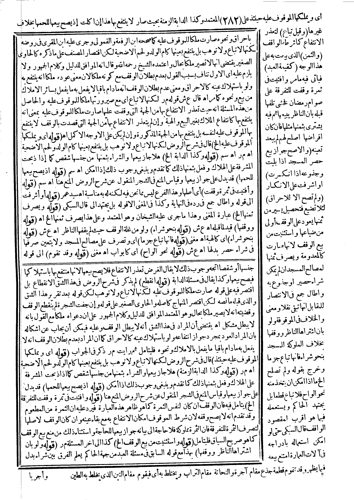 ـــــــــــــــــــــــــــــSجِنْسِهَا أَوْ شِقْصًا اتَّجَهَ وُجُوبُ ذَلِكَ لَا يُقَالُ الْغَرَضُ تَعَذُّرُ الِانْتِفَاعِ فَلَا يَصِحُّ بَيْعُهَا؛ لِأَنَّهَا مُنْتَفَعٌ بِهَا بِاسْتِهْلَاكِهَا فَيَصِحُّ بَيْعُهَا وَكَذَا يُقَالُ فِي مَسْأَلَةِ الدَّابَّةِ (قَوْلُهُ: انْقَطَعَ) لَمْ يَذْكُرْ فِي شَرْحِ الرَّوْضِ فِي هَذَا الشِّقِّ الِانْقِطَاعَ بَلْ اقْتَصَرَ فِيهِ عَلَى قَوْلِهِ صَارَتْ مِلْكًا لِلْمَوْقُوفِ عَلَيْهِ لَكِنَّهَا لَا تُبَاعُ وَلَا تُوهَبُ لَكِنْ قَوْلُهُ بَعْدَ تَقْرِيرِ هَذَا الشِّقِّ وَاَلَّذِي قَبْلَهُ مَا نَصُّهُ لَكِنْ اقْتَصَرَ الْمِنْهَاجُ كَأَصْلِهِ، وَالْحَاوِي الصَّغِيرُ عَلَى قَوْلِهِ وَإِنْ جَفَّتْ الشَّجَرَةُ لَمْ يَنْقَطِعْ الْوَقْفُ وَقَضِيَّتُهُ أَنَّهُ لَا يَصِيرُ مِلْكًا بِحَالٍ وَهُوَ الْمُعْتَمَدُ الْمُوَافِقُ لِلدَّلِيلِ وَكَلَامُ الْجُمْهُورِ عَلَى أَنَّ دَعْوَاهُ مِلْكًا مَعَ الْقَوْلِ بِأَنَّهُ لَا يَبْطُلُ مُشْكِلٌ انْتَهَى يَقْتَضِي أَنَّ الْمُرَادَ فِي هَذَا الشِّقِّ أَنَّهُ لَا يَبْطُلُ الْوَقْفُ وَعَلَيْهِ فَيُمْكِنُ أَنْ يُجَابَ عَنْ إشْكَالِهِ بِأَنَّ الْمُرَادَ الْعَوْدُ بِمُجَرَّدِ جَوَازِ انْتِفَاعِهِ وَلَوْ بِاسْتِهْلَاكِ عَيْنِهِ كَالْإِحْرَاقِ كَمَا أَنَّ الْمُرَادَ بِعَدَمِ بُطْلَانِ الْوَقْفِ أَنَّهُ لَا يَفْعَلُ بِهِ مَا دَامَ بَاقِيًا مَا يَفْعَلُ بِالْأَمْلَاكِ وَنَحْوُهُ فَلْيُتَأَمَّلْ، ثُمَّ رَأَيْت م ر ذَكَرَ ذَلِكَ فِي الْجَوَابِ
