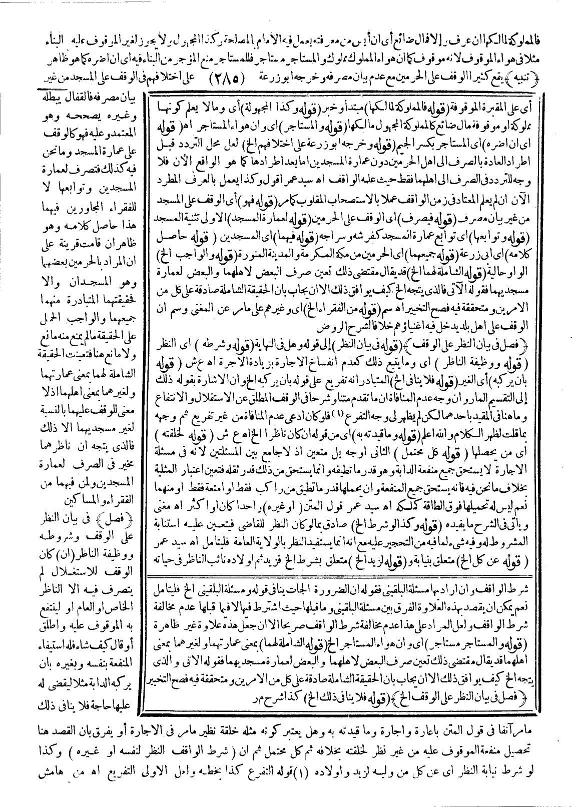 يَقَعُ كَثِيرًا الْوَقْفُ عَلَى الْحَرَمَيْنِ مَعَ عَدَمِ بَيَانِ مَصْرِفِهِ وَخَرَّجَهُ أَبُو زُرْعَةَ عَلَى اخْتِلَافِهِمْ فِي الْوَقْفِ عَلَى الْمَسْجِدِ مِنْ غَيْرِ بَيَانِ مَصْرِفِهِ فَالْقَفَّالُ يُبْطِلُهُ وَغَيْرُهُ يُصَحِّحُهُ وَهُوَ الْمُعْتَمَدُ وَعَلَيْهِ فَهُوَ كَالْوَقْفِ عَلَى عِمَارَةِ الْمَسْجِدِ، وَمَا نَحْنُ فِيهِ كَذَلِكَ فَتُصْرَفُ لِعِمَارَةِ الْمَسْجِدَيْنِ وَتَوَابِعِهَا لَا لِلْفُقَرَاءِ الْمُجَاوِرِينَ فِيهِمَا هَذَا حَاصِلُ كَلَامِهِ وَهُوَ ظَاهِرٌ إنْ قَامَتْ قَرِينَةٌ عَلَى أَنَّ الْمُرَادَ بِالْحَرَمَيْنِ بَعْضُهُمَا وَهُوَ الْمَسْجِدَانِ وَإِلَّا فَحَقِيقَتُهُمَا الْمُتَبَادَرَةُ مِنْهُمَا جَمِيعُهُمَا، وَالْوَاجِبُ الْحَمْلُ عَلَى الْحَقِيقَةِ مَا لَمْ يَمْنَعْ مِنْهُ مَانِعٌ وَلَا مَانِعَ هُنَا فَتَعَيَّنَتْ الْحَقِيقَةُ الشَّامِلَةُ لَهُمَا بِمَعْنَى عِمَارَتِهِمَا وَلِغَيْرِهِمَا بِمَعْنَى أَهْلِهِمَا إذْ لَا مَعْنَى لِلْوَقْفِ عَلَيْهِمَا بِالنِّسْبَةِ لِغَيْرِ مَسْجِدَيْهِمَا إلَّا ذَلِكَ فَاَلَّذِي يُتَّجَهُ أَنَّ نَاظِرَهُمَا مُخَيَّرٌ فِي الصَّرْفِ لِعِمَارَةِ الْمَسْجِدَيْنِ وَلِمَنْ فِيهَا مِنْ الْفُقَرَاءِ، وَالْمَسَاكِينِ.