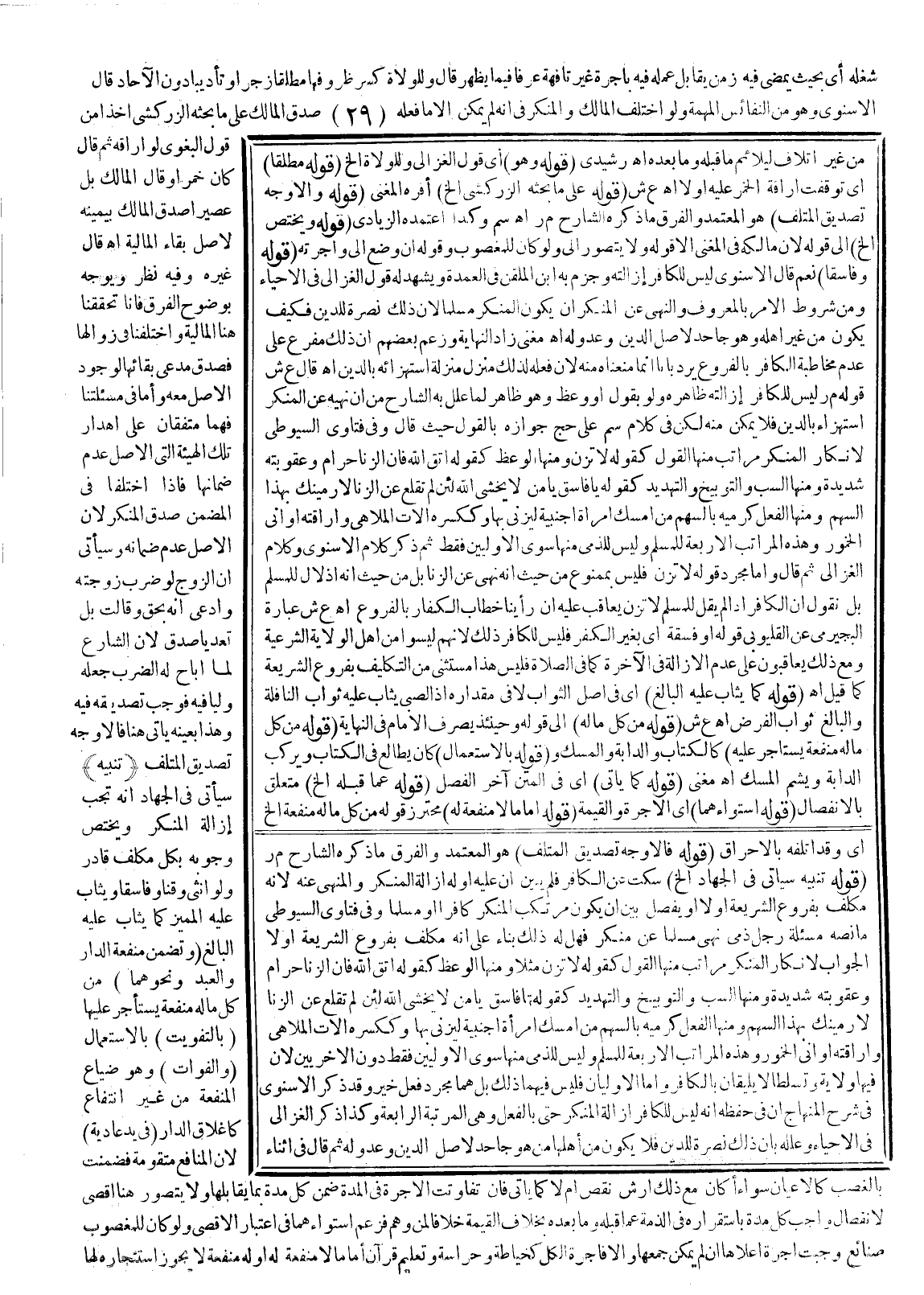(قَوْلُهُ تَنْبِيهٌ سَيَأْتِي فِي الْجِهَادِ إلَخْ) سَكَتَ عَنْ الْكَافِرِ فَلَمْ يُبَيِّنْ أَنَّ عَلَيْهِ أَوْ لَهُ إزَالَةُ الْمُنْكَرِ وَالْمَنْهِيِّ عَنْهُ؛ لِأَنَّهُ مُكَلَّفٌ بِفُرُوعِ الشَّرِيعَةِ أَوَّلًا أَوْ يُفَصَّلُ بَيْنَ أَنْ يَكُونَ مُرْتَكِبُ الْمُنْكَرِ كَافِرًا أَوْ مُسْلِمًا وَفِي فَتَاوَى السُّيُوطِيّ مَا نَصُّهُ مَسْأَلَةٌ رَجُلٌ ذِمِّيٌّ نَهَى مُسْلِمًا عَنْ مُنْكَرٍ فَهَلْ لَهُ ذَلِكَ بِنَاءً عَلَى أَنَّهُ مُكَلَّفٌ بِفُرُوعِ الشَّرِيعَةِ أَوْ لَا الْجَوَابُ لِإِنْكَارِ الْمُنْكَرِ مَرَاتِبُ: مِنْهَا الْقَوْلُ كَقَوْلِهِ لَا تَزْنِ مَثَلًا، وَمِنْهَا الْوَعْظُ كَقَوْلِهِ اتَّقِ اللَّهَ فَإِنَّ الزِّنَا حَرَامٌ وَعُقُوبَتُهُ شَدِيدَةٌ وَمِنْهَا السَّبُّ وَالتَّوْبِيخُ وَالتَّهْدِيدُ كَقَوْلِهِ يَا فَاسِقُ يَا مَنْ لَا يَخْشَى اللَّهَ لَئِنْ لَمْ تُقْلِعْ عَنْ الزِّنَا لِأَرْمِيَنك بِهَذَا السَّهْمِ وَمِنْهَا الْفِعْلُ كَرَمْيِهِ بِالسَّهْمِ مَنْ أَمْسَكَ امْرَأَةً أَجْنَبِيَّةً لِيَزْنِيَ بِهَا وَكَكَسْرِهِ آلَاتِ الْمَلَاهِي وَإِرَاقَتِهِ أَوَانِيَ الْخُمُورِ وَهَذِهِ الْمَرَاتِبُ الْأَرْبَعَةُ لِلْمُسْلِمِ وَلَيْسَ لِلذِّمِّيِّ مِنْهَا سِوَى الْأُولَيَيْنِ فَقَطْ دُونَ الْأُخْرَيَيْنِ؛ لِأَنَّ فِيهَا وِلَايَةً وَتَسَلُّطًا لَا يَلِيقَانِ بِالْكَافِرِ وَأَمَّا الْأُولَيَانِ فَلَيْسَ فِيهِمَا ذَلِكَ بَلْ هُمَا مُجَرَّدُ فِعْلِ خَيْرٍ وَقَدْ ذَكَرَ الْإِسْنَوِيُّ فِي شَرْحِ الْمِنْهَاجِ أَنَّ فِي حِفْظِهِ أَنَّهُ لَيْسَ لِلْكَافِرِ إزَالَةُ الْمُنْكَرِ حَتَّى بِالْفِعْلِ وَهِيَ الْمَرْتَبَةُ الرَّابِعَةُ، وَكَذَا ذَكَرَ الْغَزَالِيُّ فِي الْإِحْيَاءِ وَعَلَّلَهُ بِأَنَّ ذَلِكَ نُصْرَةٌ لِلدِّينِ فَلَا يَكُونُ مِنْ أَهْلِهَا مَنْ هُوَ جَاحِدٌ لِأَصْلِ الدِّينِ وَعَدُوٌّ لَهُ ثُمَّ قَالَ فِي أَثْنَاءِ