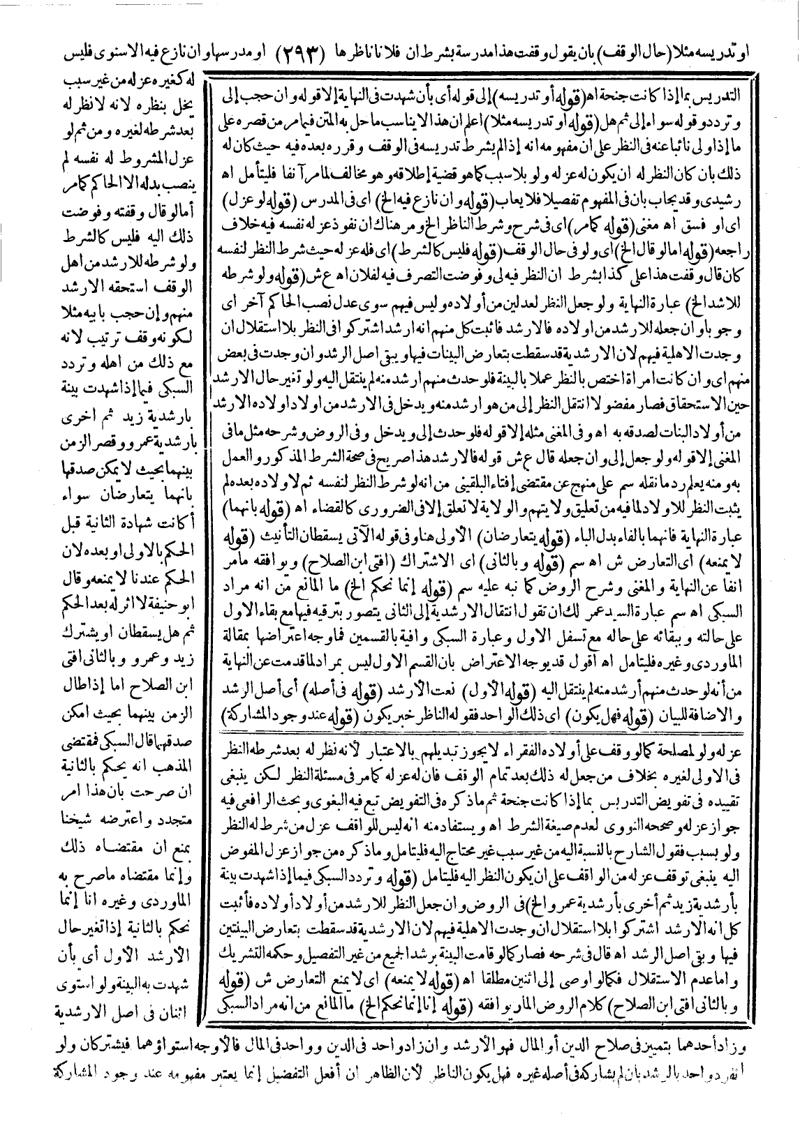 أَمَّا لَوْ قَالَ وَقَفْتُهُ وَفَوَّضْت ذَلِكَ إلَيْهِ فَلَيْسَ كَالشَّرْطِ وَلَوْ شَرَطَهُ لِلْأَرْشَدِ مِنْ أَهْلِ الْوَقْفِ اسْتَحَقَّهُ الْأَرْشَدُ مِنْهُمْ وَإِنْ حُجِبَ بِأَبِيهِ مَثَلًا لِكَوْنِهِ وَقْفُ تَرْتِيبٍ؛ لِأَنَّهُ مَعَ ذَلِكَ مِنْ أَهْلِهِ وَتَرَدَّدَ السُّبْكِيُّ فِيمَا إذَا شَهِدَتْ بَيِّنَةٌ بِأَرْشَدِيَّةِ زَيْدٍ، ثُمَّ أُخْرَى بِأَرْشَدِيَّةِ عَمْرٍو وَقَصُرَ الزَّمَنُ بَيْنَهُمَا بِحَيْثُ لَا يُمْكِنُ صِدْقُهُمَا بِأَنَّهُمَا يَتَعَارَضَانِ سَوَاءٌ أَكَانَتْ شَهَادَةُ الثَّانِيَةِ قَبْلَ الْحُكْمِ بِالْأُولَى، أَوْ بَعْدَهُ؛ لِأَنَّ الْحُكْمَ عِنْدَنَا لَا يَمْنَعُهُ وَقَالَ أَبُو حَنِيفَةَ لَا أَثَرَ لَهُ بَعْدَ الْحُكْمِ، ثُمَّ هَلْ يَسْقُطَانِ أَوْ يَشْتَرِكُ زَيْدٌ وَعَمْرٌو وَبِالثَّانِي أَفْتَى ابْنُ الصَّلَاحِ، أَمَّا إذَا طَالَ الزَّمَنُ بَيْنَهُمَا بِحَيْثُ أَمْكَنَ صِدْقُهُمَا قَالَ السُّبْكِيُّ فَمُقْتَضَى الْمَذْهَبِ أَنَّهُ يَحْكُمُ بِالثَّانِيَةِ إنْ صَرَّحَتْ بِأَنَّ هَذَا أَمْرٌ مُتَجَدِّدٌ وَاعْتَرَضَهُ شَيْخُنَا بِمَنْعِ أَنَّ مُقْتَضَاهُ ذَلِكَ وَإِنَّمَا مُقْتَضَاهُ مَا صَرَّحَ بِهِ الْمَاوَرْدِيُّ وَغَيْرُهُ أَنَّا إنَّمَا نَحْكُمُ بِالثَّانِيَةِ إذَا تَغَيَّرَ حَالُ الْأَرْشَدِ الْأَوَّلِ أَيْ: بِأَنْ شَهِدَتْ بِهِ الْبَيِّنَةُ وَلَوْ اسْتَوَى اثْنَانِ فِي أَصْلِ الْأَرْشَدِيَّةِ وَزَادَ أَحَدُهُمَا بِتَمْيِيزٍ فِي صَلَاحِ الدِّينِ أَوْ الْمَالِ فَهُوَ الْأَرْشَدُ وَإِنْ زَادَ وَاحِدٌ فِي الدِّينِ وَوَاحِدٌ فِي الْمَالِ فَالْأَوْجَهُ اسْتِوَاؤُهُمَا فَيَشْتَرِكَانِ وَلَوْ انْفَرَدَ وَاحِدٌ بِالرُّشْدِ بِأَنْ لَمْ يُشَارِكْهُ فِي أَصْلِهِ غَيْرُهُ فَهَلْ يَكُونُ النَّاظِرَ؛ لِأَنَّ الظَّاهِرَ أَنَّ أَفْعَلَ التَّفْضِيلِ إنَّمَا يُعْتَبَرُ مَفْهُومُهُ عِنْدَ وُجُودِ الْمُشَارَكَةِ
