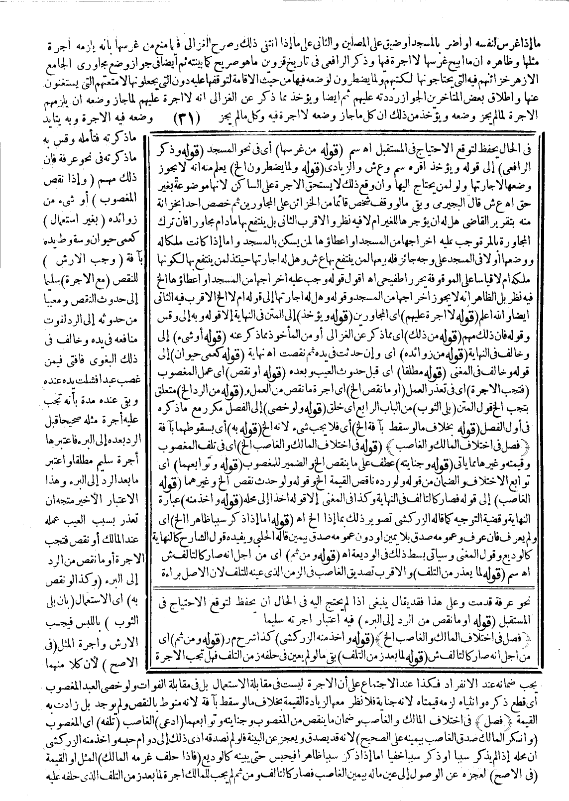 وَصَرَّحَ الْغَزَالِيُّ فِيمَا مُنِعَ مِنْ غَرْسِهَا بِأَنَّهُ يَلْزَمُهُ أُجْرَةُ مِثْلِهَا وَظَاهِرُهُ أَنَّ مَا أُبِيحَ غَرْسُهَا لَا أُجْرَةَ فِيهَا وَذَكَرَ الرَّافِعِيُّ فِي تَارِيخِ قَزْوِينَ مَا هُوَ صَرِيحٌ كَمَا بَيَّنْته ثَمَّ أَيْضًا فِي جَوَازِ وَضْعِ مُجَاوِرِي الْجَامِعِ الْأَزْهَرِ خَزَائِنَهُمْ فِيهِ الَّتِي يَحْتَاجُونَهَا لِكُتُبِهِمْ وَلِمَا يُضْطَرُّونَ لِوَضْعِهِ فِيهَا مِنْ حَيْثُ الْإِقَامَةُ لِتَوَقُّفِهَا عَلَيْهِ دُونَ الَّتِي يَجْعَلُونَهَا لِأَمْتِعَتِهِمْ الَّتِي يَسْتَغْنُونَ عَنْهَا وَإِطْلَاقُ بَعْضِ الْمُتَأَخِّرِينَ الْجَوَازَ رَدَدْته عَلَيْهِمْ ثَمَّ أَيْضًا وَيُؤْخَذُ مِمَّا ذُكِرَ عَنْ الْغَزَالِيِّ أَنَّهُ لَا أُجْرَةَ عَلَيْهِمْ لِمَا جَازَ وَضْعُهُ وَأَنَّهُ يَلْزَمُهُمْ الْأُجْرَةُ لِمَا لَمْ يَجُزْ وَضْعُهُ وَيُؤْخَذُ مِنْ ذَلِكَ أَنَّ كُلَّ مَا جَازَ وَضْعُهُ لَا أُجْرَةَ فِيهِ وَكُلَّ مَا لَمْ يَجُزْ وَضْعُهُ فِيهِ الْأُجْرَةُ وَبِهِ يَتَأَيَّدُ مَا ذَكَرْته فَتَأَمَّلْهُ وَقِسْ بِهِ مَا ذَكَرْته فِي نَحْوِ عَرَفَةَ فَإِنَّ ذَلِكَ مُهِمٌّ.
