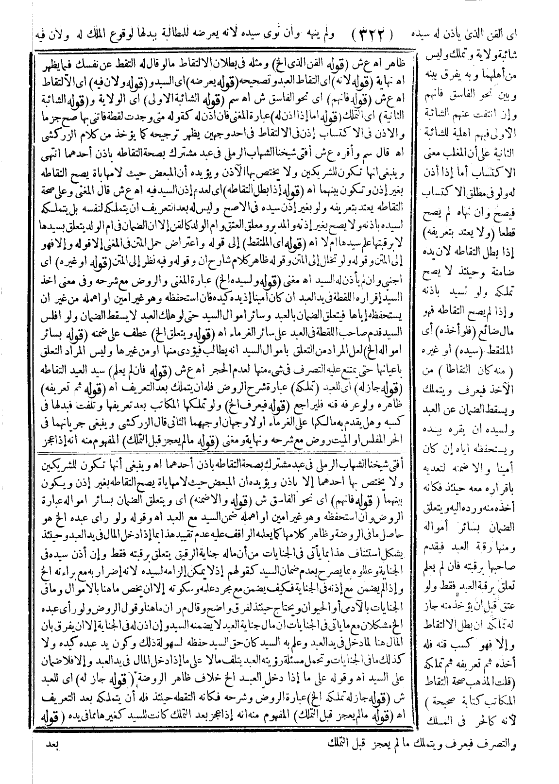 ـــــــــــــــــــــــــــــSأَفْتَى شَيْخُنَا الشِّهَابُ الرَّمْلِيُّ فِي عَبْدٍ مُشْتَرَكٍ بِصِحَّةِ الْتِقَاطِهِ بِإِذْنِ أَحَدِهِمَا اهـ وَيَنْبَغِي أَنَّهَا تَكُونُ لِلشَّرِيكَيْنِ وَلَا يَخْتَصُّ بِهَا أَحَدُهُمَا إلَّا بِإِذْنٍ وَيُؤَيِّدُهُ أَنَّ الْمُبَعَّضَ حَيْثُ لَا مُهَايَأَةَ يَصِحُّ الْتِقَاطُهُ بِغَيْرِ إذْنٍ وَيَكُونُ بَيْنَهُمَا (قَوْلُهُ فَإِنَّهُمْ) أَيْ نَحْوُ الْفَاسِقِ ش (قَوْلُهُ وَإِلَّا ضَمِنَهُ) أَيْ وَيَتَعَلَّقُ الضَّمَانُ بِسَائِرِ أَمْوَالِهِ عِبَارَةُ الرَّوْضِ وَإِنْ اسْتَحْفَظَهُ وَهُوَ غَيْرُ أَمِينٍ أَوْ أَهْمَلَهُ ضَمِنَ السَّيِّدُ مَعَ الْعَبْدِ اهـ وَقَوْلُهُ وَلَوْ رَأَى عَبْدَهُ إلَخْ هُوَ حَاصِلُ مَا فِي الرَّوْضَةِ وَظَاهِرُ كَلَامِهَا كَمَا يَعْلَمُهُ الْوَاقِفُ عَلَيْهِ عَدَمُ تَقْيِيدِ هَذَا بِمَا إذَا دَخَلَ الْمَالُ فِي يَدِ الْعَبْدِ وَحِينَئِذٍ يُشْكِلُ اسْتِئْنَافُ هَذَا بِمَا يَأْتِي فِي الْجِنَايَاتِ مِنْ أَنَّ مَالَ جِنَايَةِ الرَّقِيقِ يَتَعَلَّقُ بِرَقَبَتِهِ فَقَطْ وَإِنْ أَذِنَ سَيِّدُهُ فِي الْجِنَايَةِ وَعَلَّلُوهُ بِمَا يُصَرِّحُ بِعَدَمِ ضَمَانِ السَّيِّدِ كَقَوْلِهِمْ إذْ لَا يُمْكِنُ إلْزَامُهُ لِسَيِّدِهِ؛ لِأَنَّهُ إضْرَارٌ بِهِ مَعَ بَرَاءَتِهِ إلَخْ وَإِذَا لَمْ يَضْمَنْ مَعَ إذْنِهِ فِي الْجِنَايَةِ فَكَيْفَ يَضْمَنُ مَعَ مُجَرَّدِ عِلْمِهِ وَسُكُوتِهِ إلَّا أَنْ يُخَصَّ مَا هُنَا بِالْأَمْوَالِ وَمَا فِي الْجِنَايَاتِ بِالْآدَمِيِّ أَوْ الْحَيَوَانِ وَيَحْتَاجُ حِينَئِذٍ لِفَرْقٍ وَاضِحٍ فَلْيُتَأَمَّلْ وَقَالَ م ر إنَّ مَا هُنَا وَقَوْلُ الرَّوْضِ وَلَوْ رَأَى عَبْدَهُ إلَخْ مُشْكِلَانِ مَعَ مَا يَأْتِي فِي الْجِنَايَاتِ أَنَّ مَالَ جِنَايَةِ الْعَبْدِ لَا يَضْمَنُهُ السَّيِّدُ وَإِنْ أَذِنَ لَهُ فِي الْجِنَايَةِ إلَّا أَنْ يُفَرَّقَ بِأَنَّ الْمَالَ هُنَا لَمَّا دَخَلَ فِي يَدِ الْعَبْدِ وَعَلِمَ بِهِ السَّيِّدُ كَانَ حَقُّ السَّيِّدِ حِفْظَهُ لِسُهُولَةِ ذَلِكَ وَكَوْنُ يَدِ عَبْدِهِ كَيَدِهِ وَلَا كَذَلِكَ مَا فِي الْجِنَايَاتِ وَتُحْمَلُ مَسْأَلَةُ رُؤْيَتِهِ الْعَبْدَ يُتْلِفُ مَالًا عَلَى مَا إذَا دَخَلَ الْمَالُ فِي يَدِ الْعَبْدِ وَإِلَّا فَلَا ضَمَانَ عَلَى السَّيِّدِ اهـ.