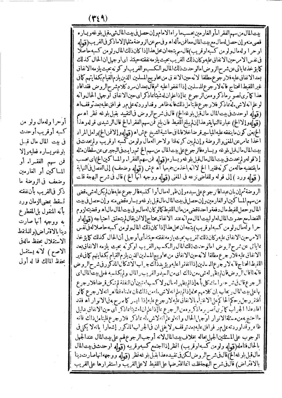 (قَوْلُهُ أَوْ حُرًّا وَلَهُ مَالٌ وَلَوْ مِنْ كَسْبِهِ أَوْ قَرِيبٍ) يُتَّجَهُ أَنَّ مَحَلَّ هَذَا إذَا كَانَ ذَلِكَ الْمَالُ وَلَوْ مِنْ كَسْبِهِ حَاصِلًا لَهُ فِي نَفْسِ الْأَمْرِ حِينَ الْإِنْفَاقِ عَلَيْهِ وَكَانَ ذَلِكَ الْقَرِيبُ بِحَيْثُ يَلْزَمُهُ نَفَقَتُهُ حِينَئِذٍ أَيْ أَوْ جَهِلَ أَنَّ الْحَالَ كَذَلِكَ كَمَا يُؤْخَذُ مِمَّا يَأْتِي عَنْ شَرْحِ الرَّوْضِ أَمَّا لَوْ حَدَثَ ذَلِكَ الْمَالُ وَالْكَسْبُ وَالْقَرِيبُ أَوْ كَوْنُهُ بِحَيْثُ يَلْزَمُهُ الْإِنْفَاقُ بَعْدَ الْإِنْفَاقِ عَلَيْهِ فَلَا رُجُوعَ مُطْلَقًا؛ لِأَنَّهُ حِينَ الْإِنْفَاقِ مِنْ مَحَاوِيجِ الْمُسْلِمِينَ الَّذِينَ يَلْزَمُ الْقِيَامُ بِكِفَايَتِهِمْ كَمَا فِي غَيْرِ اللَّقِيطِ الْمُحْتَاجِ فَإِنَّهُ لَا رُجُوعَ لِلْمُسْلِمِينَ إذَا أَنْفَقُوا عَلَيْهِ وَيُؤَيِّدُ ذَلِكَ جَوَابَ الْإِشْكَالِ الْمَذْكُورِ فِي شَرْحِ الرَّوْضِ فَإِنَّهُ لَمَّا قَالَ الرَّوْضُ فَإِنْ لَمْ يَظْهَرْ لَهُ شَيْءٌ مِنْ ذَلِكَ أَيْ مِنْ السَّيِّدِ وَالْقَرِيبِ وَالْمَالِ وَلَمْ يَكْتَسِبْهُ فَعَلَى بَيْتِ الْمَالِ أَيْ الرُّجُوعُ قَالَ فِي شَرْحِهِ وَاسْتَشْكَلَ بِأَنَّهُ إذَا لَمْ يَظْهَرْ لَهُ مَالٌ وَلَا كَسْبَ لَهُ تَبَيَّنَ أَنَّ النَّفَقَةَ لَمْ تَكُنْ قَرْضًا فَلَا رُجُوعَ بِهَا عَلَى بَيْتِ الْمَالِ وَيُجَابُ بِأَنَّ كَلَامَهُمْ مَحَلُّهُ إذَا لَمْ يُعْلَمْ أَنَّهُ لَا شَيْءَ لَهُ مِنْ ذَلِكَ فَإِنْ عَلِمْنَاهُ فَظَاهِرٌ أَنَّهُ لَا رُجُوعَ كَمَا لَوْ افْتَقَرَ رَجُلٌ وَحَكَمَ الْحَاكِمُ عَلَى الْأَغْنِيَاءِ بِالْإِنْفَاقِ عَلَيْهِ لَا رُجُوعَ عَلَيْهِ إذَا أَيْسَرَ كَمَا صَرَّحَ بِهِ فِي الْأَنْوَارِ انْتَهَى فَقَدْ أَفَادَ هَذَا الْجَوَابُ كَمَا تَرَى تَصْوِيرَ مَا ذَكَرُوهُ مِنْ الرُّجُوعِ بِمَا إذَا عَلِمَ أَنَّ لَهُ شَيْئًا مِمَّا ذُكِرَ أَيْ حِينَ الْإِنْفَاقِ بِدَلِيلِ مَا احْتَجَّ بِهِ مِنْ مَسْأَلَةِ الْأَنْوَارِ أَوْ جَهِلَ الْحَالَ وَأَنَّهُ لَوْ عَلِمَ أَنَّهُ لَا شَيْءَ لَهُ مِمَّا ذُكِرَ فَلَا رُجُوعَ فَلْيُتَأَمَّلْ ذَلِكَ فَإِنَّهُ ظَاهِرٌ وَقَدْ أَوْرَدْته عَلَى م ر فَوَافَقَ عَلَيْهِ بَعْدَ تَوَقُّفٍ وَلَا يَخْفَى أَنَّ فِي الْجَوَابِ الْمَذْكُورِ إشْعَارًا بِأَنَّهُ لَا يَكْفِي فِي الْوُجُوبِ عَلَى الْمَسْأَلَتَيْنِ الْجَهْلُ بِحَالِهِ بِخِلَافِ بَيْتِ الْمَالِ؛ لِأَنَّهُ أَوْجَبَ الرُّجُوعَ لَهُمْ عَلَى بَيْتِ الْمَالِ عِنْدَ الْجَهْلِ بِالْحَالِ فَتَأَمَّلْهُ.