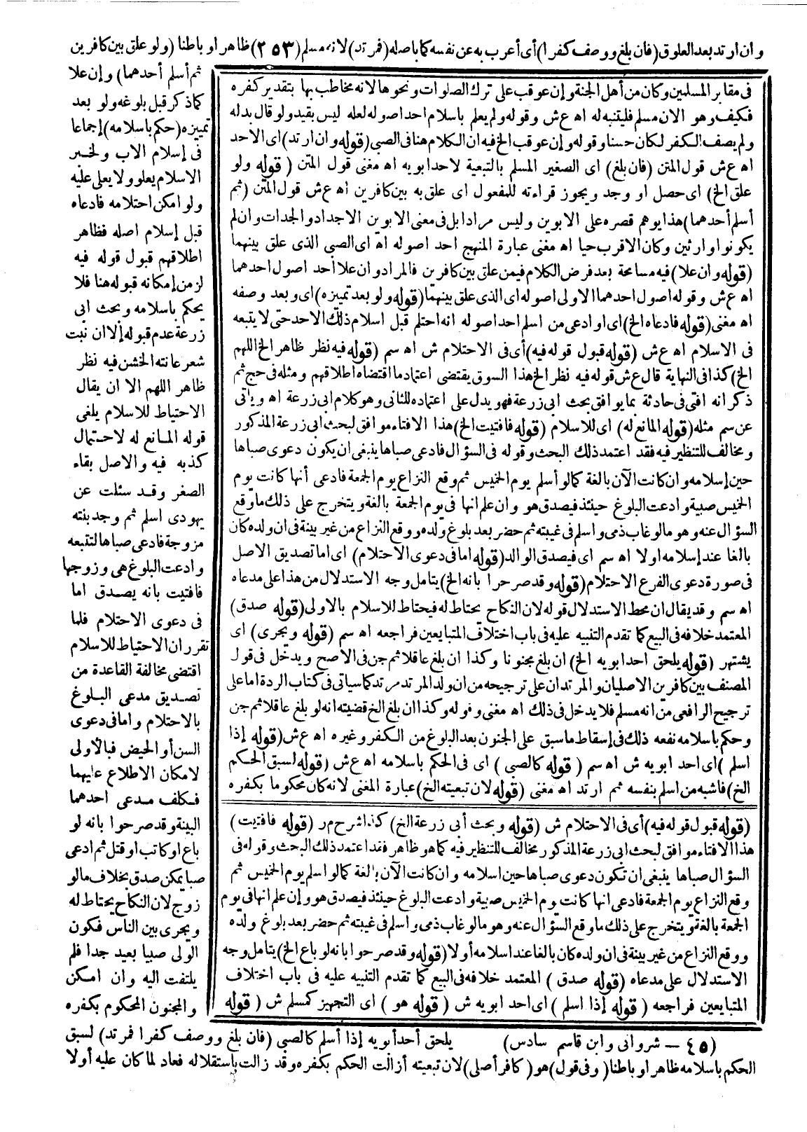 (قَوْلُهُ الْمَانِعُ لَهُ) أَيْ لِلْإِسْلَامِ (قَوْلُهُ فَأَفْتَيْت إلَخْ) هَذَا الْإِفْتَاءُ مُوَافِقٌ لِبَحْثِ أَبِي زُرْعَةَ الْمَذْكُورِ وَمُخَالِفٌ لِلتَّنْظِيرِ فِيهِ فَقَدْ اعْتَمَدَ ذَلِكَ الْبَحْثَ وَقَوْلُهُ فِي السُّؤَالِ فَادَّعَى صِبَاهَا يَنْبَغِي أَنْ يَكُونَ دَعْوَى صِبَاهَا حِينَ إسْلَامِهِ وَإِنْ كَانَتْ الْآنَ بَالِغَةً كَمَا لَوْ أَسْلَمَ يَوْمَ الْخَمِيسِ ثُمَّ وَقَعَ النِّزَاعُ يَوْمَ الْجُمُعَةِ فَادَّعَى أَنَّهَا كَانَتْ يَوْمَ الْخَمِيسِ صَبِيَّةً وَادَّعَتْ الْبُلُوغَ حِينَئِذٍ فَيُصَدَّقُ هُوَ وَإِنْ عُلِمَ أَنَّهَا فِي يَوْمِ الْجُمُعَةِ بَالِغَةً وَيَتَخَرَّجُ عَلَى ذَلِكَ مَا وَقَعَ السُّؤَالُ عَنْهُ وَهُوَ مَا لَوْ غَابَ ذِمِّيٌّ وَأَسْلَمَ فِي غَيْبَتِهِ ثُمَّ حَضَرَ بَعْدَ بُلُوغِ وَلَدِهِ وَوَقَعَ النِّزَاعُ مِنْ غَيْرِ بَيِّنَةٍ فِي أَنَّ وَلَدَهُ كَانَ بَالِغًا عِنْدَ إسْلَامِهِ أَوْ لَا اهـ سم أَيْ فَيُصَدَّقُ الْوَالِدُ (قَوْلُهُ أَمَّا فِي دَعْوَى الِاحْتِلَامِ) أَيْ أَمَّا تَصْدِيقُ الْأَصْلِ فِي صُورَةِ دَعْوَى الْفَرْعِ الِاحْتِلَامَ (قَوْلُهُ وَقَدْ صَرَّحُوا بِأَنَّهُ إلَخْ) يُتَأَمَّلُ وَجْهُ الِاسْتِدْلَالِ مِنْ هَذَا عَلَى مُدَّعَاهُ اهـ سم وَقَدْ يُقَالُ إنَّ مَحَطَّ الِاسْتِدْلَالِ قَوْلُهُ؛ لِأَنَّ النِّكَاحَ يُحْتَاطُ لَهُ فَيُحْتَاطُ لِلْإِسْلَامِ بِالْأَوْلَى (قَوْلُهُ صُدِّقَ) الْمُعْتَمَدُ خِلَافُهُ فِي الْبَيْعِ كَمَا تَقَدَّمَ التَّنْبِيهُ عَلَيْهِ فِي بَابِ اخْتِلَافِ الْمُتَبَايِعَيْنِ فَرَاجِعْهُ اهـ سم (قَوْلُهُ وَيَجْرِي) أَيْ يَشْتَهِرُ (قَوْلُهُ يُلْحَقُ أَحَدُ أَبَوَيْهِ إلَخْ) إنْ بَلَغَ مَجْنُونًا وَكَذَا إنْ بَلَغَ عَاقِلًا ثُمَّ جُنَّ فِي الْأَصَحِّ وَيَدْخُلُ فِي قَوْلِ الْمُصَنِّفِ بَيْنَ كَافِرَيْنِ الْأَصْلِيَّانِ وَالْمُرْتَدَّانِ عَلَى تَرْجِيحِهِ مِنْ أَنَّ وَلَدَ الْمُرْتَدِّ مُرْتَدٌّ كَمَا سَيَأْتِي فِي كِتَابِ الرِّدَّةِ أَمَّا عَلَى تَرْجِيحِ الرَّافِعِيِّ مِنْ أَنَّهُ مُسْلِمٌ فَلَا يَدْخُلُ فِي ذَلِكَ اهـ مُغْنِي وَقَوْلُهُ وَكَذَا إنْ بَلَغَ إلَخْ قَضِيَّتُهُ أَنَّهُ لَوْ بَلَغَ عَاقِلًا ثُمَّ جُنَّ وَحُكِمَ بِإِسْلَامِهِ نَفَعَهُ ذَلِكَ فِي إسْقَاطِ مَا سَبَقَ عَلَى الْجُنُونِ بَعْدَ الْبُلُوغِ مِنْ الْكُفْرِ وَغَيْرِهِ اهـ ع ش.