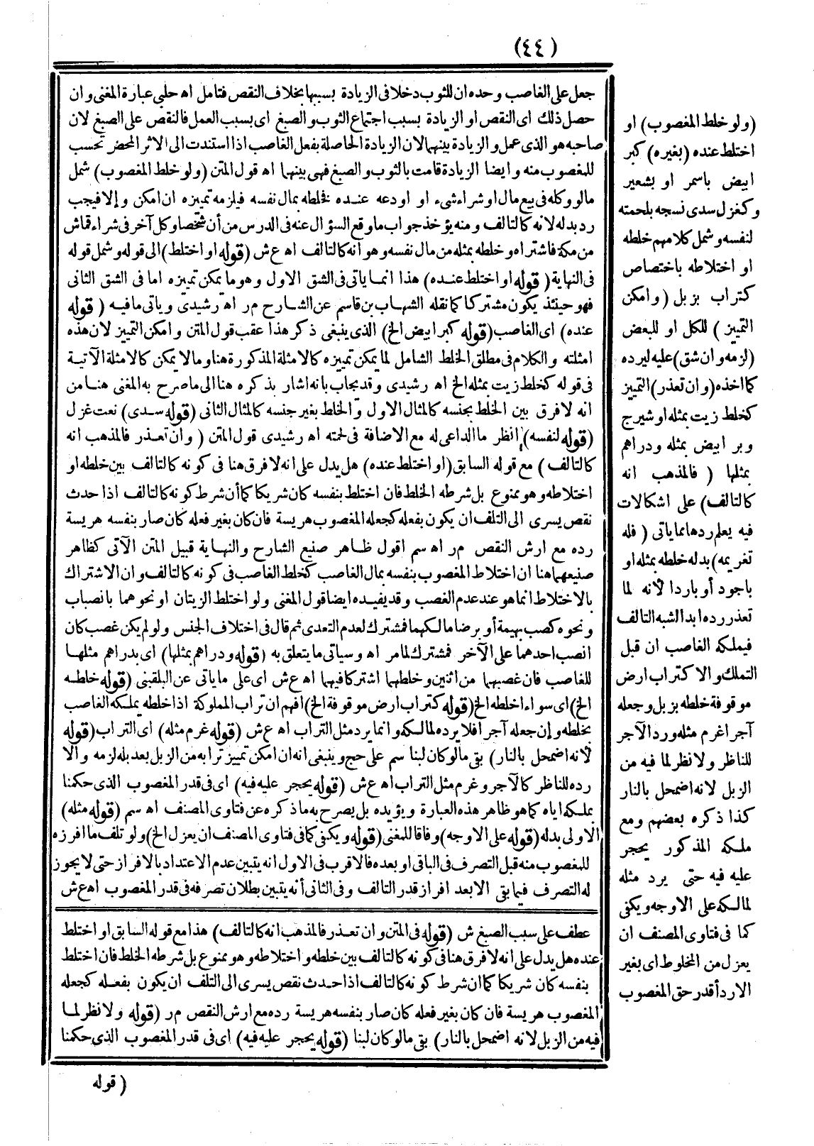 (قَوْلُهُ فِي الْمَتْنِ وَإِنْ تَعَذَّرَ فَالْمَذْهَبُ أَنَّهُ كَالتَّالِفِ) هَذَا مَعَ قَوْلِهِ السَّابِقِ أَوْ اخْتَلَطَ عِنْدَهُ هَلْ يَدُلُّ عَلَى أَنَّهُ لَا فَرْقَ هُنَا فِي كَوْنِهِ كَالتَّالِفِ بَيْنَ خَلْطِهِ وَاخْتِلَاطِهِ وَهُوَ مَمْنُوعٌ بَلْ شَرْطُهُ الْخَلْطُ فَإِنْ اخْتَلَطَ بِنَفْسِهِ كَانَ شَرِيكًا كَمَا أَنَّ شَرْطَ كَوْنِهِ كَالتَّالِفِ إذَا حَدَثَ نَقْصٌ يَسْرِي إلَى التَّلَفِ أَنْ يَكُونَ بِفِعْلِهِ كَجَعْلِهِ الْمَغْصُوبَ هَرِيسَةً فَإِنْ كَانَ بِغَيْرِ فِعْلِهِ كَأَنْ صَارَ بِنَفْسِهِ هَرِيسَةً رَدَّهُ مَعَ أَرْشِ النَّقْصِ م ر (قَوْلُهُ وَلَا نَظَرَ لِمَا فِيهِ مِنْ الزِّبْلِ؛ لِأَنَّهُ اضْمَحَلَّ بِالنَّارِ) بَقِيَ لَوْ كَانَ لَبِنًا (قَوْلُهُ يُحْجَرُ عَلَيْهِ فِيهِ) أَيْ فِي قَدْرِ الْمَغْصُوبِ الَّذِي حَكَمْنَا