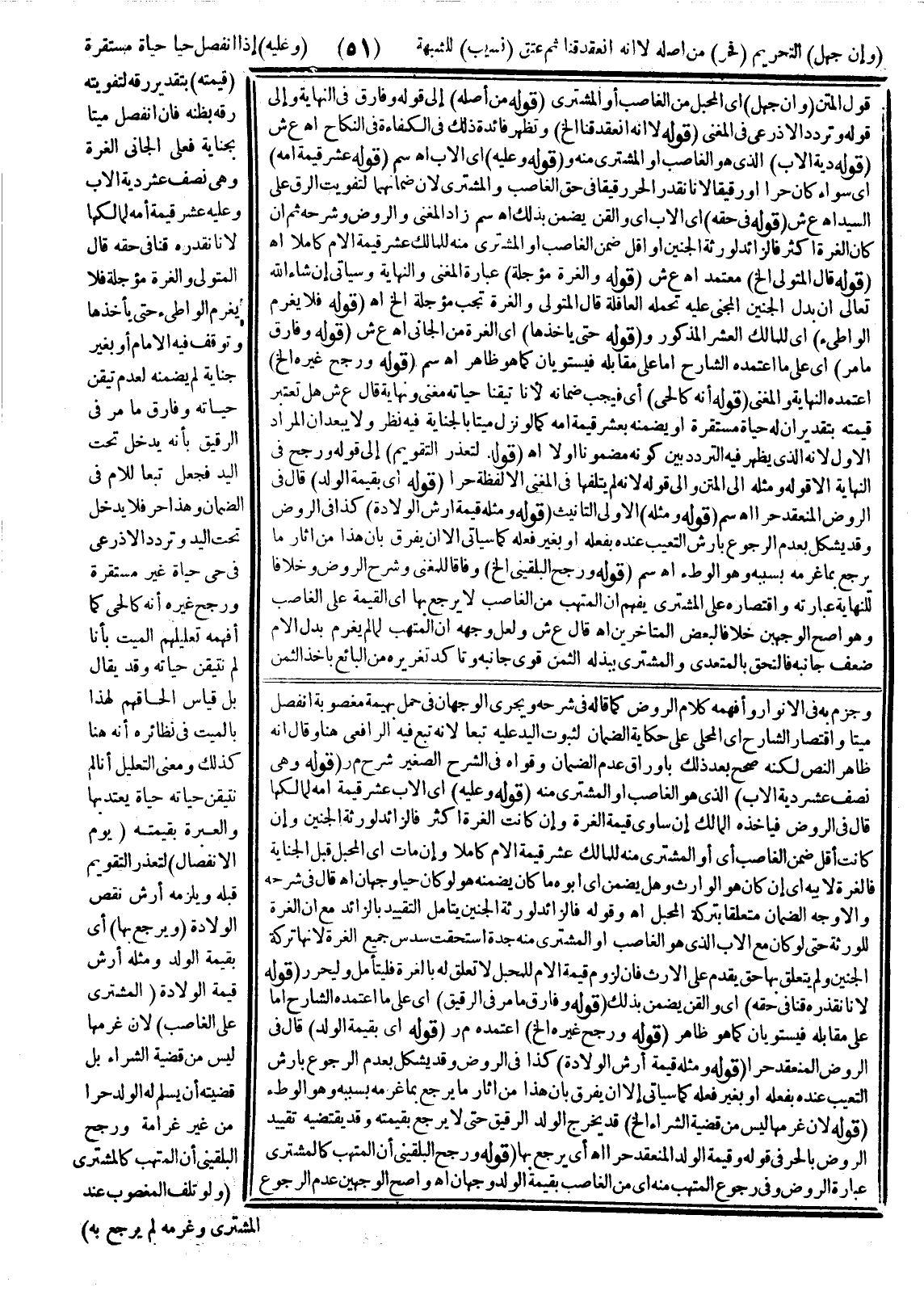 ـــــــــــــــــــــــــــــSوَجَزَمَ بِهِ فِي الْأَنْوَارِ وَأَفْهَمَهُ كَلَامُ الرَّوْضِ كَمَا قَالَهُ فِي شَرْحِهِ وَيَجْرِي الْوَجْهَانِ فِي حَمْلِ بَهِيمَةٍ مَغْصُوبَةٍ انْفَصَلَ مَيِّتًا وَاقْتِصَارُ الشَّارِحِ أَيْ الْمَحَلِّيِّ عَلَى حِكَايَةِ الضَّمَانِ لِثُبُوتِ الْيَدِ عَلَيْهِ تَبَعًا؛ لِأَنَّهُ تَبِعَ فِيهِ الرَّافِعِيَّ هُنَا وَقَالَ إنَّهُ ظَاهِرُ النَّصِّ لَكِنَّهُ صَحَّحَ بَعْدَ ذَلِكَ بِأَوْرَاقٍ عَدَمِ الضَّمَانِ وَقَوَّاهُ فِي الشَّرْحِ الصَّغِيرِ شَرْحُ م ر (قَوْلُهُ وَهِيَ نِصْفُ عُشْرِ دِيَةِ الْأَبِ) الَّذِي هُوَ الْغَاصِبُ أَوْ الْمُشْتَرِي مِنْهُ (قَوْلُهُ: وَعَلَيْهِ) أَيْ الْأَبِ عُشْرُ قِيمَةِ أُمِّهِ لِمَالِكِهَا قَالَ فِي الرَّوْضِ فَيَأْخُذُهُ الْمَالِكُ إنْ سَاوَى قِيمَةَ الْغُرَّةِ، وَإِنْ كَانَتْ الْغُرَّةُ أَكْثَرَ فَالزَّائِدُ لِوَرَثَةِ الْجَنِينِ، وَإِنْ كَانَتْ أَقَلَّ ضَمِنَ الْغَاصِبُ أَيْ أَوْ الْمُشْتَرِي مِنْهُ لِلْمَالِكِ عُشْرَ قِيمَةِ الْأُمِّ كَامِلًا، وَإِنْ مَاتَ أَيْ الْمُحْبِلُ قَبْلَ الْجِنَايَةِ فَالْغُرَّةُ لِأَبِيهِ أَيْ إنْ كَانَ هُوَ الْوَارِثَ وَهَلْ يَضْمَنُ أَيْ أَبُوهُ مَا كَانَ يَضْمَنُهُ هُوَ لَوْ كَانَ حَيًّا وَجْهَانِ اهـ قَالَ فِي شَرْحِهِ وَالْأَوْجَهُ الضَّمَانُ مُتَعَلِّقًا بِتَرِكَةِ الْمُحْبِلِ. اهـ وَقَوْلُهُ فَالزَّائِدُ لِوَرَثَةِ الْجَنِينِ يُتَأَمَّلُ التَّقْيِيدُ بِالزَّائِدِ مَعَ أَنَّ الْغُرَّةَ لِلْوَرَثَةِ حَتَّى لَوْ كَانَ مَعَ الْأَبِ الَّذِي هُوَ الْغَاصِبُ أَوْ الْمُشْتَرِي مِنْهُ جَدَّةٌ اسْتَحَقَّتْ سُدُسَ جَمِيعِ الْغُرَّةِ؛ لِأَنَّهَا تَرِكَةُ الْجَنِينِ وَلَمْ يَتَعَلَّقْ بِهَا حَقٌّ يُقَدَّمُ عَلَى الْإِرْثِ فَإِنَّ لُزُومَ قِيمَةِ الْأُمِّ لِلْمُحْبَلِ لَا تَعَلُّقَ لَهُ بِالْغُرَّةِ فَلْيُتَأَمَّلْ وَلْيُحَرَّرْ.