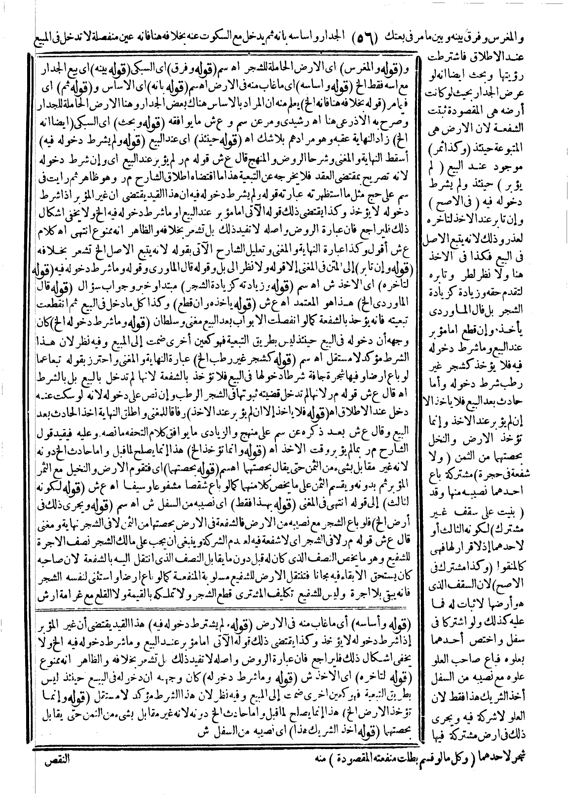 وَالْمَغْرِسِ وَفَرَّقَ بَيْنَهُ وَبَيْنَ مَا مَرَّ فِي بِعْتُك الْجِدَارَ وَأَسَاسَهُ بِأَنَّهُ ثَمَّ يَدْخُلُ مَعَ السُّكُوتِ عَنْهُ بِخِلَافِهِ هُنَا فَإِنَّهُ عَيْنٌ مُنْفَصِلَةٌ لَا تَدْخُلُ فِي الْمَبِيعِ عِنْدَ الْإِطْلَاقِ فَاشْتُرِطَتْ رُؤْيَتُهَا وَبَحَثَ أَيْضًا أَنَّهُ لَوْ عَرَضَ الْجِدَارَ بِحَيْثُ لَوْ كَانَتْ أَرْضُهُ هِيَ الْمَقْصُودَةُ ثَبَتَتْ الشُّفْعَةُ؛ لِأَنَّ الْأَرْضَ هِيَ الْمَتْبُوعَةُ حِينَئِذٍ (، وَكَذَا ثَمَرٌ) مَوْجُودٌ عِنْدَ الْبَيْعِ (لَمْ يُؤَبَّرْ) حِينَئِذٍ وَلَمْ يَشْرِطْ دُخُولَهُ فِيهِ (فِي الْأَصَحِّ) ، وَإِنْ تَأَبَّرَ عِنْدَ الْأَخْذِ لِتَأَخُّرِهِ لِعُذْرٍ وَذَلِكَ؛ لِأَنَّهُ يَتْبَعُ الْأَصْلَ فِي الْبَيْعِ فَكَذَا فِي الْأَخْذِ هُنَا وَلَا نَظَرَ لِطُرُوِّ تَأَبُّرِهِ لِتَقَدُّمِ حَقِّهِ وَزِيَادَتُهُ كَزِيَادَةِ الشَّجَرِ بَلْ قَالَ الْمَاوَرْدِيُّ يَأْخُذُهُ وَإِنْ قُطِعَ إمَّا مُؤَبَّرٌ عِنْدَ الْبَيْعِ وَمَا شُرِطَ دُخُولُهُ فِيهِ فَلَا يُؤْخَذُ كَشَجَرٍ غَيْرِ رَطْبٍ شُرِطَ دُخُولُهُ وَإِمَّا حَادِثٌ بَعْدَ الْبَيْعِ فَلَا يَأْخُذُهُ إنْ لَمْ يُؤَبَّرْ عِنْدَ الْأَخْذِ وَإِنَّمَا تُؤْخَذُ الْأَرْضُ وَالنَّخْلُ بِحِصَّتِهِمَا مِنْ الثَّمَنِ.