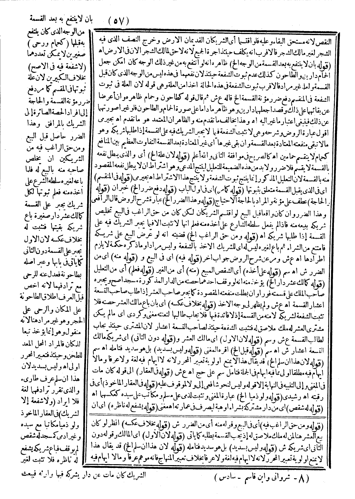 (قَوْلُهُ بِأَنْ لَا يَنْتَفِعَ بِهِ بَعْدَ الْقِسْمَةِ مِنْ الْوَجْهِ إلَخْ) ظَاهِرُهُ أَنَّهُ لَوْ انْتَفَعَ بِهِ مِنْ غَيْرِ ذَلِكَ الْوَجْهِ كَأَنْ أَمْكَنَ جَعْلُ الْحَمَّامِ دَارَيْنِ وَالطَّاحُونُ كَذَلِكَ عَدَمُ ثُبُوتِ الشُّفْعَةِ حِينَئِذٍ؛ لِأَنَّ نَفْعَهُمَا فِي هَذِهِ لَيْسَ مِنْ الْوَجْهِ الَّذِي كَانَ قَبْلَ الْقِسْمَةِ وَلَعَلَّهُ غَيْرُ مُرَادٍ فَالْأَقْرَبُ ثُبُوتُ الشُّفْعَةِ فِي هَذِهِ الْحَالَةِ أَخْذًا مِنْ الْعِلَّةِ وَهِيَ قَوْلُهُ؛ لِأَنَّ الْعِلَّةَ فِي ثُبُوتِ الشُّفْعَةِ فِي الْمُنْقَسِمِ دَفْعُ ضَرَرِ مُؤْنَةِ الْقِسْمَةِ إلَخْ قَالَهُ ع ش ثُمَّ قَالَ قَوْلُهُ كَطَاحُونٍ وَحَمَّامٍ ظَاهِرُهُ، وَإِنْ أَعْرَضَا عَنْ بَقَائِهِمَا عَلَى ذَلِكَ وَقَصَدَا جَعْلَهُمَا دَارَيْنِ وَهُوَ ظَاهِرٌ مَا دَامَا عَلَى صُورَةِ الْحَمَّامِ وَالطَّاحُونِ فَلَوْ غَيَّرَا صُورَتَهُمَا عَنْ ذَلِكَ فَيَنْبَغِي اعْتِبَارُ مَا غَيَّرَا إلَيْهِ. اهـ وَهَذَا يُخَالِفُ مَا تَقَدَّمَ مِنْهُ وَالظَّاهِرُ أَنَّ الْمُعْتَمَدَ هُوَ مَا تَقَدَّمَ. اهـ بُجَيْرِمِيٌّ أَقُولُ عِبَارَةُ الرَّوْضِ وَشَرْحِهِ وَهِيَ: لَا تَثْبُتُ الشُّفْعَةُ فِيمَا لَا يُجْبَرُ الشَّرِيكُ فِيهِ عَلَى الْقِسْمَةِ إذَا طَلَبَهَا شَرِيكُهُ وَهُوَ مَا لَا تَبْقَى مَنْفَعَتُهُ الْمُعْتَادَةُ بَعْدَ الْقِسْمَةِ، وَإِنْ بَقِيَ غَيْرُهَا أَيْ غَيْرُ الْمُعْتَادَةِ بَعْدَ الْقِسْمَةِ لِلتَّفَاوُتِ الْعَظِيمِ بَيْنَ الْمَنَافِعِ كَحَمَّامٍ لَا يَنْقَسِمُ حَمَّامَيْنِ. اهـ كَالصَّرِيحِ فِي مُوَافَقَةِ الثَّانِي وَاَللَّهُ أَعْلَمُ (قَوْلُهُ: لِأَنَّ عِلَّةَ إلَخْ) أَيْ وَاَلَّذِي يَبْطُلُ نَفْعُهُ بِالْقِسْمَةِ لَا يُقْسَمُ فَلَا ضَرَرَ وَلَا بُدَّ مِنْ هَذِهِ الضَّمِيمَةِ لِلتَّعْلِيلِ لِيُنْتَجَ الْمُدَّعَى وَهُوَ اشْتِرَاطُ أَنْ لَا يَبْطُلَ نَفْعُهُ الْمَقْصُودُ مِنْهُ بِالْقِسْمَةِ؛ لِأَنَّ التَّعْلِيلَ الْمَذْكُورَ إنَّمَا يُنْتِجُ ثُبُوتَ الشُّفْعَةِ وَلَا يُنْتِجُ هَذَا الِاشْتِرَاطَ. اهـ بُجَيْرِمِيٌّ (قَوْلُهُ فِي الْمُنْقَسِمِ) أَيْ فِي الَّذِي يَقْبَلُ الْقِسْمَةَ مُتَعَلِّقٌ بِثُبُوتِهَا (قَوْلُهُ كَمَا مَرَّ) أَيْ فِي أَوَّلِ الْبَابِ (قَوْلُهُ دَفْعُ ضَرَرٍ إلَخْ) خَبَرُ إنَّ (قَوْلُهُ وَالْحَاجَةِ) عُطِفَ عَلَى مُؤْنَةٍ وَالْمُرَادُ بِالْحَاجَةِ الِاحْتِيَاجُ (قَوْلُهُ وَهَذَا الضَّرَرُ إلَخْ) عِبَارَةُ شَرْحِ الرَّوْضِ قَالَ الرَّافِعِيُّ وَهَذَا الضَّرَرُ، وَإِنْ كَانَ وَاقِعًا قَبْلَ الْبَيْعِ لَوْ اقْتَسَمَ الشَّرِيكَانِ لَكِنْ كَانَ مِنْ حَقِّ الرَّاغِبِ فِي الْبَيْعِ تَخْلِيصُ شَرِيكِهِ بِبَيْعِهِ مِنْهُ فَإِذَا لَمْ يَفْعَلْ سَلَّطَهُ الشَّارِعُ عَلَى أَخْذِهِ مِنْهُ فَعَلِمَ أَنَّهَا لَا تَثْبُتُ إلَّا فِيمَا يُجْبَرُ الشَّرِيكُ فِيهِ عَلَى الْقِسْمَةِ إذَا طَلَبَهَا شَرِيكُهُ. اهـ.