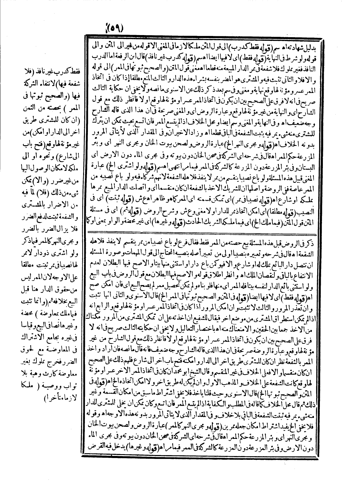 فَقَطْ كَدَرْبٍ غَيْرِ نَافِذٍ (فَلَا شُفْعَةَ فِيهَا) لِانْتِفَاءِ الشَّرِكَةِ فِيهَا (وَالصَّحِيحُ ثُبُوتُهَا فِي الْمَمَرِّ) بِحِصَّتِهِ مِنْ الثَّمَنِ (إنْ كَانَ لِلْمُشْتَرِي طَرِيقٌ آخَرُ إلَى الدَّارِ أَوْ أَمْكَنَ) مِنْ غَيْرِ مُؤْنَةٍ لَهَا وَقْعٌ (فُتِحَ بَابٌ إلَى شَارِعٍ) وَنَحْوُهُ أَوْ إلَى مِلْكِهِ لِإِمْكَانِ الْوُصُولِ إلَيْهَا مِنْ غَيْرِ ضَرَرٍ (وَإِلَّا) يُمْكِنُ شَيْءٌ مِنْ ذَلِكَ (فَلَا) لِمَا فِيهِ مِنْ الْإِضْرَارِ بِالْمُشْتَرِي وَالشُّفْعَةُ تَثْبُتُ لِدَفْعِ الضَّرَرِ فَلَا يُزَالُ الضَّرَرُ بِالضَّرَرِ وَمَجْرَى النَّهْرِ كَالْمَمَرِّ فِيمَا ذُكِرَ، وَلَوْ اشْتَرَى ذُو دَارٍ لَا مَمَرَّ لَهَا نَصِيبًا فِي مَمَرٍّ ثَبَتَتْ مُطْلَقًا عَلَى الْأَوْجَهِ؛ لِأَنَّ الْمَمَرَّ لَيْسَ مِنْ حُقُوقِ الدَّارِ هُنَا قَبْلَ الْبَيْعِ بِخِلَافِهِ