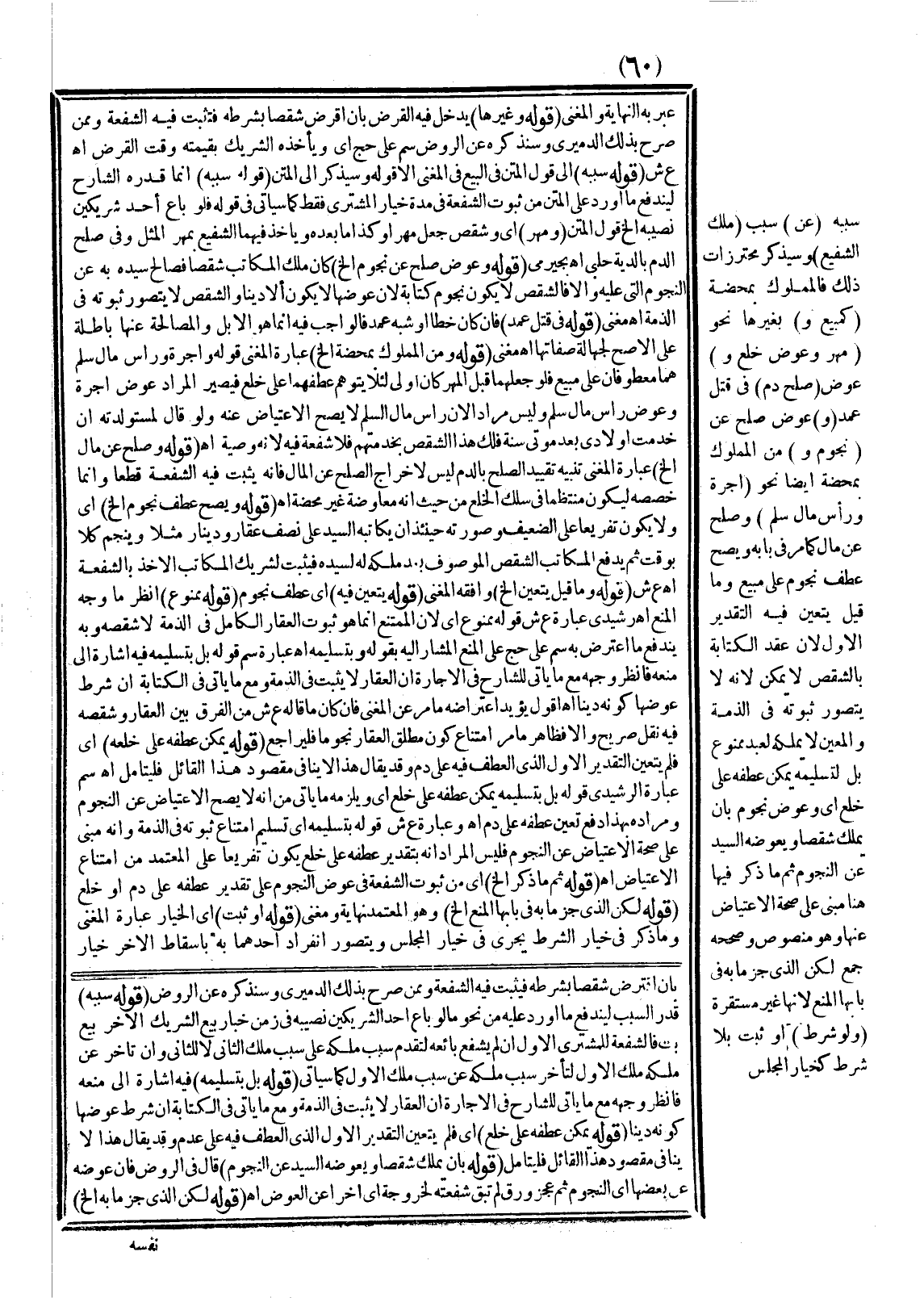 ـــــــــــــــــــــــــــــSبِأَنْ اقْتَرَضَ شِقْصًا بِشَرْطِهِ فَيَثْبُتُ فِيهِ الشُّفْعَةُ وَمِمَّنْ صَرَّحَ بِذَلِكَ الدَّمِيرِيِّ وَسَنَذْكُرُهُ عَنْ الرَّوْضِ (قَوْلُهُ سَبَبُهُ) قَدَّرَ السَّبَبَ لِيَنْدَفِعَ مَا أُورِدَ عَلَيْهِ مِنْ نَحْوِ مَا لَوْ بَاعَ أَحَدُ الشَّرِيكَيْنِ نَصِيبَهُ فِي زَمَنِ خِيَارِ بَيْعِ الشَّرِيكِ الْآخَرِ بَيْعَ بَتٍّ فَالشُّفْعَةُ لِلْمُشْتَرِي الْأَوَّلِ إنْ لَمْ يَشْفَعْ بَائِعُهُ لِتَقَدُّمِ سَبَبِ مِلْكِهِ عَلَى سَبَبِ مِلْكِ الثَّانِي لَا لِلثَّانِي وَإِنْ تَأَخَّرَ عَنْ مِلْكِهِ مِلْكُ الْأَوَّلِ لِتَأَخُّرِ سَبَبِ مِلْكِهِ عَنْ سَبَبِ مِلْكِ الْأَوَّلِ كَمَا سَيَأْتِي (قَوْلُهُ بَلْ بِتَسْلِيمِهِ) فِيهِ إشَارَةٌ إلَى مَنْعِهِ فَانْظُرْ وَجْهَهُ مَعَ مَا يَأْتِي لِلشَّارِحِ فِي الْإِجَارَةِ أَنَّ الْعَقَارَ لَا يَثْبُتُ فِي الذِّمَّةِ وَمَعَ مَا يَأْتِي فِي الْكِتَابَةِ أَنَّ شَرْطَ عِوَضِهَا كَوْنُهُ دَيْنًا (قَوْلُهُ يُمْكِنُ عَطْفُهُ عَلَى خُلْعٍ) أَيْ فَلَمْ يَتَعَيَّنْ التَّقْدِيرُ الْأَوَّلُ الَّذِي الْعَطْفُ فِيهِ عَلَى عَدَمٍ وَقَدْ يُقَالُ هَذَا لَا يُنَافِي مَقْصُودَ هَذَا الْقَائِلِ فَلْيُتَأَمَّلْ (قَوْلُهُ بِأَنْ يَمْلِكَ شِقْصًا وَيُعَوِّضَهُ السَّيِّدُ عَنْ النُّجُومِ) قَالَ فِي الرَّوْضِ فَإِنْ عَوَّضَهُ عَنْ بَعْضِهَا أَيْ النُّجُومِ ثُمَّ عَجَزَ وَرُقَّ لَمْ تَبْقَ شُفْعَتُهُ لِخُرُوجِهِ أَيْ آخِرًا عَنْ الْعِوَضِ. اهـ.