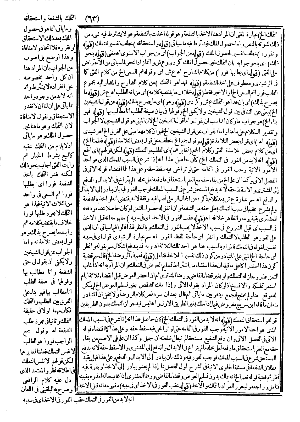 ثُمَّ رَأَيْت الْفَتَى أَجَابَ بِنَحْوِ ذَلِكَ لَكِنَّهُ فَسَّرَ التَّمَلُّكَ بِأَخْذِ الشُّفْعَةِ فَوْرًا أَيْ بِطَلَبِهَا فَوْرًا ثُمَّ السَّعْيِ فِي وَاحِدٍ مِنْ الثَّلَاثِ الْآتِيَةِ فَهَذَا هُوَ التَّمَلُّكُ لَا مُجَرَّدُ طَلَبِهَا فَوْرًا خِلَافُ مَا يَقْتَضِيهِ كَلَامُهُ ثُمَّ رَأَيْت مَا يُصَرِّحُ بِذَلِكَ وَهُوَ قَوْلُ بَعْضِ تَلَامِذَتِهِ وَأَمَّا الْجَوَابُ عَنْ قَوْلِ الشَّيْخَيْنِ وَلَا يَكْفِي أَنْ يَقُولَ لِي حَقُّ الشُّفْعَةِ وَأَنَا مُطَالِبٌ بِهَا وَقَوْلُهُمَا فِي صِفَةِ الطَّلَبِ أَنَا مُطَالِبٌ بِهَا فَهُوَ بِنَاءً عَلَى الْفَرْقِ بَيْنَ الطَّلَبِ وَالتَّمَلُّكِ فَكَلَامُهُمَا أَوَّلًا فِي حَقِيقَةِ التَّمَلُّكِ وَثَانِيًا فِي مُجَرَّدِ طَلَبِ الشُّفْعَةِ. اهـ وَقَوْلُ جَمْعٍ الْوَاجِبُ فَوْرًا هُوَ الطَّلَبُ لَا نَفْسُ التَّمَلُّكِ فَعَلِمْنَا تَغَايُرَهُمَا، لَكِنَّ قَوْلَهُمْ لَا نَفْسَ التَّمَلُّكِ فِي إطْلَاقِهِ نَظَرٌ وَالْمُعْتَمَدُ الَّذِي دَلَّ عَلَيْهِ كَلَامُ الرَّافِعِيِّ وَصَرَّحَ بِهِ الْبُلْقِينِيُّ فِي اللِّعَانِ أَنَّهُ لَا بُدَّ مِنْ الْفَوْرِ فِي التَّمَلُّكِ عَقِبَ الْفَوْرِ فِي الْأَخْذِ أَيْ فِي سَبَبِهِ