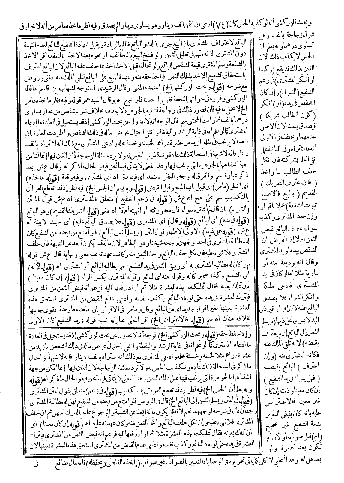 وَبَحَثَ الزَّرْكَشِيُّ أَنَّهُ لَوْ كَذَّبَهُ الْحِسُّ كَأَنْ ادَّعَى أَنَّ الثَّمَنَ أَلْفُ دِينَارٍ وَهُوَ يُسَاوِي دِينَارًا لَمْ يُصَدَّقْ وَفِيهِ نَظَرٌ مَأْخَذُهُ مَا مَرَّ مِنْ أَنَّهُ لَا خِيَارَ فِي شِرَاءِ زُجَاجَةٍ بِأَلْفٍ وَهِيَ تُسَاوِي دِرْهَمًا وَبِهِ يُعْلَمُ أَنَّ الْحِسَّ لَا يُكَذِّبُ ذَلِكَ؛ لِأَنَّ الْغَبْنَ بِذَلِكَ قَدْ يَقَعُ (، وَكَذَا لَوْ أَنْكَرَ الْمُشْتَرِي) فِي زَعْمِ الشَّفِيعِ (الشِّرَاءَ) ، وَإِنْ كَانَ الشِّقْصُ فِي يَدِهِ (أَوْ) أَنْكَرَ (كَوْنَ الطَّالِبِ شَرِيكًا) فَيُصَدَّقُ بِيَمِينِهِ؛ لِأَنَّ الْأَصْلَ عَدَمُهُمَا وَيَحْلِفُ فِي الْأُولَى أَنَّهُ مَا اشْتَرَاهُ وَفِي الثَّانِيَةِ عَلَى نَفْيِ الْعِلْمِ بِشَرِكَتِهِ فَإِنْ نَكَلَ حَلَفَ الطَّالِبُ بَتًّا وَأَخَذَ.