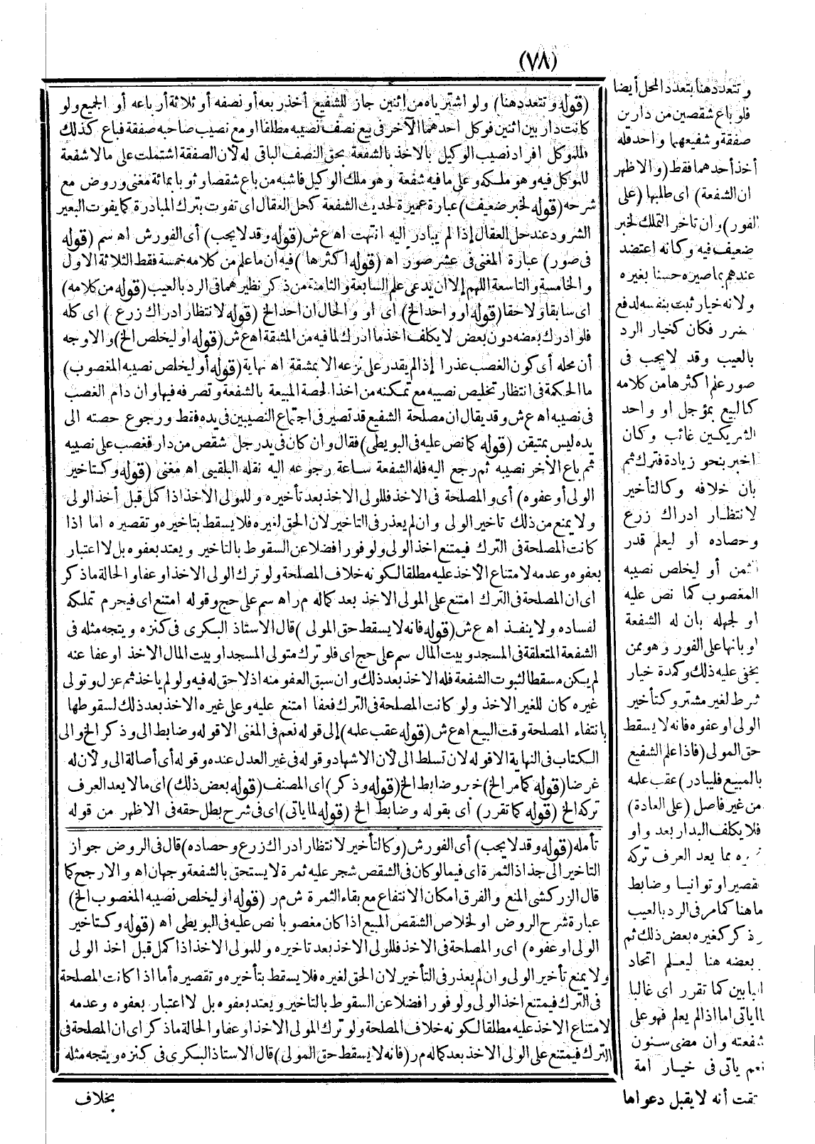 (قَوْلُهُ أَكْثَرُهَا) فِيهِ أَنَّ مَا عُلِمَ مِنْ كَلَامِهِ خَمْسَةٌ فَقَطْ الثَّلَاثَةُ الْأُوَلُ وَالْخَامِسَةُ وَالتَّاسِعَةُ اللَّهُمَّ إلَّا أَنْ يَدَّعِيَ عِلْمَ السَّابِعَةِ وَالثَّامِنَةِ مِنْ ذِكْرِ نَظِيرِهِمَا فِي الرَّدِّ بِالْعَيْبِ (قَوْلُهُ مِنْ كَلَامِهِ) أَيْ سَابِقًا وَلَاحِقًا (قَوْلُهُ أَوْ وَأَحَدُ إلَخْ) أَيْ أَوْ وَالْحَالُ أَنَّ أَحَدَ إلَخْ (قَوْلُهُ لِانْتِظَارِ إدْرَاكِ زَرْعٍ) أَيْ كُلِّهِ فَلَوْ أَدْرَكَ بَعْضَهُ دُونَ بَعْضٍ لَا يُكَلَّفُ أَخْذَ مَا أَدْرَكَ لِمَا فِيهِ مِنْ الْمَشَقَّةِ. اهـ ع ش (قَوْلُهُ أَوْ لِيُخَلِّصَ إلَخْ) وَالْأَوْجَهُ أَنَّ مَحَلَّهُ أَيْ كَوْنُ الْغَصْبِ عُذْرًا إذَا لَمْ يَقْدِرْ عَلَى نَزْعِهِ إلَّا بِمَشَقَّةٍ. اهـ نِهَايَةٌ (قَوْلُهُ أَوْ لِيُخَلِّصَ نَصِيبَهُ الْمَغْصُوبَ) مَا الْحِكْمَةُ فِي انْتِظَارِ تَخْلِيصِ نَصِيبِهِ مَعَ تَمَكُّنِهِ مِنْ أَخْذِ الْحِصَّةِ الْمَبِيعَةِ بِالشُّفْعَةِ وَتَصَرُّفِهِ فِيهَا، وَإِنْ دَامَ الْغَصْبُ فِي نَصِيبِهِ. اهـ ع ش وَقَدْ يُقَالُ إنَّ مَصْلَحَةَ الشَّفِيعِ قَدْ تَصِيرُ فِي اجْتِمَاعِ النَّصِيبَيْنِ فِي يَدِهِ فَقَطْ وَرُجُوعُ حِصَّتِهِ إلَى يَدِهِ لَيْسَ بِمُتَيَقَّنٍ.
