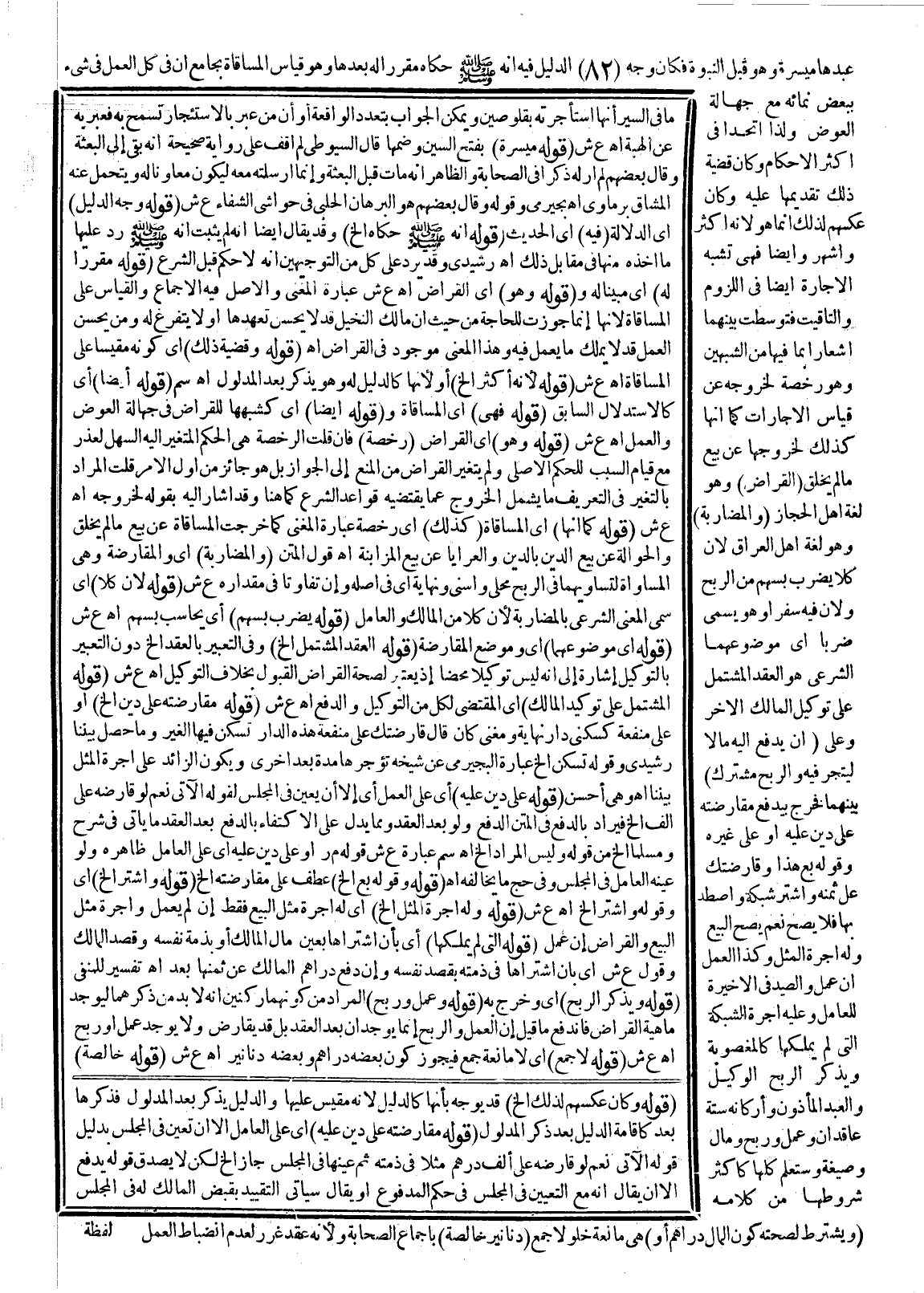 عَبْدَهَا مَيْسَرَةَ وَهُوَ قَبْلَ النُّبُوَّةِ» فَكَانَ وَجْهُ الدَّلِيلِ فِيهِ أَنَّهُ - صَلَّى اللَّهُ عَلَيْهِ وَسَلَّمَ - حَكَاهُ مُقَرِّرًا لَهُ بَعْدَهَا وَهُوَ قِيَاسُ الْمُسَاقَاةِ بِجَامِعِ أَنَّ فِي كُلٍّ الْعَمَلَ فِي شَيْءٍ بِبَعْضِ نَمَائِهِ مَعَ جَهَالَةِ الْعِوَضِ وَلِذَا اتَّحَدَا فِي أَكْثَرِ الْأَحْكَامِ وَكَانَ قَضِيَّةُ ذَلِكَ تَقْدِيمَهَا عَلَيْهِ وَكَانَ عَكْسُهُمْ لِذَلِكَ إنَّمَا هُوَ؛ لِأَنَّهُ أَكْثَرُ وَأَشْهَرُ وَأَيْضًا فَهِيَ تُشْبِهُ الْإِجَارَةَ أَيْضًا فِي اللُّزُومِ وَالتَّأْقِيتِ فَتَوَسَّطَتْ بَيْنَهُمَا إشْعَارًا بِمَا فِيهَا مِنْ الشَّبَهَيْنِ وَهُوَ رُخْصَةٌ لِخُرُوجِهِ عَنْ قِيَاسِ الْإِجَارَاتِ كَمَا أَنَّهَا كَذَلِكَ لِخُرُوجِهَا عَنْ بَيْعِ مَا لَمْ يُخْلَقْ (الْقِرَاضُ) وَهُوَ لُغَةُ أَهْلِ الْحِجَازِ (وَالْمُضَارَبَةُ) وَهُوَ لُغَةُ أَهْلِ الْعِرَاقِ؛ لِأَنَّ كُلًّا يَضْرِبُ بِسَهْمٍ مِنْ الرِّبْحِ وَلِأَنَّ فِيهِ سَفَرًا وَهُوَ يُسَمَّى ضَرْبًا أَيْ مَوْضُوعُهُمَا الشَّرْعِيُّ هُوَ الْعَقْدُ الْمُشْتَمِلُ عَلَى تَوْكِيلِ الْمَالِكِ الْآخَرَ وَعَلَى (أَنْ يَدْفَعَ إلَيْهِ مَالًا لِيَتَّجِرَ فِيهِ وَالرِّبْحُ مُشْتَرَكٌ) بَيْنَهُمَا فَخَرَجَ لِيَدْفَعَ مُقَارَضَتَهُ عَلَى دَيْنٍ عَلَيْهِ أَوْ عَلَى غَيْرِهِ وَقَوْلُهُ بِعْ هَذَا وَقَارَضْتُك عَلَى ثَمَنِهِ وَاشْتَرِ شَبَكَةً وَاصْطَدْ بِهَا فَلَا يَصِحُّ نَعَمْ يَصِحُّ الْبَيْعُ وَلَهُ أُجْرَةُ الْمِثْلِ، وَكَذَا الْعَمَلُ إنْ عَمِلَ وَالصَّيْدُ فِي الْأَخِيرَةِ لِلْعَامِلِ وَعَلَيْهِ أُجْرَةُ الشَّبَكَةِ الَّتِي لَمْ يَمْلِكْهَا كَالْمَغْصُوبَةِ وَيَذْكُرُ الرِّبْحَ الْوَكِيلُ وَالْعَبْدُ الْمَأْذُونُ وَأَرْكَانُهُ سِتَّةٌ عَاقِدَانِ وَعَمَلٌ وَرِبْحٌ وَمَالٌ وَصِيغَةٌ وَسَتَعْلَمُ كُلَّهَا كَأَكْثَرِ شُرُوطِهَا مِنْ كَلَامِهِ.