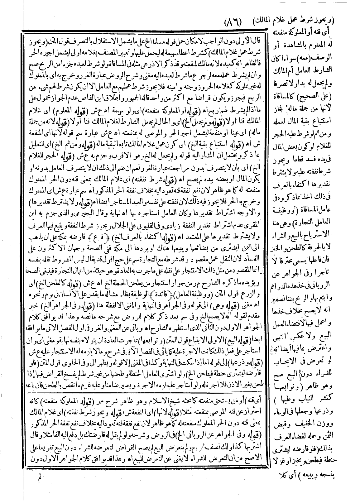 ـــــــــــــــــــــــــــــQقَالَ الْأَوْلَى دُونَ الْوَاجِبِ لِإِمْكَانِ حَمْلِ قَوْلِهِ مُسَلَّمًا إلَخْ عَلَى مَا يَشْمَلُ الِاسْتِقْلَالَ بِالتَّصَرُّفِ قَوْلُ الْمَتْنِ: (وَيَجُوزُ شَرْطُ عَمَلِ غُلَامِ الْمَالِكِ) كَشَرْطِ إعْطَاءِ بَهِيمَةٍ لَهُ لِيَحْمِلَ عَلَيْهَا، وَتَعْبِيرُ الْمُصَنِّفِ بِغُلَامِهِ أَوْلَى لِيَشْمَلَ أَجِيرَهُ الْحُرَّ فَالظَّاهِرُ أَنَّهُ كَعَبْدِهِ؛ لِأَنَّهُ مَالِكٌ لِمَنْفَعَتِهِ وَقَدْ ذَكَرَ الْأَذْرَعِيُّ مِثْلَهُ فِي الْمُسَاقَاةِ، وَلَوْ شَرَطَ لِعَبْدِهِ جُزْءًا مِنْ الرِّبْحِ صَحَّ، وَإِنْ لَمْ يَشْرِطْ عَمَلَهُ مَعَهُ لِرُجُوعِ مَا شَرَطَ لِعَبْدِهِ إلَيْهِ مُغْنِي وَشَرْحُ الرَّوْضِ عِبَارَةُ الْغُرَرِ وَخَرَجَ بِهِ أَيْ بِالْمَمْلُوكِ لَهُ غَيْرُ مَمْلُوكِهِ كَغُلَامِهِ الْحُرِّ وَزَوْجَتِهِ وَأَمِينِهِ فَلَا يَجُوزُ شَرْطُ عَمَلِهِمْ مَعَ الْعَامِلِ إلَّا أَنْ يَكُونَ شُرِطَ لَهُمْ شَيْءٌ مِنْ الرِّبْحِ فَيَجُوزُ وَيَكُونُ قِرَاضًا مَعَ أَكْثَرِ مِنْ وَاحِدٍ قَالَهُ الْجُمْهُورُ وَإِطْلَاقُ ابْنِ الْقَاصِّ عَدَمَ الْجَوَازِ مَحْمُولٌ عَلَى مَا إذَا لَمْ يُشْتَرَطْ لَهُمْ رِبْحٌ. اهـ