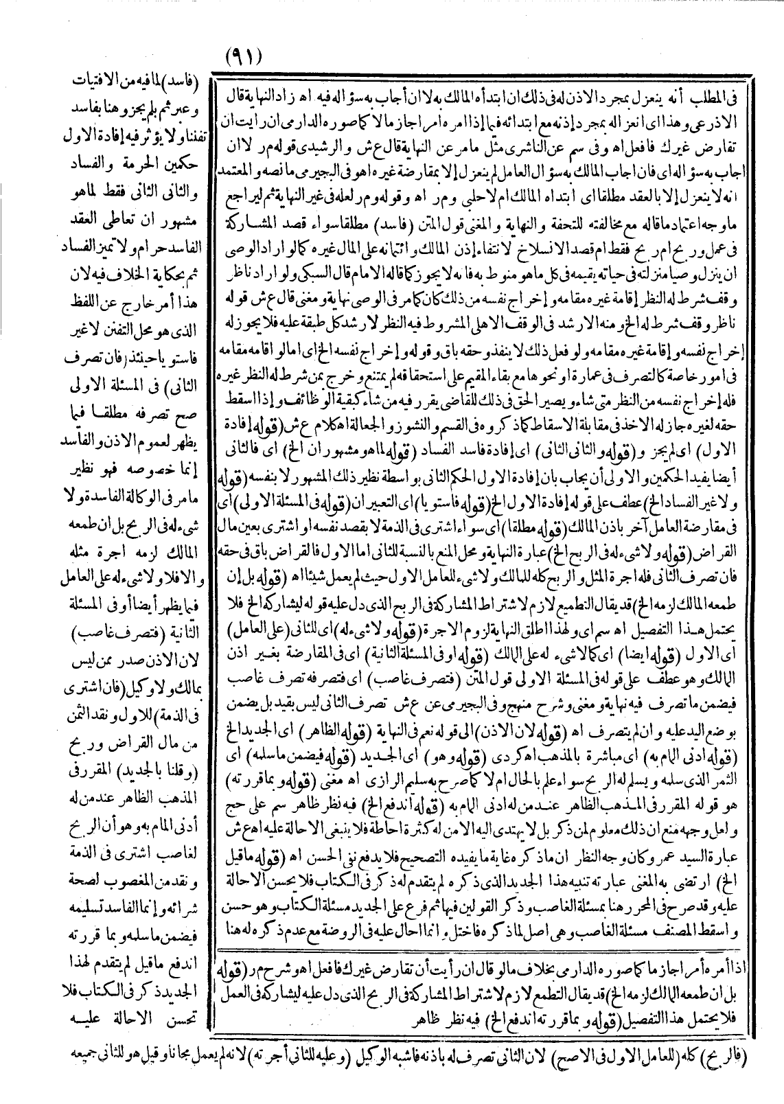 وَفِي الْبُجَيْرَمِيِّ مَا نَصُّهُ وَالْمُعْتَمَدُ أَنَّهُ لَا يَنْعَزِلُ إلَّا بِالْعَقْدِ مُطْلَقًا أَيْ ابْتَدَأَهُ الْمَالِكُ أَمْ لَا حَلَبِيٌّ وَم ر اهـ وَقَوْلُهُ وم ر لَعَلَّهُ فِي غَيْرِ النِّهَايَةِ ثُمَّ لِيُرَاجَعْ مَا وَجْهُ اعْتِمَادِ مَا قَالَهُ مَعَ مُخَالَفَتِهِ لِلتُّحْفَةِ وَالنِّهَايَةِ وَالْمُغْنِي قَوْلُ الْمَتْنِ (فَاسِدٌ) مُطْلَقًا سَوَاءٌ قَصَدَ الْمُشَارَكَةَ فِي عَمَلٍ وَرِبْحٍ أَمْ رِبْحٍ فَقَطْ أَمْ قَصَدَ الِانْسِلَاخَ لِانْتِفَاءِ إذْنِ الْمَالِكِ وَائْتِمَانِهِ عَلَى الْمَالِ غَيْرَهُ كَمَا لَوْ أَرَادَ الْوَصِيُّ أَنْ يُنَزِّلَ وَصِيًّا مَنْزِلَتَهُ فِي حَيَاتِهِ يُقِيمُهُ فِي كُلِّ مَا هُوَ مَنُوطٌ بِهِ فَإِنَّهُ لَا يَجُوزُ كَمَا قَالَهُ الْإِمَامُ قَالَ السُّبْكِيُّ، وَلَوْ أَرَادَ نَاظِرُ وَقْفٍ شُرِطَ لَهُ النَّظَرُ إقَامَةَ غَيْرِهِ مَقَامَهُ وَإِخْرَاجَ نَفْسِهِ مِنْ ذَلِكَ كَانَ كَمَا مَرَّ فِي الْوَصِيِّ نِهَايَةٌ وَمُغْنِي قَالَ ع ش قَوْلُهُ نَاظِرُ وَقْفٍ شَرَطَ لَهُ إلَخْ وَمِنْهُ الْأَرْشَدُ فِي الْوَقْفِ الْأَهْلِيِّ الْمَشْرُوطِ فِيهِ النَّظَرُ لِأَرْشَدِ كُلِّ طَبَقَةٍ عَلَيْهِ فَلَا يَجُوزُ لَهُ إخْرَاجُ نَفْسِهِ وَإِقَامَةُ غَيْرِهِ مَقَامَهُ، وَلَوْ فَعَلَ ذَلِكَ لَا يَنْفُذُ وَحَقُّهُ بَاقٍ وَقَوْلُهُ وَإِخْرَاجَ نَفْسِهِ إلَخْ أَيْ أَمَّا لَوْ أَقَامَهُ مَقَامَهُ فِي أُمُورٍ خَاصَّةٍ كَالتَّصَرُّفِ فِي عِمَارَةٍ أَوْ نَحْوِهَا مَعَ بَقَاءِ الْمُقِيمِ عَلَى اسْتِحْقَاقِهِ لَمْ يَمْتَنِعْ وَخَرَجَ بِمَنْ شُرِطَ لَهُ النَّظَرُ غَيْرُهُ فَلَهُ إخْرَاجُ نَفْسِهِ مِنْ النَّظَرِ مَتَى شَاءَ وَيَصِيرُ الْحَقُّ فِي ذَلِكَ لِلْقَاضِي يُقَرِّرُ فِيهِ مَنْ شَاءَ كَبَقِيَّةِ الْوَظَائِفِ وَإِذَا أَسْقَطَ حَقَّهُ لِغَيْرِهِ جَازَ لَهُ الْأَخْذُ فِي مُقَابَلَةِ الْإِسْقَاطِ كَمَا ذَكَرُوهُ فِي الْقَسْمِ وَالنُّشُوزِ وَالْجَعَالَةِ. اهـ كَلَامُ ع ش