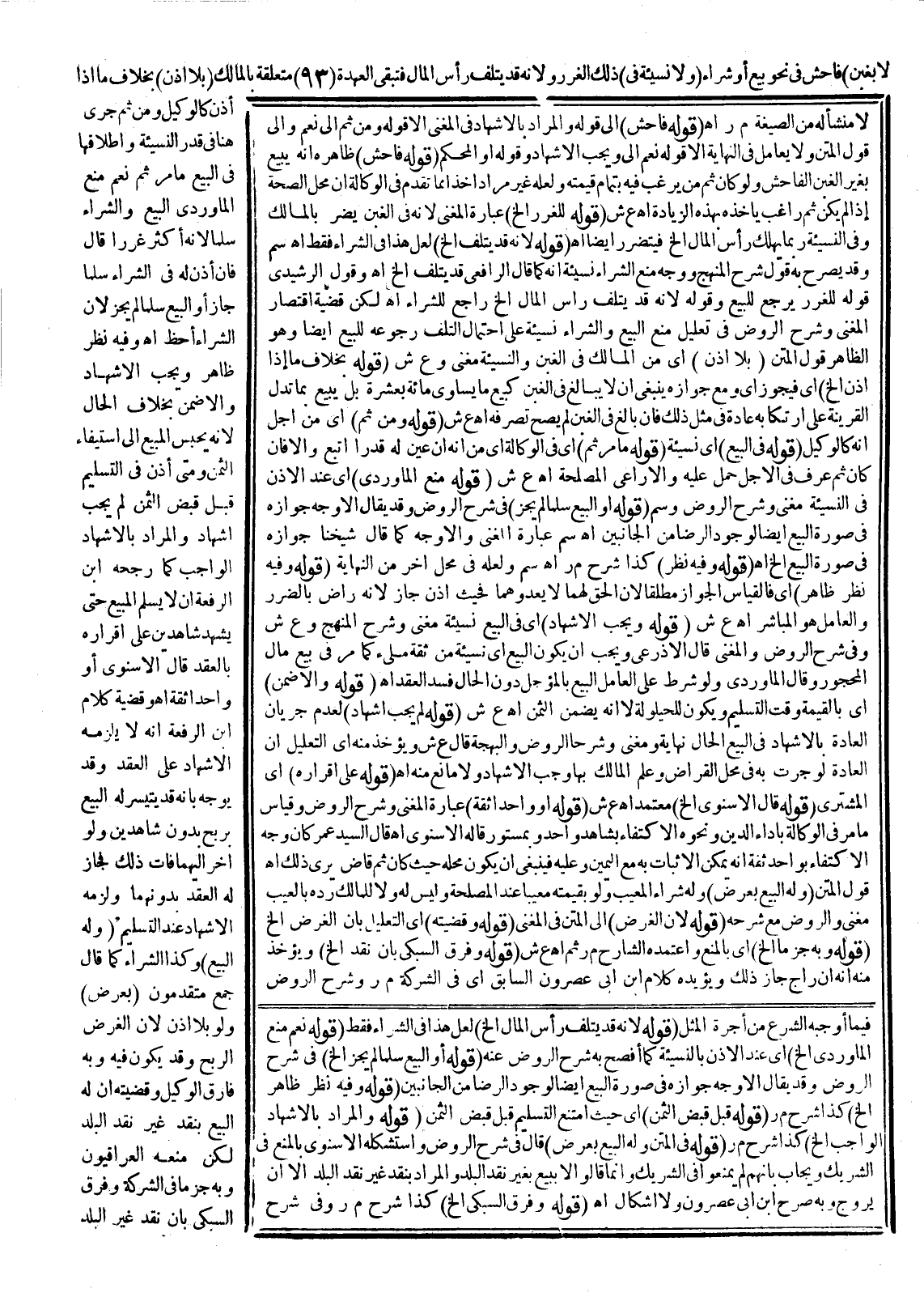 ـــــــــــــــــــــــــــــSفِيمَا أَوْجَبَهُ الشَّرْعُ مِنْ أُجْرَةِ الْمِثْلِ (قَوْلُهُ؛ لِأَنَّهُ قَدْ يُتْلِفُ رَأْسَ الْمَالِ إلَخْ) لَعَلَّ هَذَا فِي الشِّرَاءِ فَقَطْ (قَوْلُهُ نَعَمْ مَنَعَ الْمَاوَرْدِيُّ إلَخْ) أَيْ عِنْدَ الْإِذْنِ بِالنَّسِيئَةِ كَمَا أَفْصَحَ بِهِ شَرْحُ الرَّوْضِ عَنْهُ (قَوْلُهُ أَوْ الْبَيْعِ سَلَمًا لَمْ يَجُزْ إلَخْ) فِي شَرْحِ الرَّوْضِ وَقَدْ يُقَالُ الْأَوْجَهُ جَوَازُهُ فِي صُورَةِ الْبَيْعِ أَيْضًا لِوُجُودِ الرِّضَا مِنْ الْجَانِبَيْنِ (قَوْلُهُ وَفِيهِ نَظَرٌ ظَاهِرٌ إلَخْ) كَذَا شَرْحُ م ر (قَوْلُهُ قَبْلَ قَبْضِ الثَّمَنِ) أَيْ حَيْثُ امْتَنَعَ التَّسْلِيمُ قَبْلَ قَبْضِ الثَّمَنِ (قَوْلُهُ وَالْمُرَادُ بِالْإِشْهَادِ الْوَاجِبِ إلَخْ) كَذَا شَرْحُ م ر.
