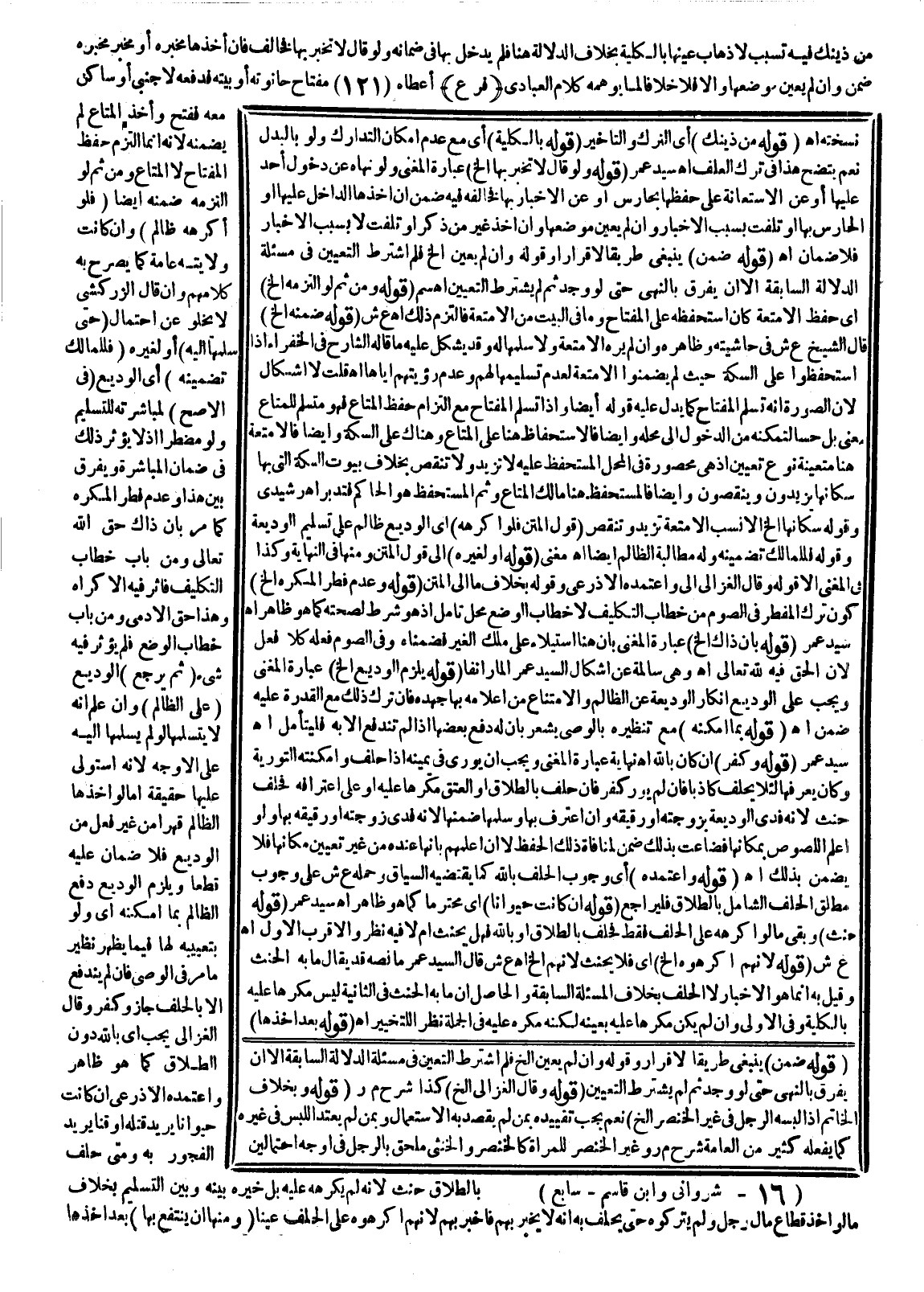 مِنْ ذَلِكَ وَيُؤْخَذُ مِنْهُ أَنَّ الْعُذْرَ هُنَا لَيْسَ هُوَ الْآتِي فِي التَّأْخِيرِ بَعْدَ الطَّلَبِ؛ لِأَنَّ هَذَا أَضْيَقُ فَلْيَكُنْ الْمُرَادُ بِالْعُذْرِ فِيهِ الضَّرُورِيَّ، أَوْ الْقَرِيبَ مِنْهُ، وَلَوْ قَالَ لَهُ وَقَدْ أَعْطَاهَا لَهُ فِي الْبَيْتِ احْفَظْهَا فِي الْبَيْتِ فَخَرَجَ بِهَا، أَوْ لَمْ يَخْرُجْ وَرَبَطَهَا فِي نَحْوِ كُمِّهِ مَعَ إمْكَانِ حِفْظِهَا فِي نَحْوِ صُنْدُوقٍ ضَمِنَ بِخِلَافِ مَا إذَا لَمْ يَجِدْ مِفْتَاحَهُ مَثَلًا لَا إنْ شَاهَدَهَا مِمَّا يَلِي أَضْلَاعَهُ أَيْ وَلَمْ يَكُنْ التَّلَفُ فِي زَمَنِ الْخُرُوجِ بِسَبَبِ الْمُخَالَفَةِ كَمَا بَحَثَهُ الْأَذْرَعِيُّ؛ لِأَنَّ هَذَا أَحْرَزُ مِنْ الْبَيْتِ فَإِنْ لَمْ يَقُلْ شَيْئًا جَازَ لَهُ أَنْ يَخْرُجَ بِهَا مَرْبُوطَةً كَمَا أَشْعَرَ بِهِ كَلَامُهُمْ قَالَهُ الرَّافِعِيُّ.