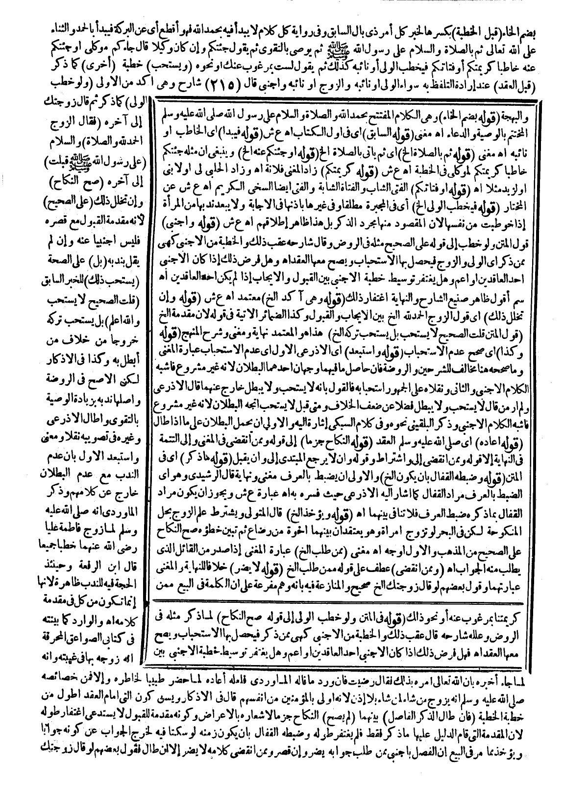 فِيهِ الْخِلَافُ وَلِجَوَابِ الْخِطْبَةِ حُكْمُهَا فِي التَّفْصِيلِ الْمَذْكُورِ ثُمَّ التَّصْرِيحُ مَا يَقْطَعُ بِالرَّغْبَةِ فِي النِّكَاحِ كَإِذَا انْقَضَتْ عِدَّتُك نَكَحْتُك وَالتَّعْرِيضُ مَا يَحْتَمِلُ ذَلِكَ وَعَدَمُهُ كَأَنْتِ جَمِيلَةٌ، مَنْ يَجِدُ مِثْلَك، إنَّ اللَّهَ سَائِقٌ إلَيْك خَيْرًا، لَا تَبْقِ أَيِّمًا، رُبَّ رَاغِبٍ فِيك، وَكَذَا إنِّي رَاغِبٌ فِيك كَمَا نَقَلَهُ الْإِسْنَوِيُّ عَنْ حَاصِلِ كَلَامِ الْأُمِّ وَاعْتَمَدَهُ، وَهُوَ بِالْجِمَاعِ كَعِنْدِي جِمَاعُ مَرَضٍ وَأَنَا قَادِرٌ عَلَى جِمَاعِك مُحَرَّمٌ بِخِلَافِ التَّعْرِيضِ بِهِ فِي غَيْرِ نَحْوِ هَذِهِ الصُّورَةِ فَإِنَّهُ مَكْرُوهٌ وَعَلَيْهِ حَمَلُوا نَقْلَ الرَّوْضَةِ عَنْ الْأَصْحَابِ كَرَاهَتَهُ وَنَحْوَ الْكِتَابَةِ، وَهِيَ الدَّلَالَةُ عَلَى الشَّيْءِ بِذِكْرِ لَازِمِهِ قَدْ تُفِيدُ مَا يُفِيدُهُ الصَّرِيحُ كَأُرِيدُ أَنْ أُنْفِقَ عَلَيْهِ نَفَقَةَ الزَّوْجَاتِ وَأَتَلَذَّذُ بِك فَتَحْرُمُ وَقَدْ لَا فَيَكُونُ تَعْرِيضًا كَذِكْرِ ذَلِكَ مَا عَدَا وَأَتَلَذَّذُ بِك وَكَوْنُ الْكِنَايَةِ أَبْلَغُ مِنْ الصَّرِيحِ بِاتِّفَاقِ الْبُلَغَاءِ وَغَيْرِهِمْ إنَّمَا هُوَ لِمَلْحَظٍ يُنَاسِبُ تَدْقِيقَهُمْ الَّذِي لَا يُرَاعِيهِ الْفَقِيهُ وَإِنَّمَا يُرَاعِي مَا دَلَّ عَلَيْهِ التَّخَاطُبُ الْعُرْفِيُّ وَمِنْ ثَمَّ افْتَرَقَ الصَّرِيحُ هُنَا وَثَمَّ