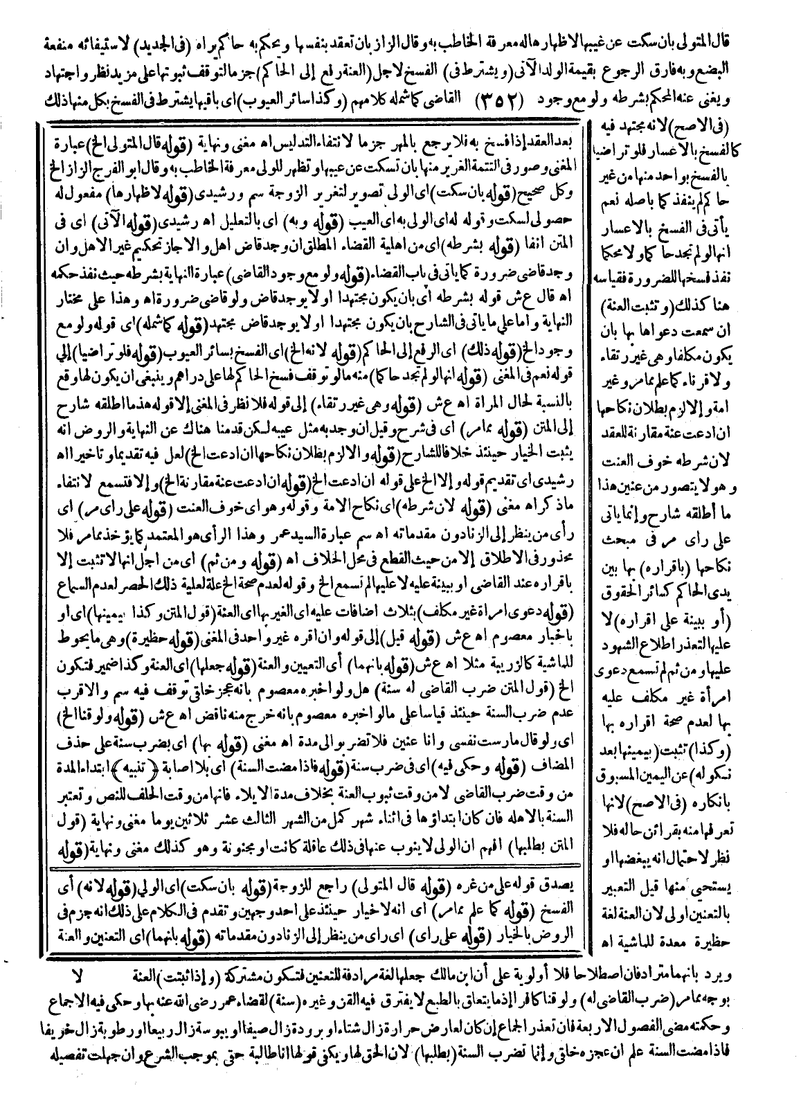 وَمَا ذَكَرَهُ بَعْدَهُ الْوَاقِعُ فِي كَلَامِهِمْ مُجَرَّدُ تَصْوِيرٍ قَالَ الْإِسْنَوِيُّ وَكَمَا يُخَيَّرُ بِذَلِكَ فَكَذَلِكَ تَتَخَيَّرُ هِيَ بِكِبَرِ آلَتِهِ بِحَيْثُ يُفْضِي كُلَّ مَوْطُوءَةٍ (أَوْ قَرْنَاءَ) أَيْ مُنْسَدًّا ذَلِكَ مِنْهَا بِعَظْمٍ (أَوْ وَجَدَتْهُ) وَهُوَ بَالِغٌ عَاقِلٌ (عِنِّينًا) أَيْ بِهِ دَاءٌ يَمْنَعُ انْتِشَارَ ذَكَرِهِ عَنْ قُبُلِهَا وَإِنْ قَدَرَ عَلَى غَيْرِهَا أَوْ عَلِمَتْهُ قَبْلَ النِّكَاحِ مِنْ عَنَّ أَعْرَضَ أَوْ شُبِّهَ بِعِنَانِ الدَّابَّةِ لِلِينِهِ (أَوْ مَجْبُوبًا) أَيْ مَقْطُوعًا ذَكَرُهُ أَوْ إلَّا دُونَ قَدْرِ الْحَشَفَةِ أَيْ حَشَفَةِ ذَكَرِهِ أَخْذًا مِمَّا مَرَّ فِي التَّحْلِيلِ وَغَيْرِهِ فَإِنْ بَقِيَ قَدْرُهَا وَعَجَزَ عَنْ الْوَطْءِ بِهِ ضُرِبَتْ لَهُ الْمُدَّةُ الْآتِيَةُ كَالْعِنِّينِ (ثَبَتَ) لِلْكَارِهِ مِنْهُمَا الْجَاهِلِ بِالْعَيْبِ أَوْ الْعَالِمِ بِهِ إذَا انْتَقَلَ لِأَفْحَشَ مِنْهُ مَنْظَرًا كَأَنْ كَانَ بِالْيَدِ فَانْتَقَلَ لِلْوَجْهِ لَا لِلْيَدِ الْأُخْرَى وَإِنَّمَا نُزِعَ الرَّهْنُ بِزِيَادَةِ فِسْقِ الْمَوْضُوعِ تَحْتَ يَدِهِ وَإِنْ كَانَتْ مِنْ جِنْسِ الْأَوَّلِ كَأَنْ كَانَ يَزْنِي فِي الشَّهْرِ مَرَّةً فَصَارَ يَزْنِي فِيهِ مَرَّتَيْنِ كَمَا اقْتَضَاهُ إطْلَاقُهُمْ خِلَافًا لِمَنْ زَعَمَ أَنَّهُ لَا بُدَّ أَنْ يَزِيدَ مِنْ جِنْسٍ آخَرَ وَذَلِكَ لِأَنَّ الزِّيَادَةَ.